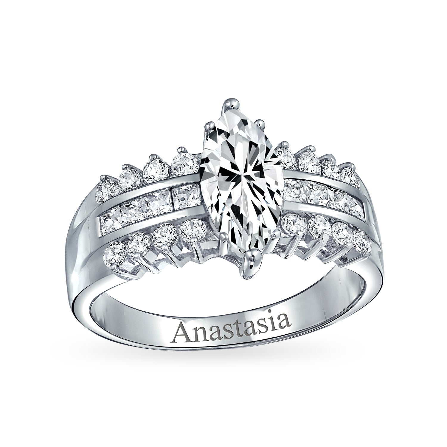 - Dazzle her with this exquisite sterling silver engagement ring, featuring a stunning marquise-cut 2 CT CZ stone, complemented by a triple row of radiant CZs on the band.