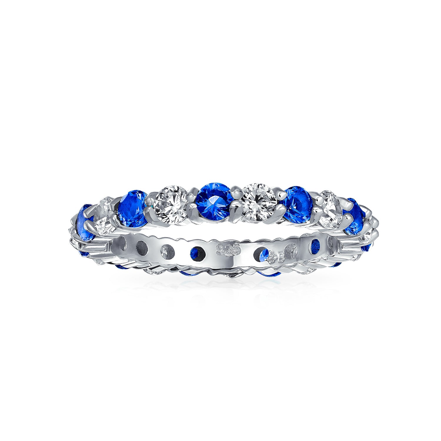 • Give her the gift of eternity this season with this beguiling Sterling Silver Blue Simulated Sapphire Color Cubic Zirconia Stackable eternity Ring. Introducing our blue Simulated Sapphire eternity band. Perfect for stacking, this Simulated Sapphire stackable ring features gorgeous shades of blue Simulated Sapphire linked with colorless cut cubic zirconia. This stackable Simulated Sapphire eternity ring is composed of sterling silver and rhodium plated to resist tarnish. Glitter like royalty every time you wear this blue Simulated Sapphire stackable eternity ring. This simply must have it right now sterling silver blue Simulated Sapphire color cubic zirconia stackable eternity ring makes a great gift for all the September birthdays as well as to your bridal party.