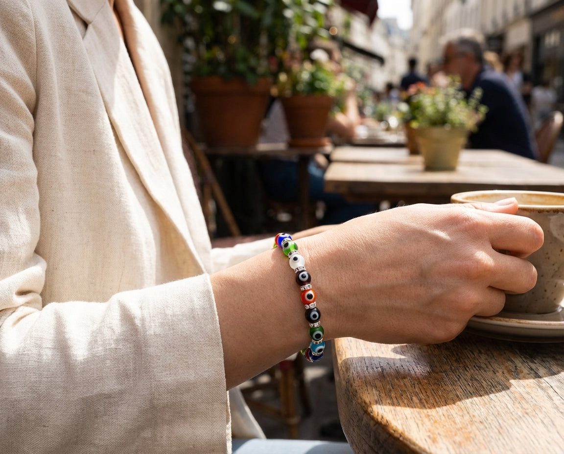 - All eyes will on you in this entrancing stretch beaded bracelet. Exuding mesmerizing spiritual style, it features black, evil eye beads alternating with shimmering crystal Rondelle spacers. Channel positive energy and elevate your style with this piece.
