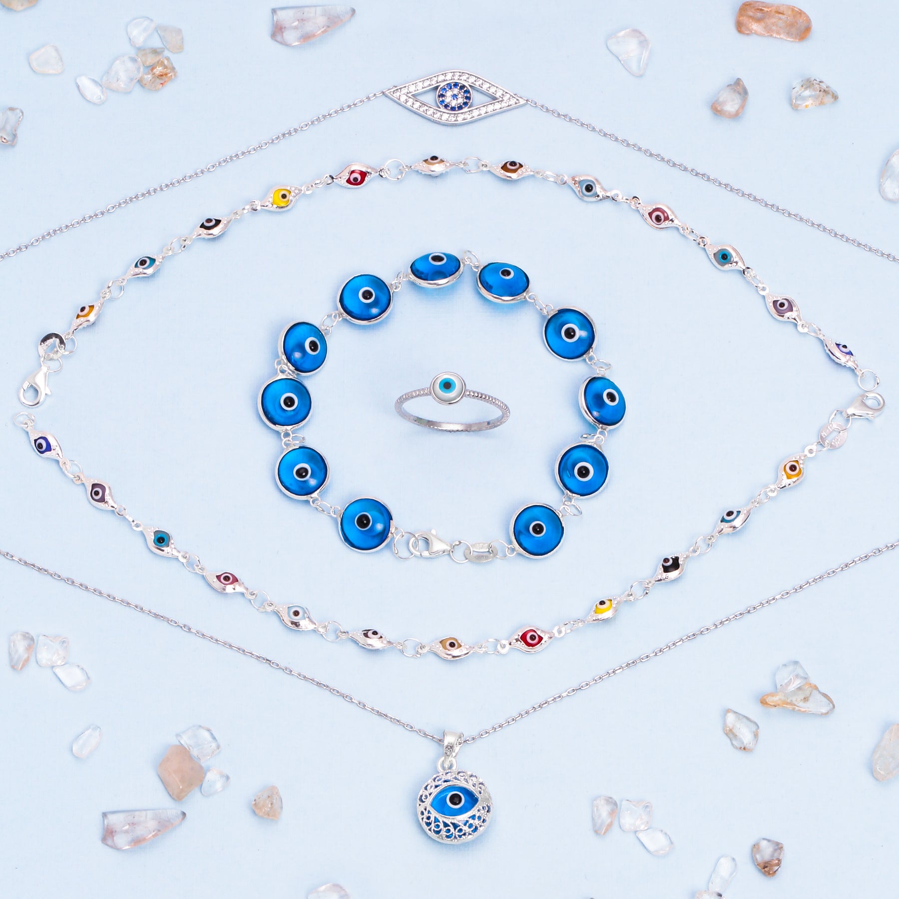 - Symbolism and style combine perfectly in this piece of sterling silver lucky jewelry, which features an evil eye made of mother of pearl.