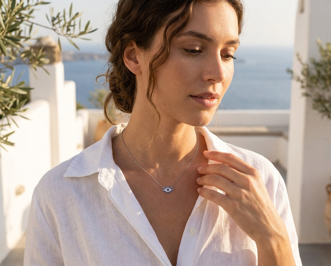 - Ward off bad juju with this charming evil eye necklace. Crafted from .925 Sterling Silver, it features blue and white Cubic Zirconia. This dainty evil eye design is a perfect good luck charm. Ideal gift for September birthdays, unique and fun. The evil eye symbolizes protection and good fortune. Don't miss out on this good luck pendant necklace. Purchase your own today!