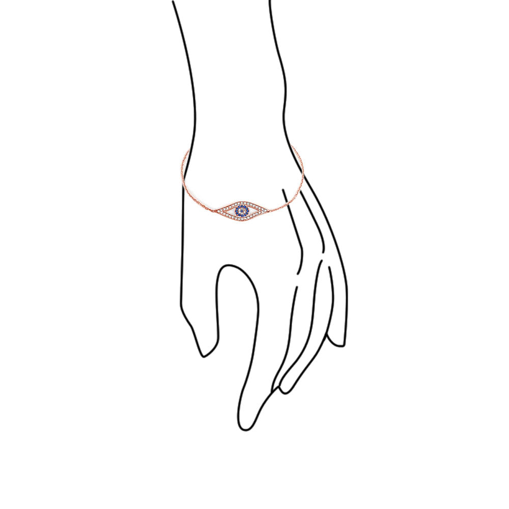 - Stay trendy with this stunning Evil Eye bracelet featuring Simulated Sapphire blue cubic zirconia in .925 sterling silver rose gold plated. The delicate link rolo chain with a spring ring clasp makes it perfect for any occasion. Ideal as a bat mitzvah gift, it complements any wardrobe without overshadowing it. The rose gold color is perfect for fall fashion trends. Evil eye fashion bracelets are a must-have for fashion-savvy women and make a fantastic birthday gift.