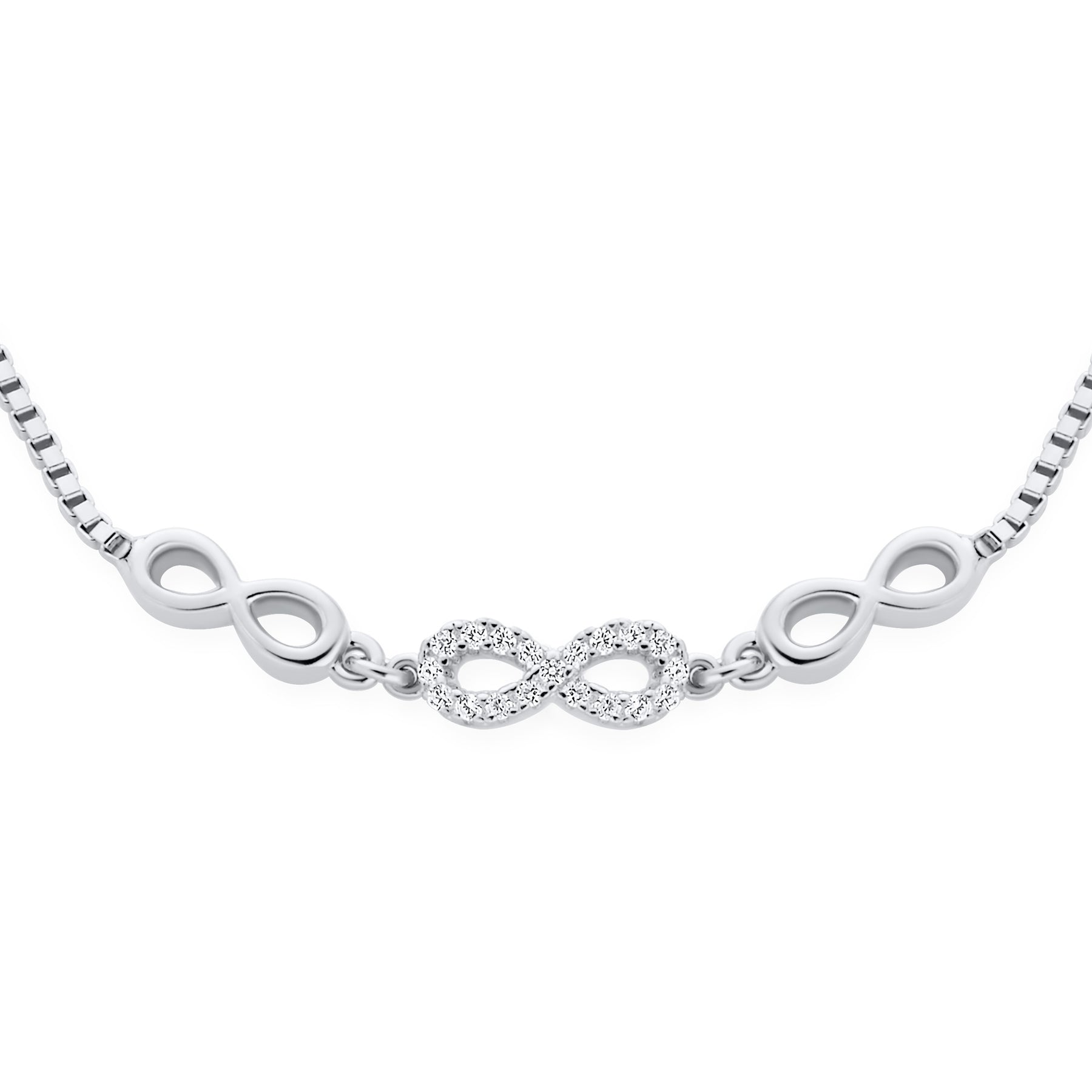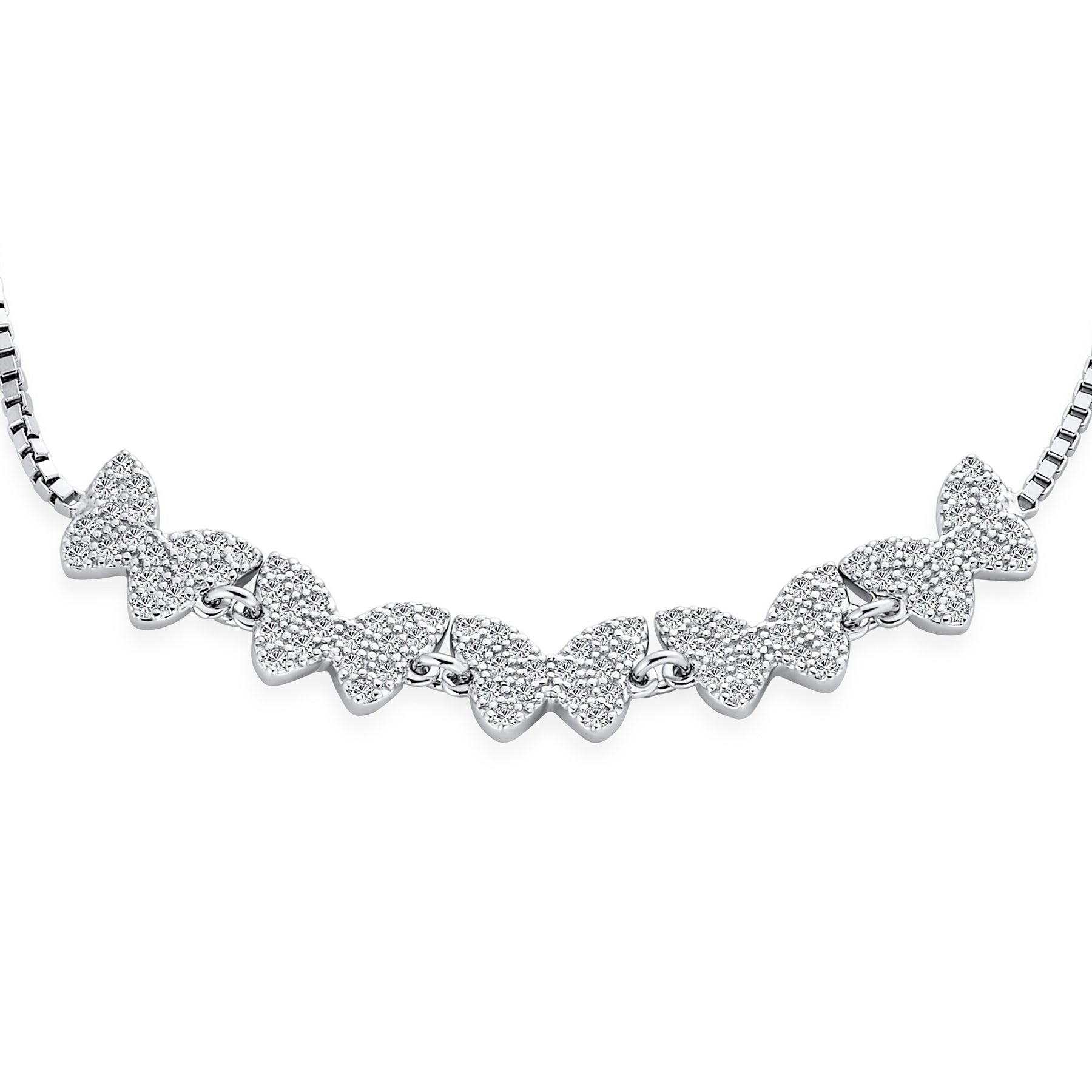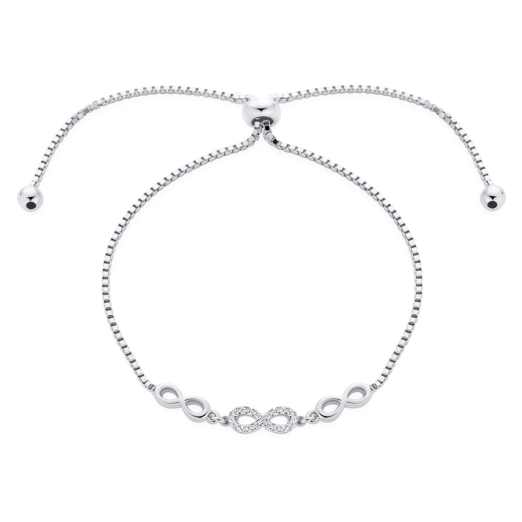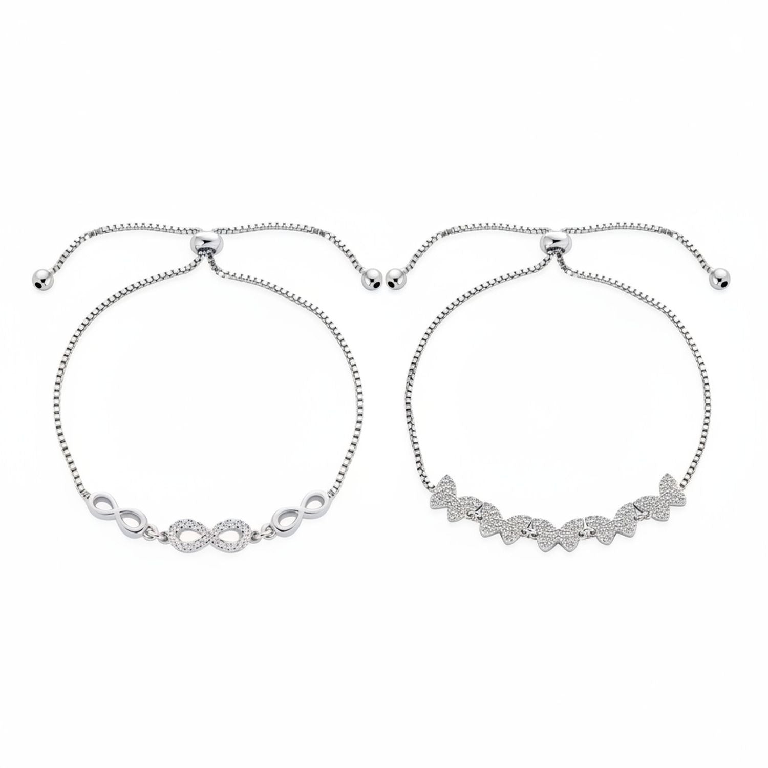 - Add sparkle and meaning to your style with this elegant .925 Sterling Silver Bolo Bracelet Set featuring a butterfly and infinity design. The butterfly bracelet symbolizes beauty and transformation, crafted with shimmering CZs on a rhodium-plated box chain, while the infinity bracelet represents everlasting love with triple infinity symbols, one adorned with CZ accents. Both adjustable for a perfect fit, these bracelets make thoughtful gifts for any occasion.