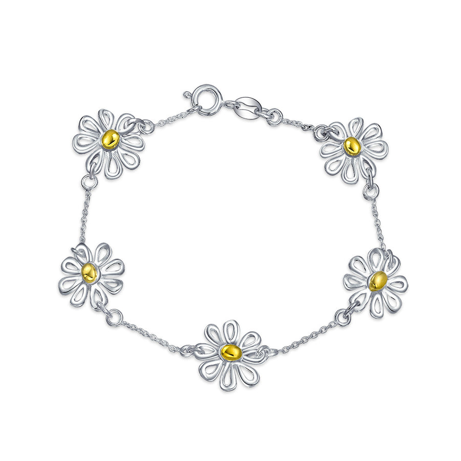 - Enhance your look with this charming sterling silver link bracelet, showcasing a radiant cutout daisy flower design with subtle gold-toned center accents. Perfectly pairs with our elegant flower jewelry collection.