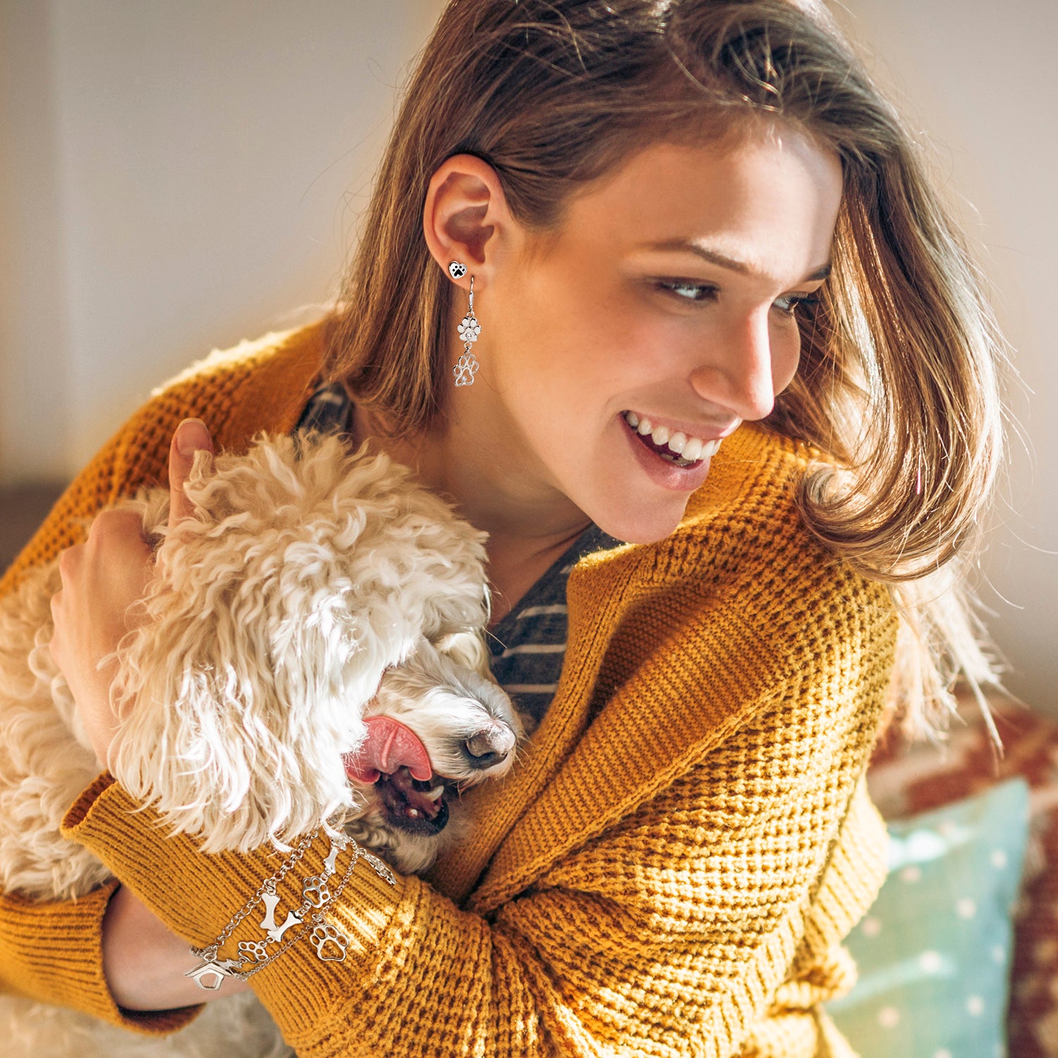 - Add some animal style to your look with these chic, double paw printed drop earrings. Featuring sparkling sterling silver and a cut out style, these long drop puppy dog earrings are a great gift for furry friend owners.
