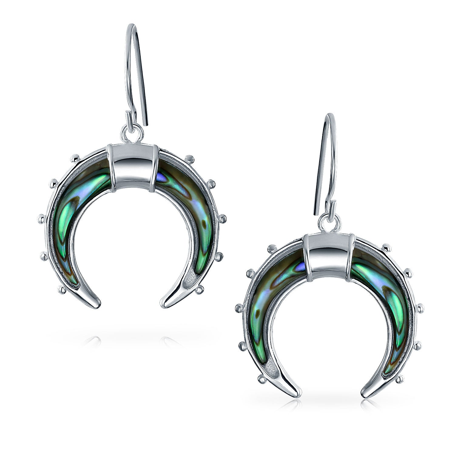 - These captivating .925 silver dangle earrings blend nautical style with a tribal twist. Highlighted by a crescent moon shape, with inlaid abalone accents. glistening with hypnotic blue and green swirls, and studded beads on outer trim for instant edge.