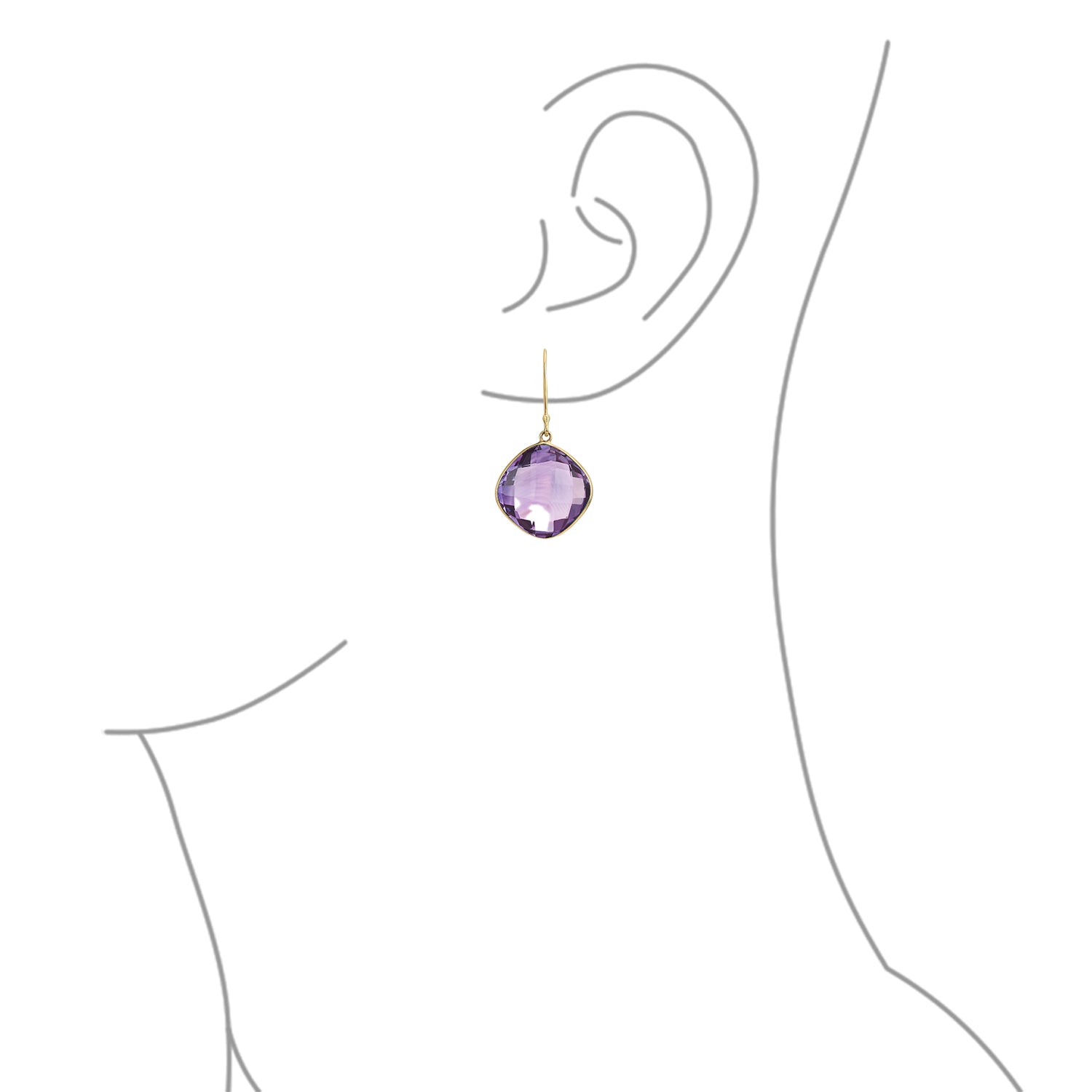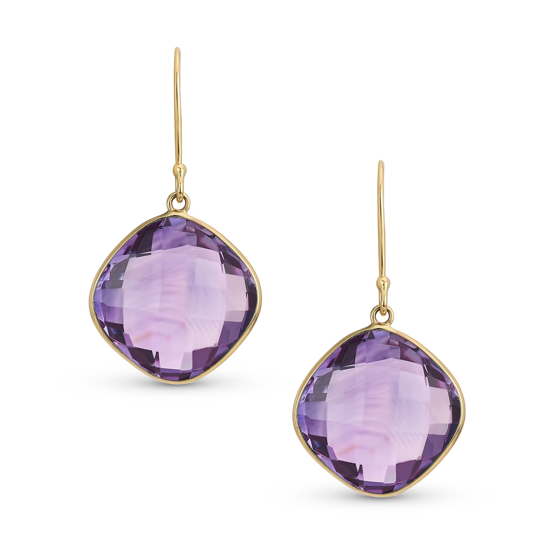 - Discover sophistication in these large but lightweight cushion cut square faceted purple Amethyst dangle earrings. Meticulously crafted with a thin-edged bezel setting, this natural gemstone blends effortlessly with any style, making them a must-have in your jewelry collection.
