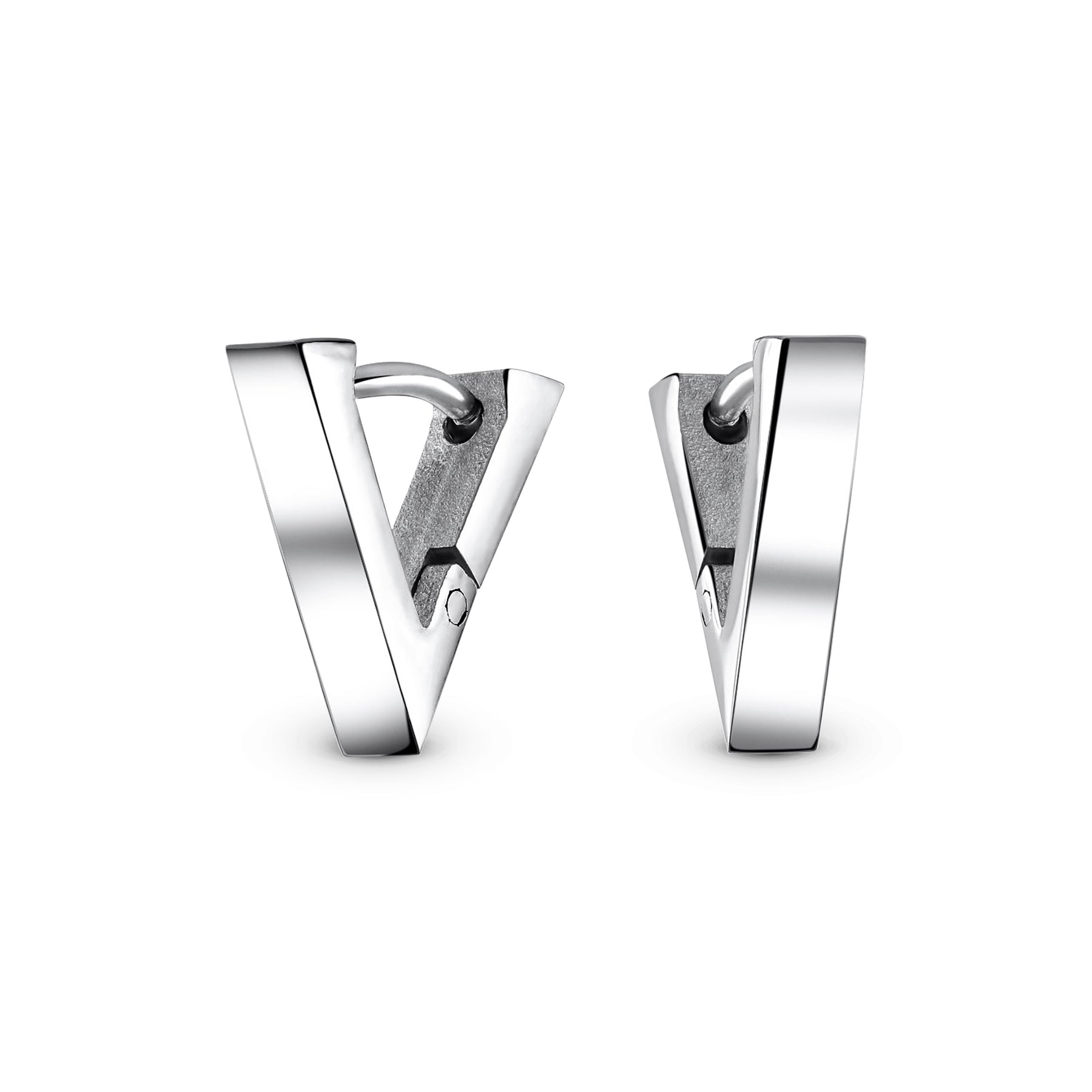 - For bold, geometric style with minimalist appeal, choose these striking stainless steel, unisex huggie hoop earrings. Featuring a sophisticated triangular shape in a modern design, they will add polish with a touch of edge to any ensemble.