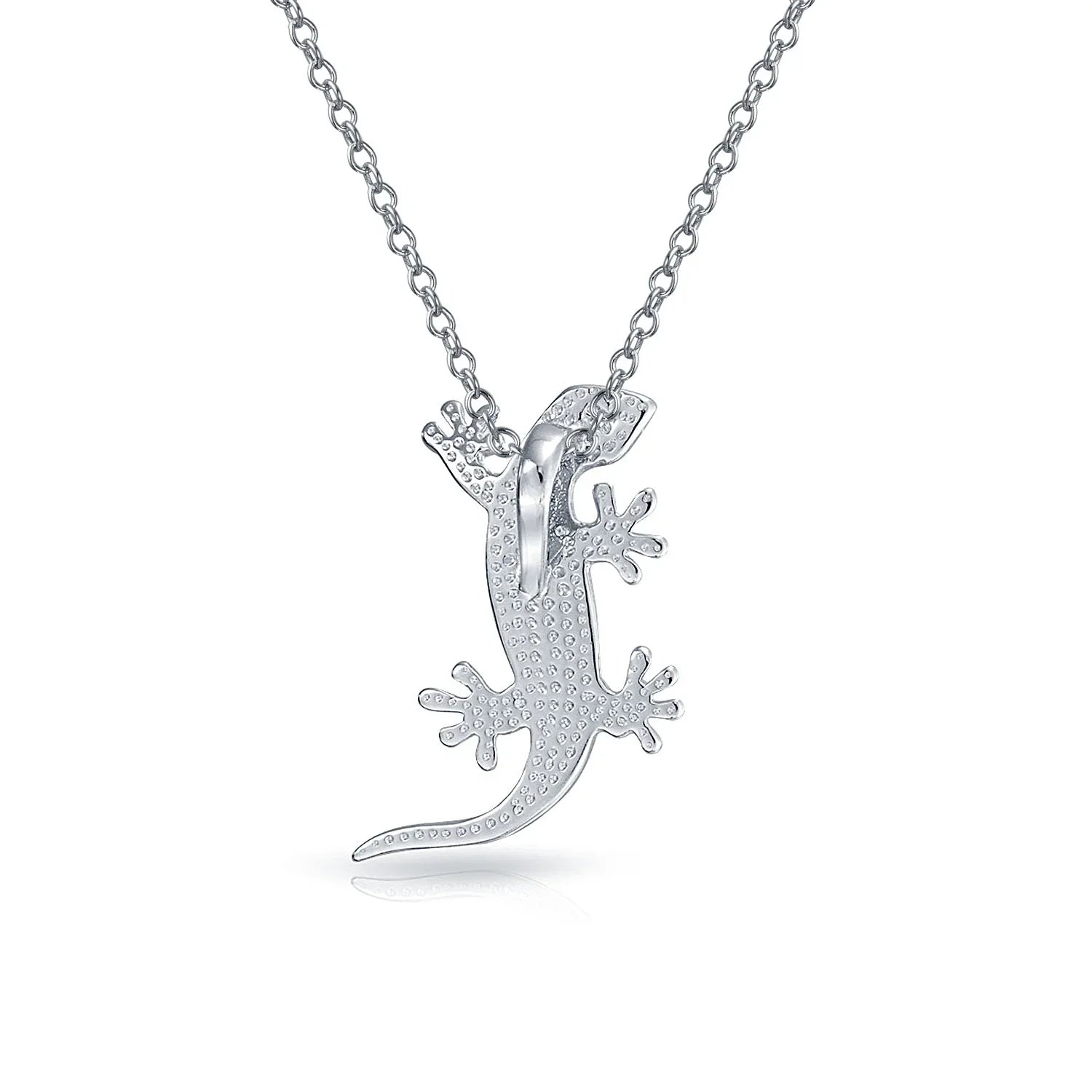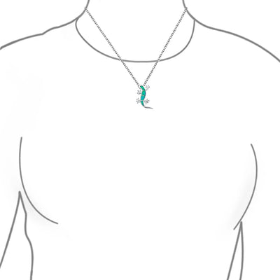 • This lizard pendant is a 1.38in pendant on an 18in chain. The geckos back and head are made of four squares of synthetic green opal inlay-ed against rhodium plating for a unique animal look.