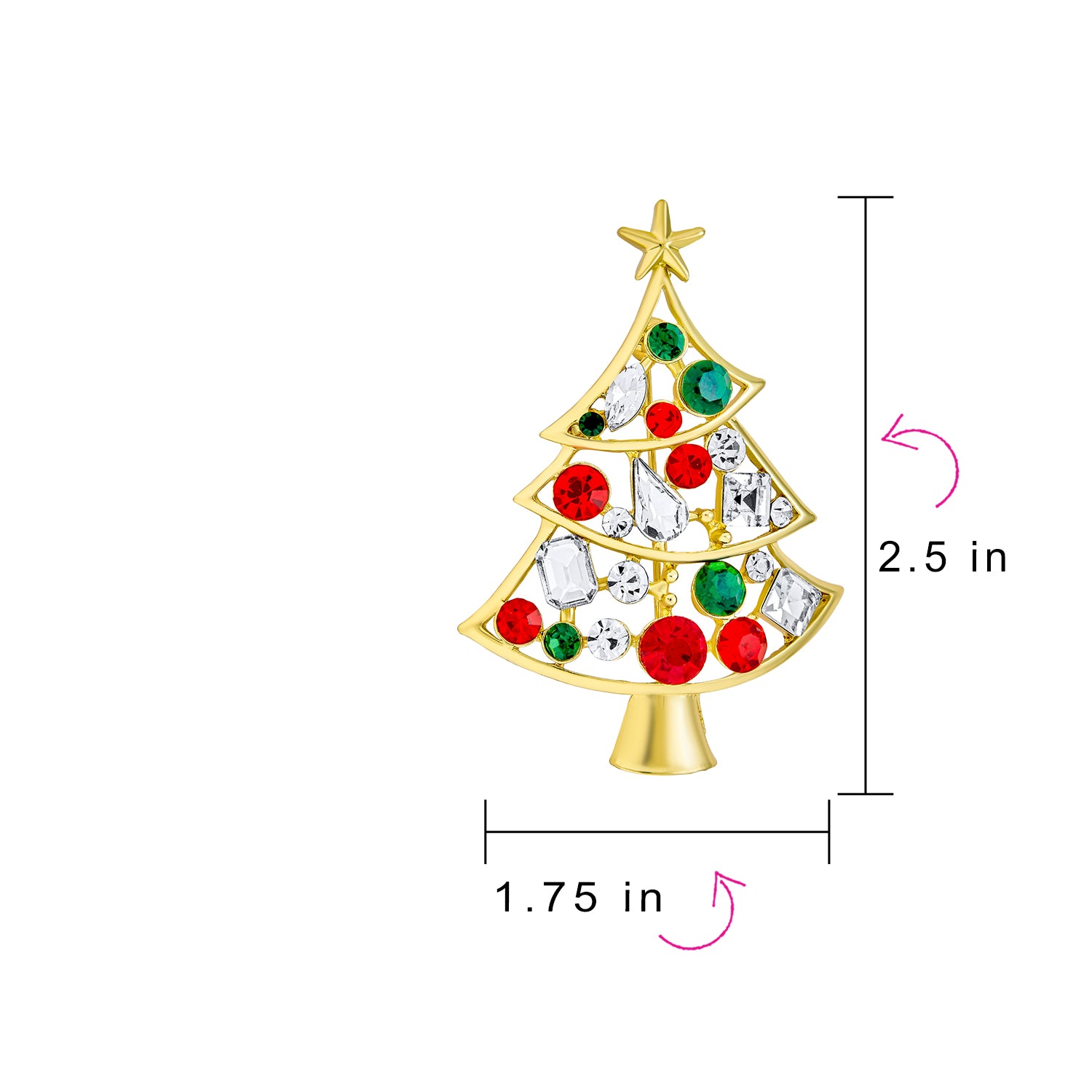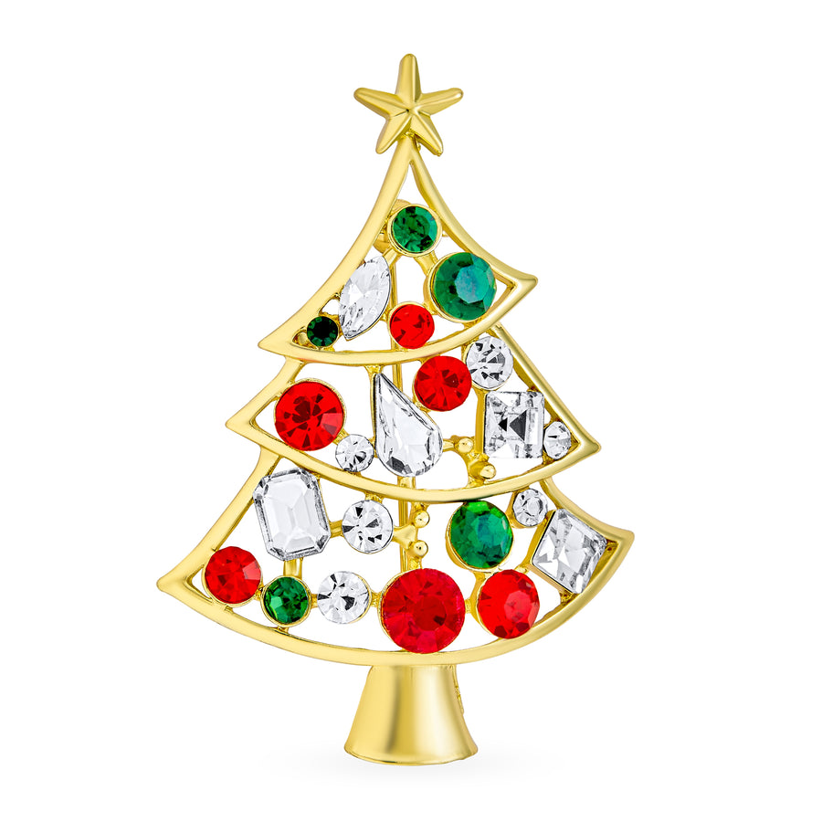 - Celebrate the festive season with our stunning Christmas Brooch. Featuring a detailed tree and star design with red, white, and green crystals. Crafted with shining gold-colored metal, it truly sparkles. Our Deco Style rating captures traditional Christmas colors and ornament-like crystals. Despite its intricate design, this 2.5-inch Brooch weighs only 13 grams. Lightweight and comfortable, perfect for cozy sweaters. Ideal for hosting holidays or as an enchanting gift. Treat yourself or surprise someone special with this elegant holiday jewelry.