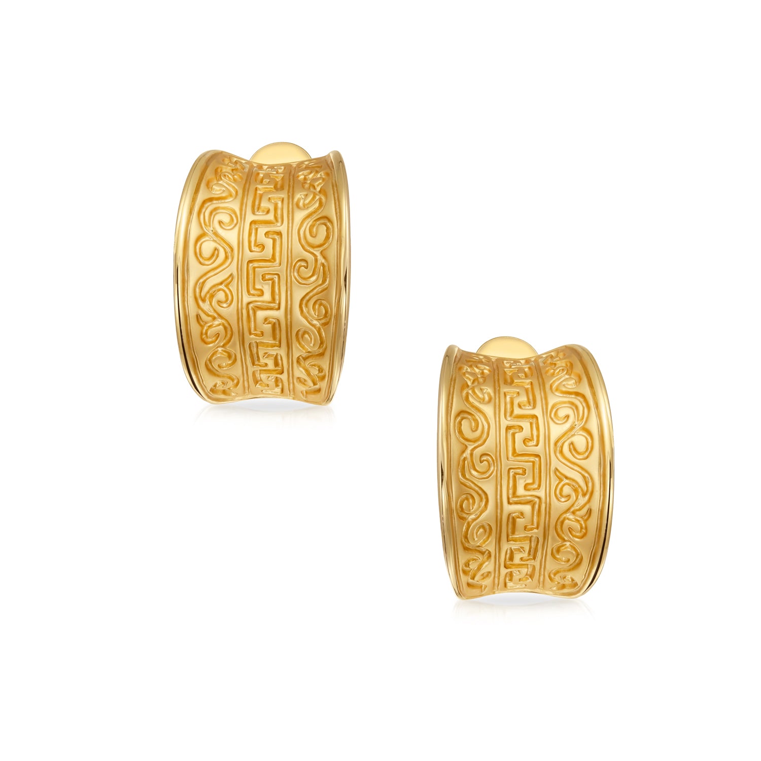 - Showcase your classic style with a unique twist! These gold-plated brass clip-on earrings add timeless elegance to any look. Featuring a stunning Greek motif design, they stand out on any occasion. The matte finish offers a distinguished muted shine. Measure: 19x13mm, Weight: 8.7 grams. Crafted from gold-plated brass, these geometric vintage drop earrings are perfect for formal events or evening wear. Ideal for non-pierced ears with a half-hoop style.