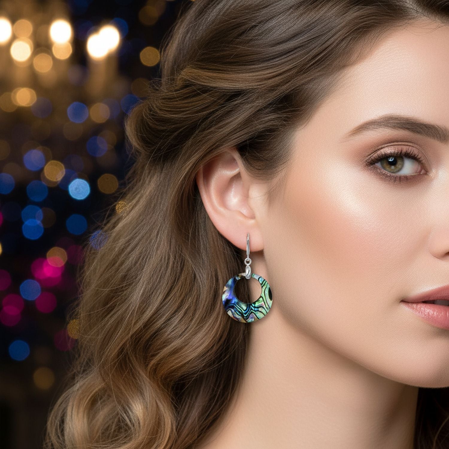 - Enhance your style with .925 sterling silver abalone round dangle hoop earrings. Perfect for summer, these earrings feature abalone shell detailing. Lever back design ensures comfort. Ideal gift for any occasion.