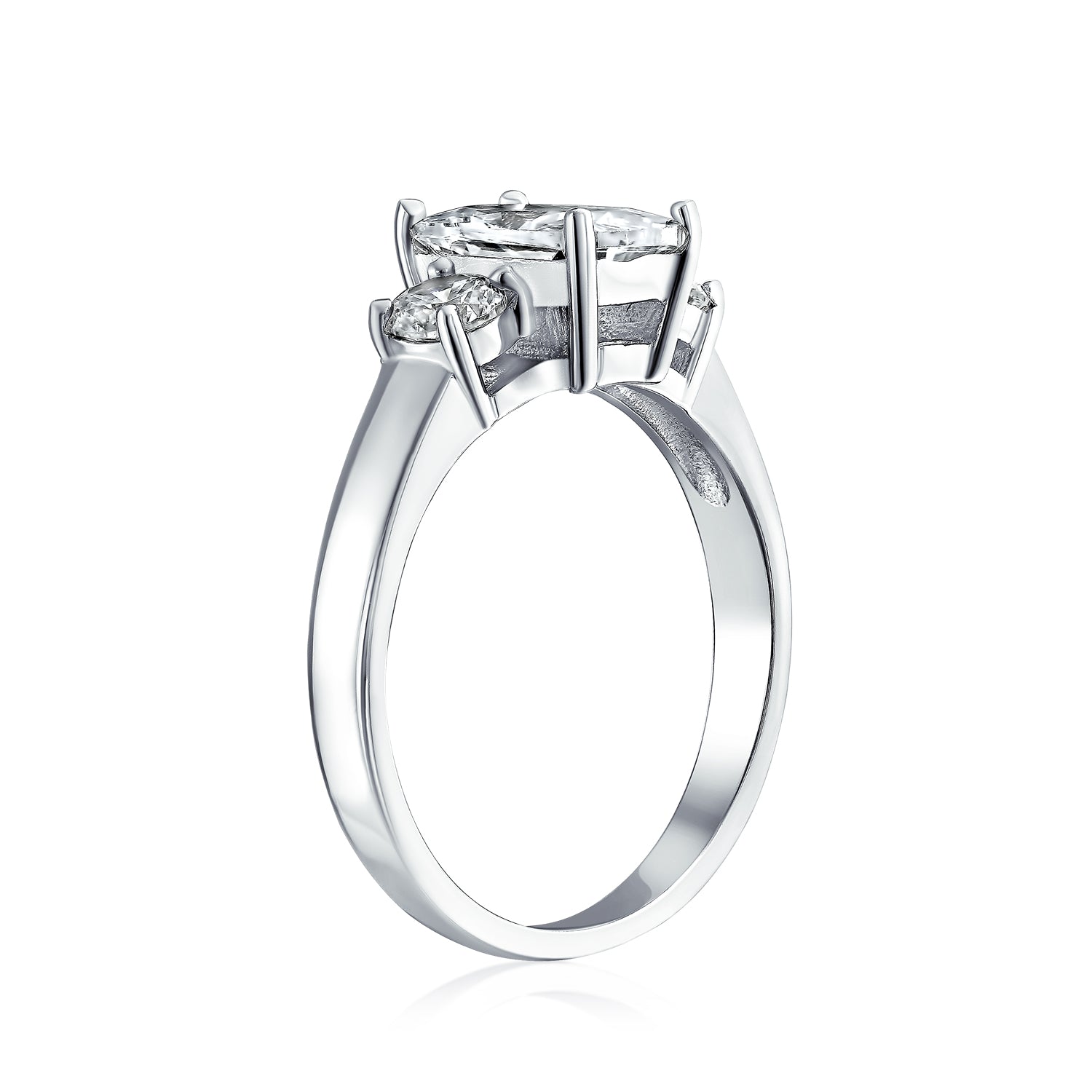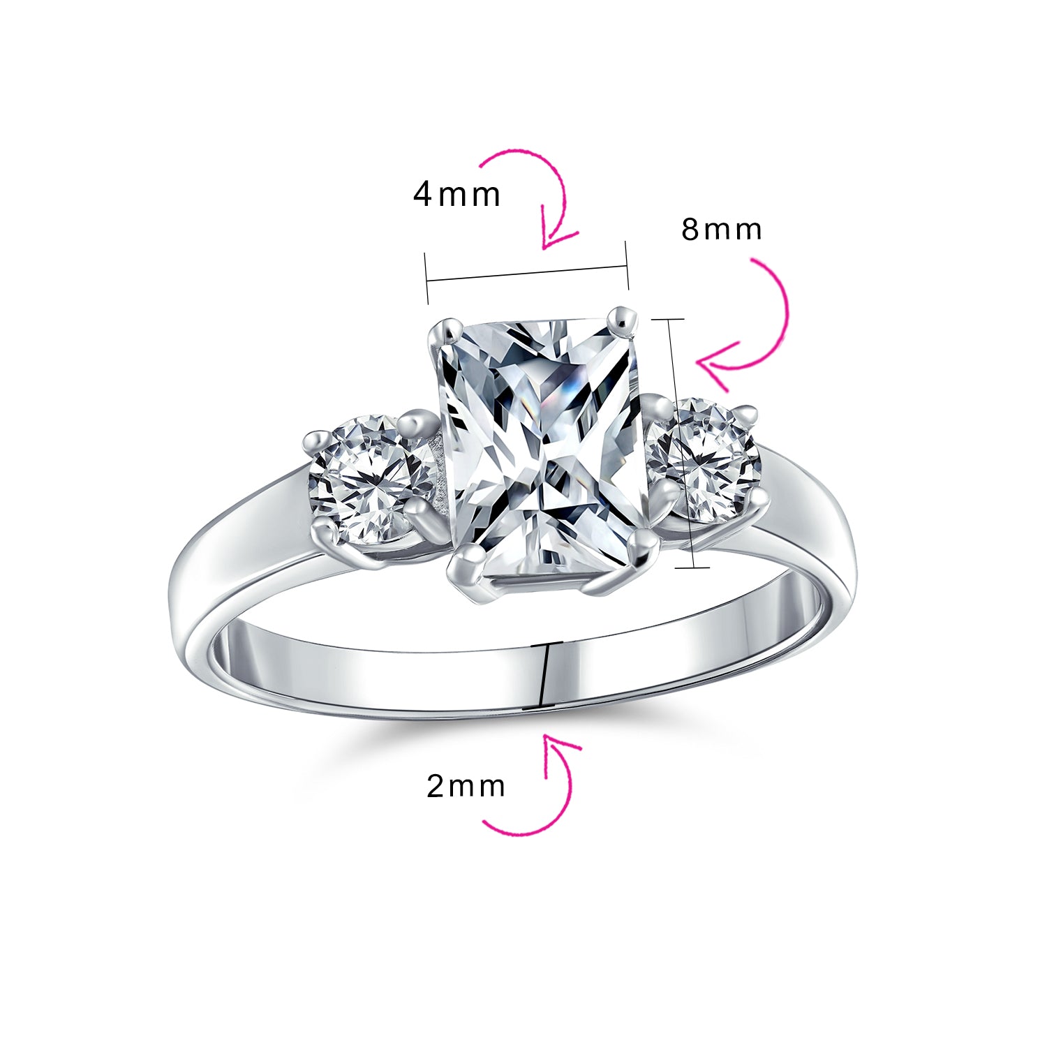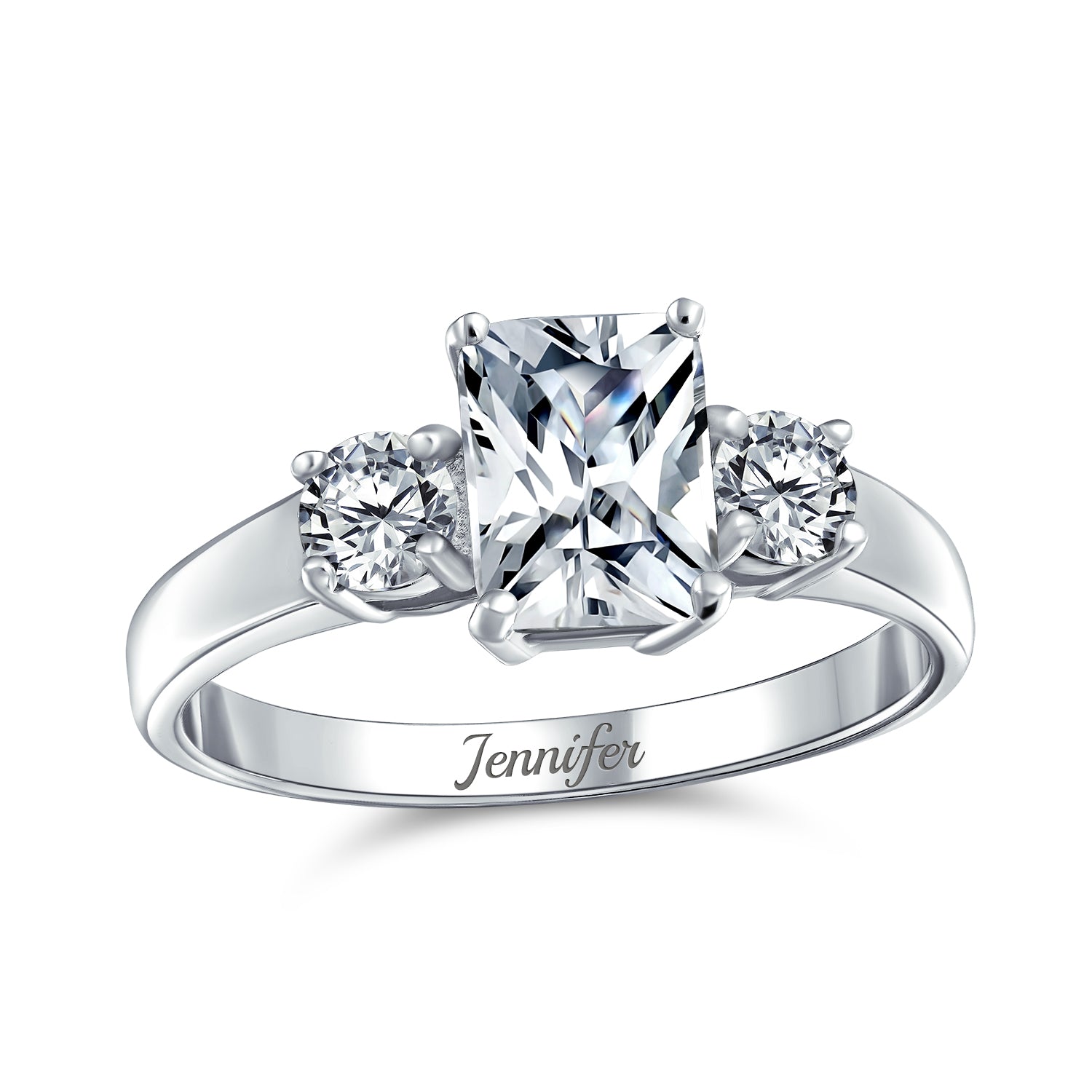 - A stunning 3-stone engagement ring designed for your exceptional bride-to-be, featuring a radiant 1.5ct emerald-cut CZ center stone, elegantly flanked by two brilliant round-cut CZ stones, all set on a luminous sterling silver band.