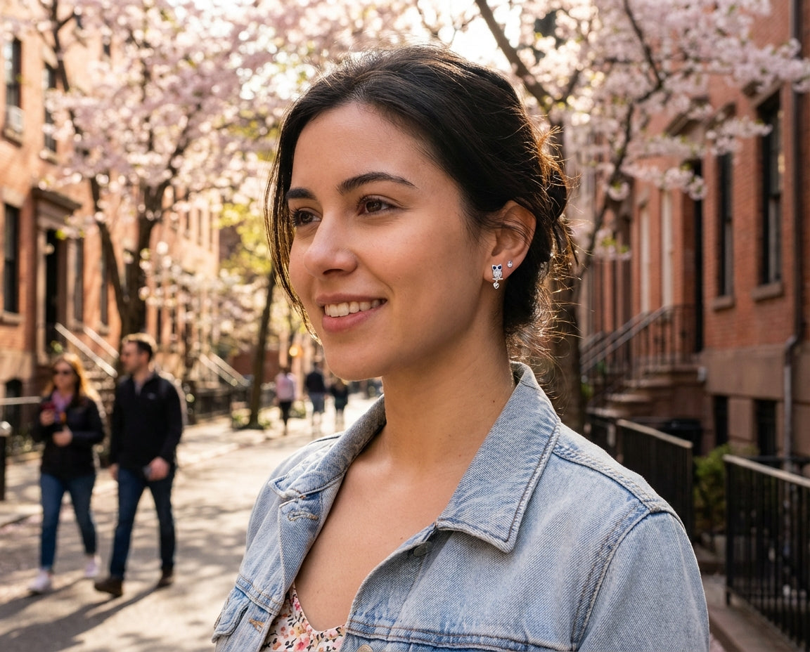 - These stunning Simulated Sapphire owl earrings are mesmerizing. Crafted from sterling silver, they feature detailed owl designs. The captivating blue CZ stones serve as the owl 's eyes. You'll want to wear these enchanting earrings daily. Perfect for pierced ears with push back closures. Order your pair today!