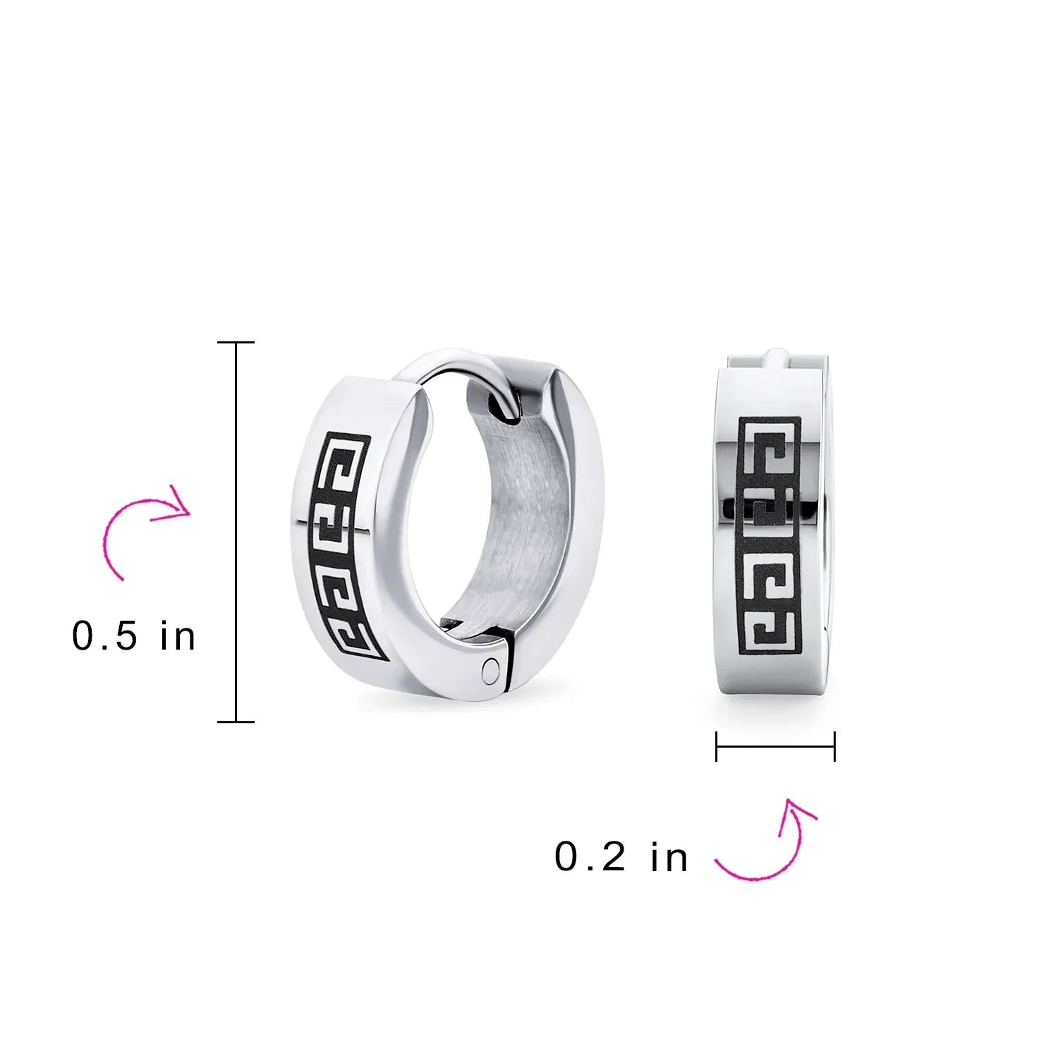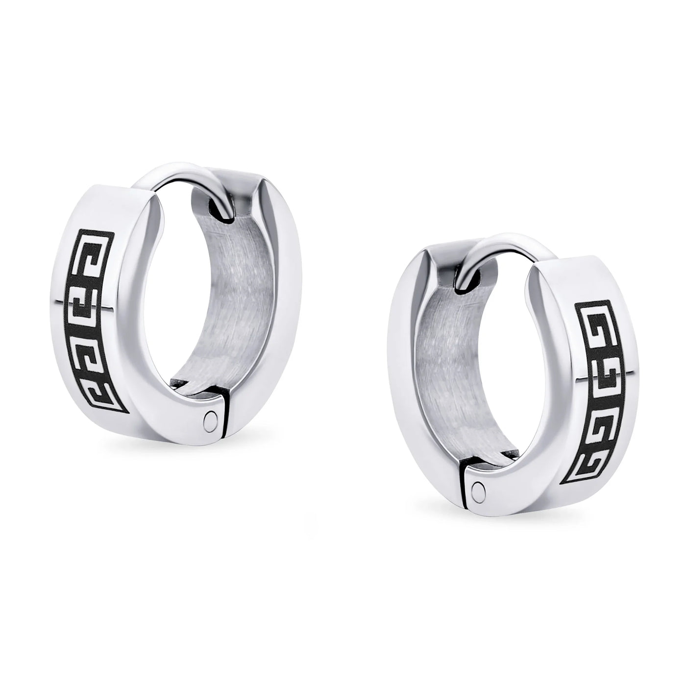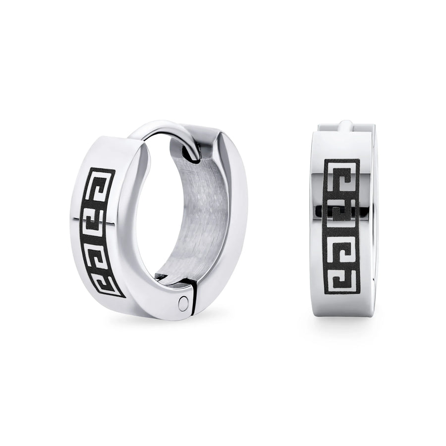 - Hell love our 0.5in, black IP plated steel huggie hoops to enhance any ensemble. With a laser etched Greek Key Design earrings are a great gift.