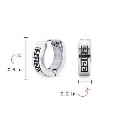 - Elevate your style effortlessly with our newest Greek key design earrings. Add dazzle and sophistication to your daily look. Crafted in stainless steel with black IP plating, they offer a stunning two-toned appearance. Lightweight and comfortable, they open easily on a hinge and snap securely in place. Perfect for Father's Day gifts, helping dads stay trendy and stylish. Ideal for graduates, adding a touch of power as they embark on new journeys.
