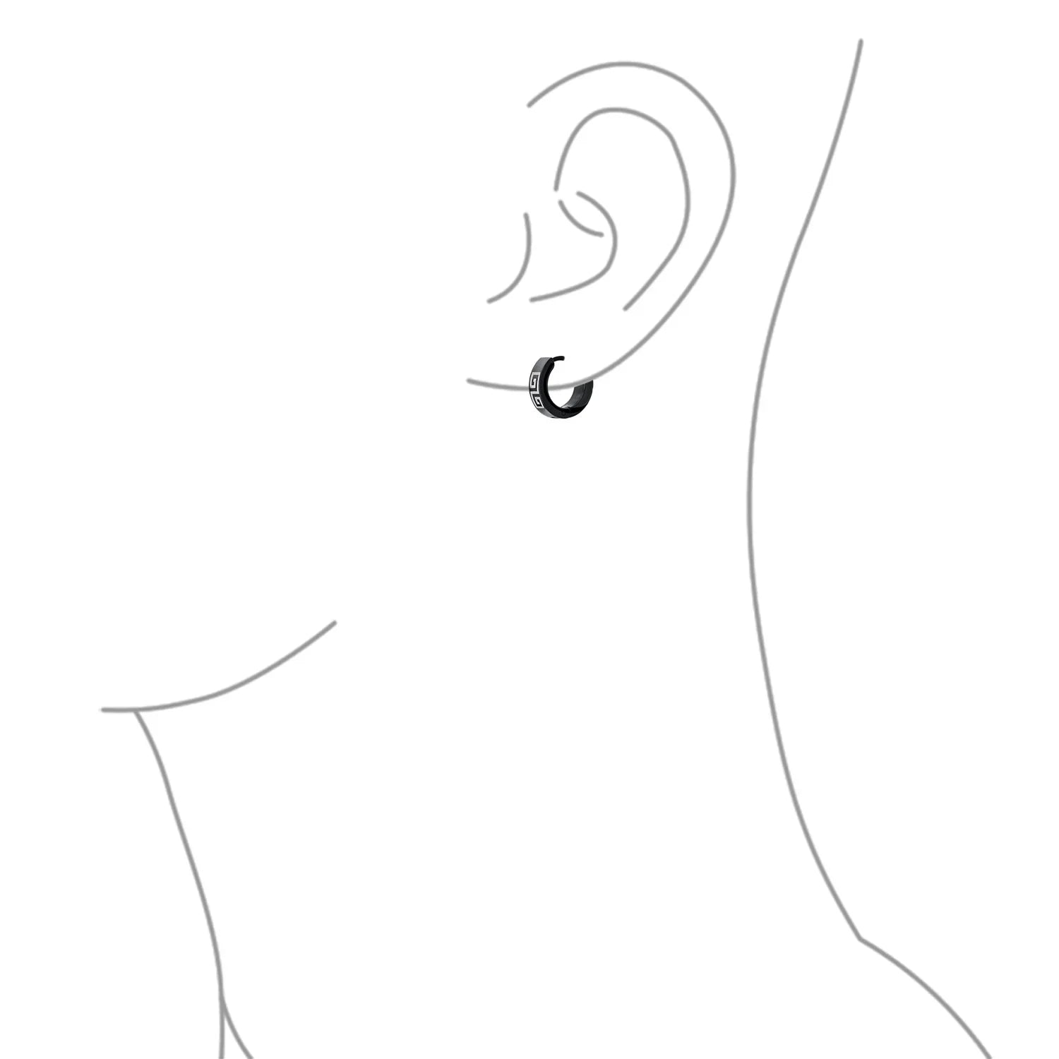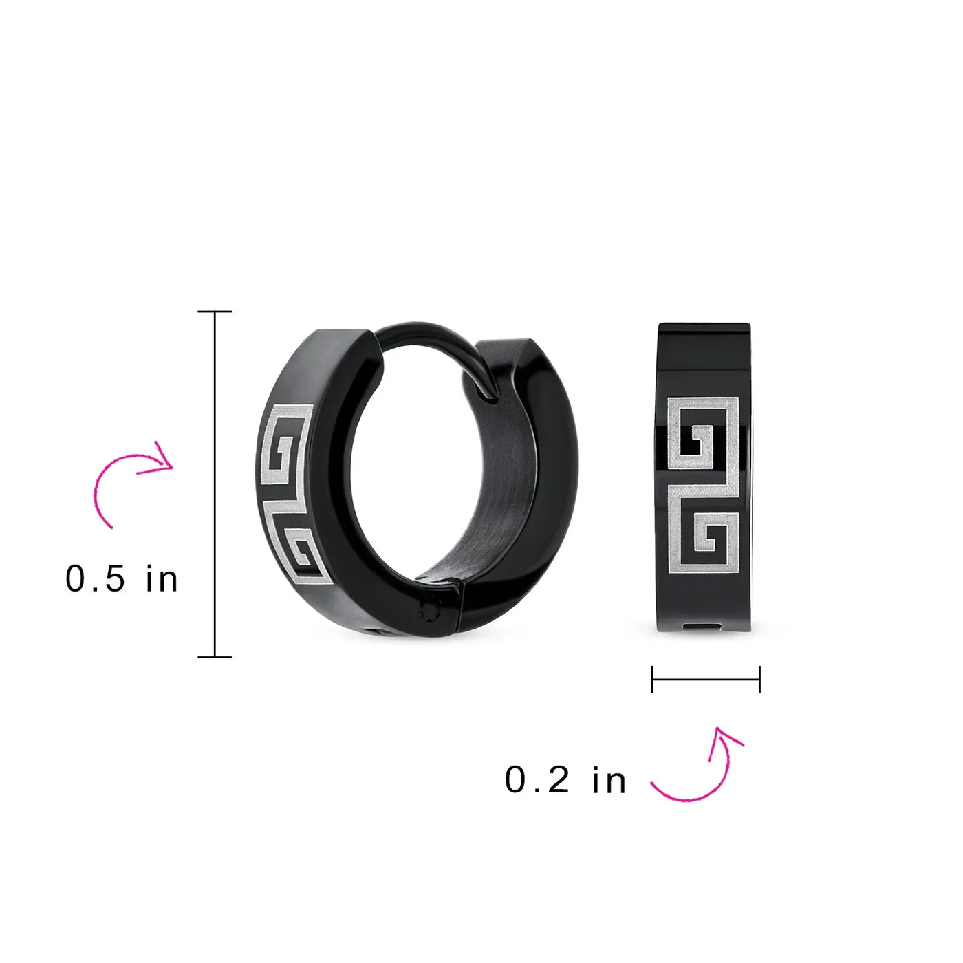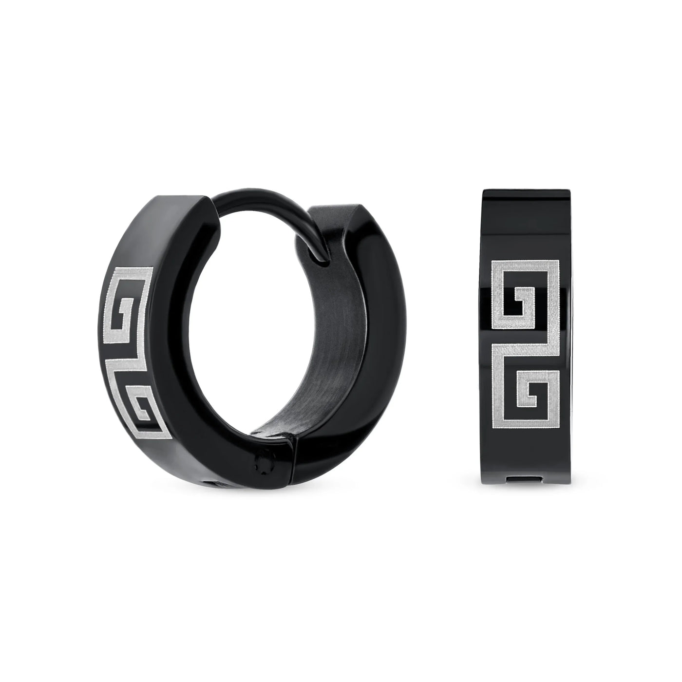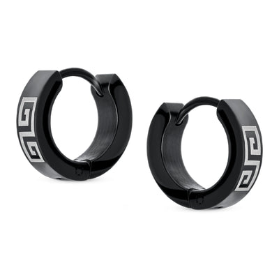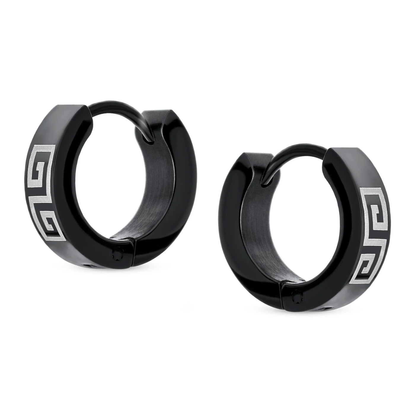 - Hell love our 0.5in, black IP plated steel huggie hoops to enhance any ensemble. With a laser etched Greek Key Design earrings are a great gift.
