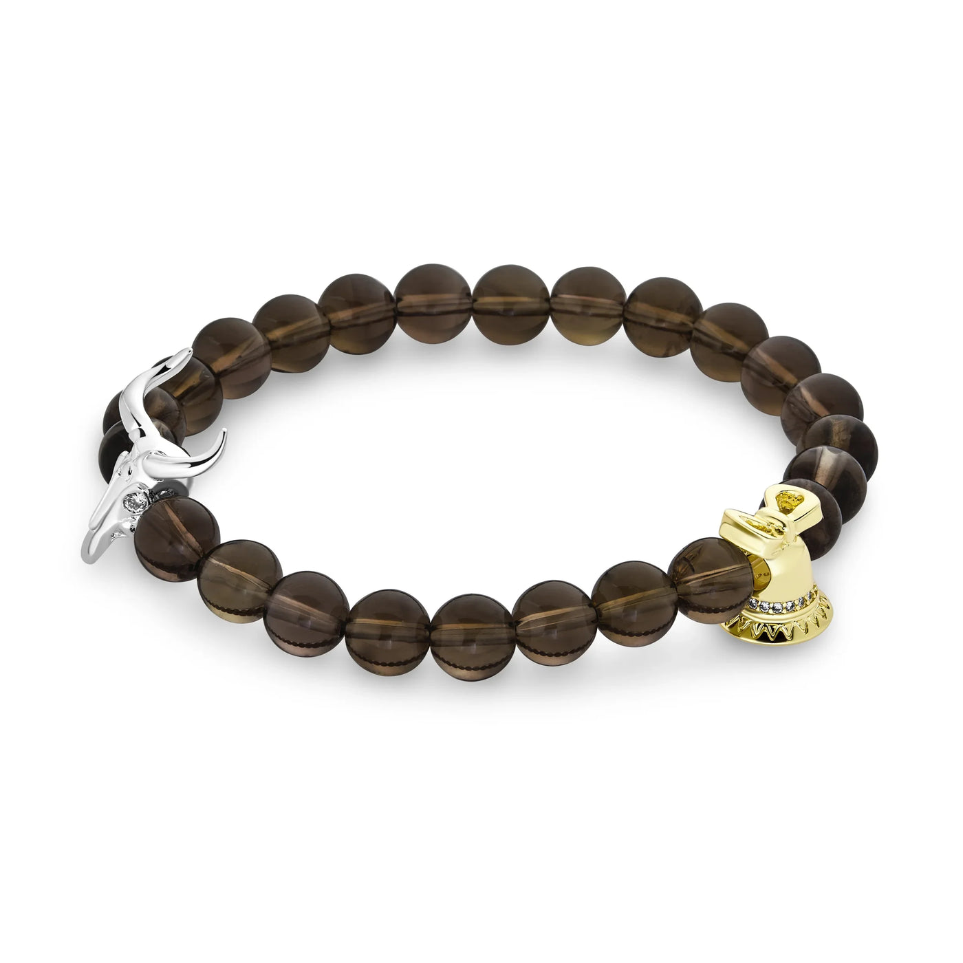 - Featuring a captivating combination of brown translucent beads and a striking Diner Bell & Fierce Texas Long Horn charm, this prayer bracelet boasts a truly distinctive appearance