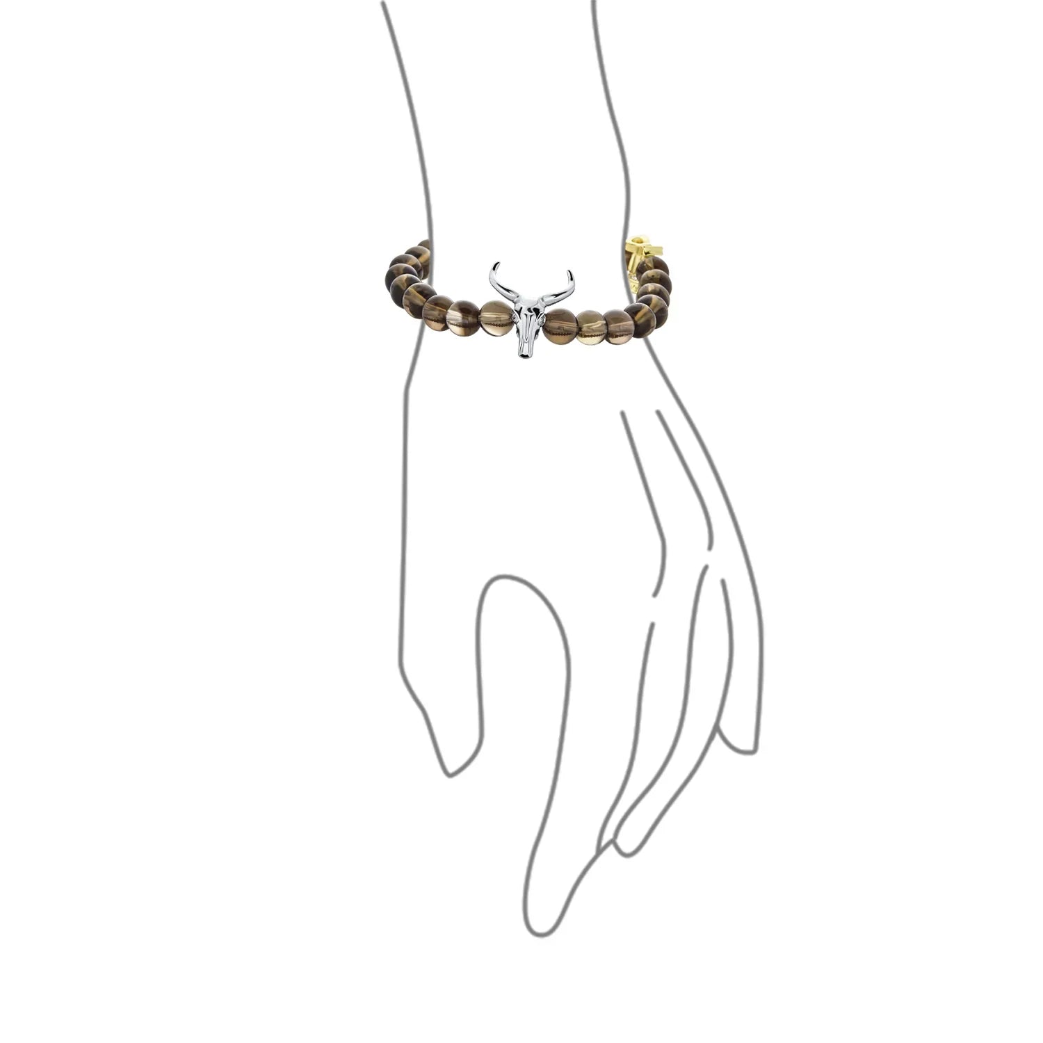 - Discover our stunning men's bracelet with a masculine look and exquisite oxidized finish, perfectly complementing sheer brown beads. Adorned with charms, including a meticulously carved Buffalo Ram skull and a charming dinner bell. Crafted to perfection, this bracelet is highly sought after, ideal for any man's ensemble. Elevate your style with this spectacular men's bracelet!