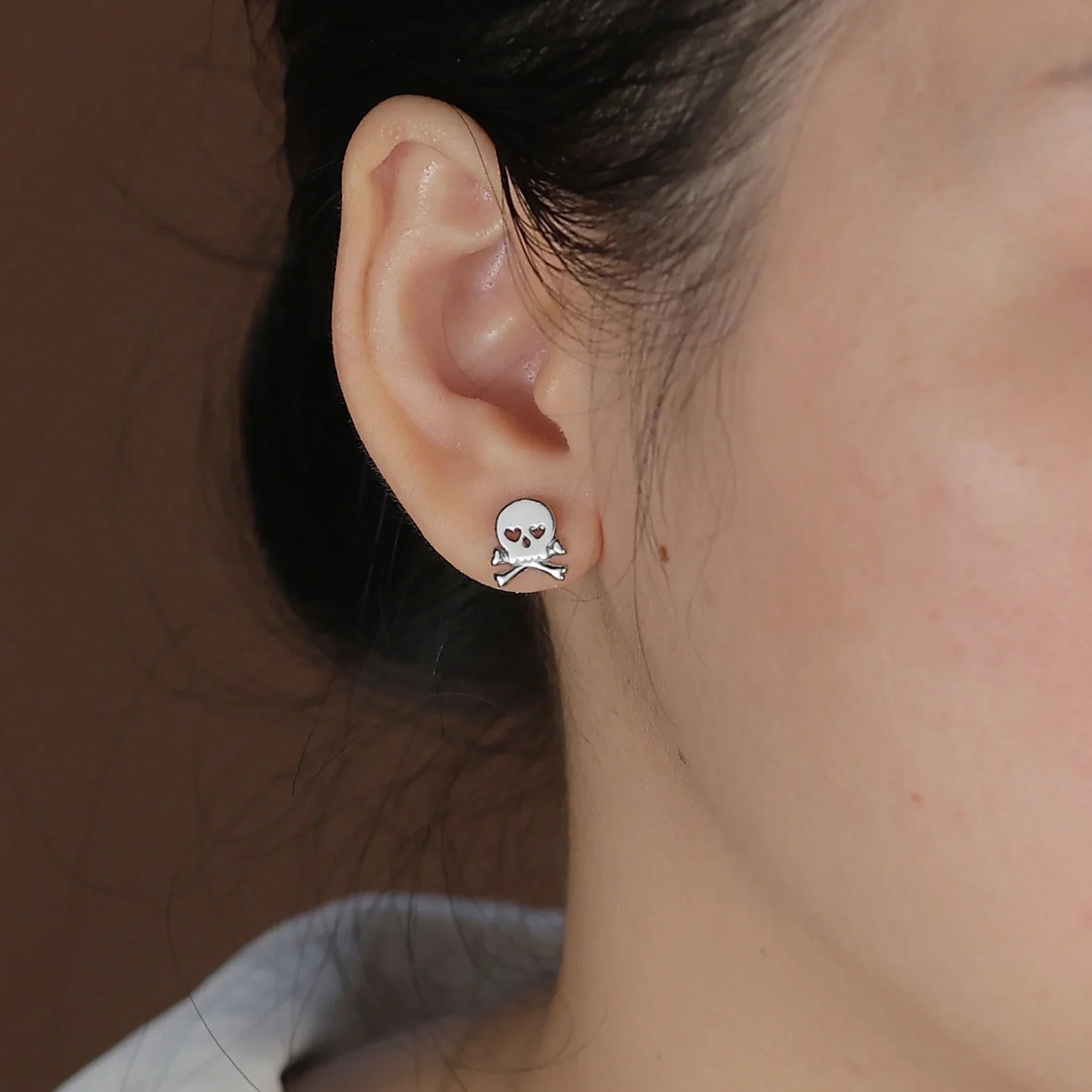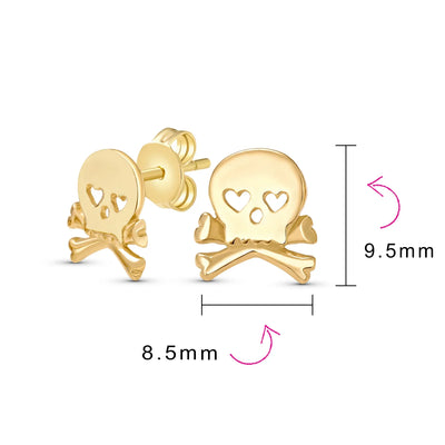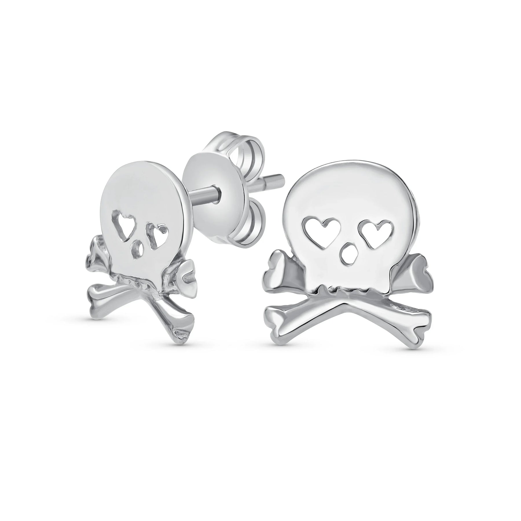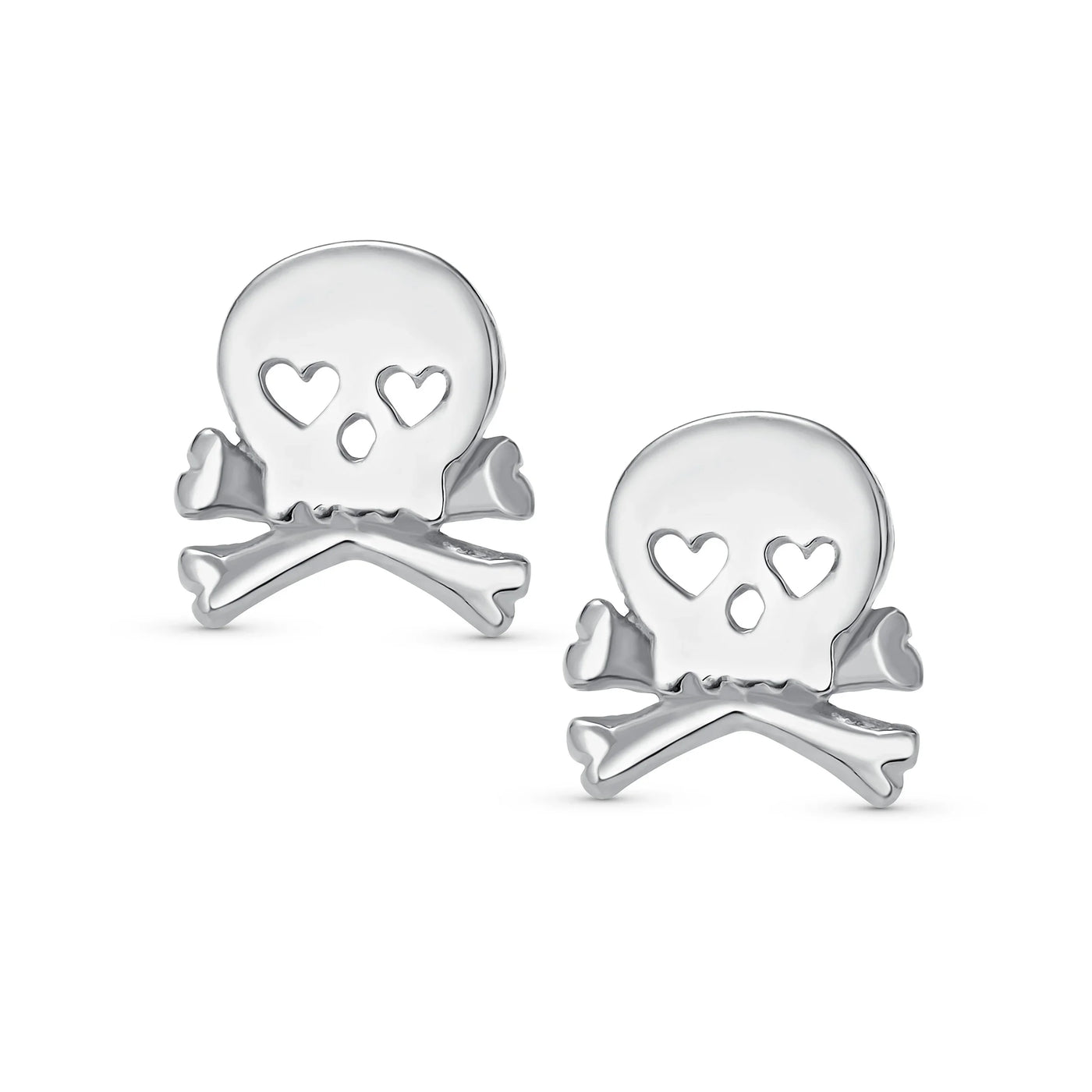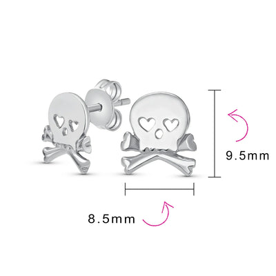 - If you are looking for a way to enhance your cool style, our sterling silver goth skull and crossbones stud earrings are a perfect choice for you. This skull and crossbones jewelry is dainty and features heart shaped eyes, for a unique look. Made of 925 sterling silver and polished to a high shine, these stud earrings for women will pair with any outfit. Show off your edgy side with a new pair of goth earrings. The hearts in place of the eyes make them suitable for a fun gift of Valentines Day jewelry or you can buy them as a gift any day for a loved one and help her to show some biker chic style. These sterling silver skull studs will fit securely as they have a post with a friction butterfly back. A little bit punk in style with a little rock and roll mixed in, these small stud earrings make a big fashion statement without being too bold. Order yours today.
