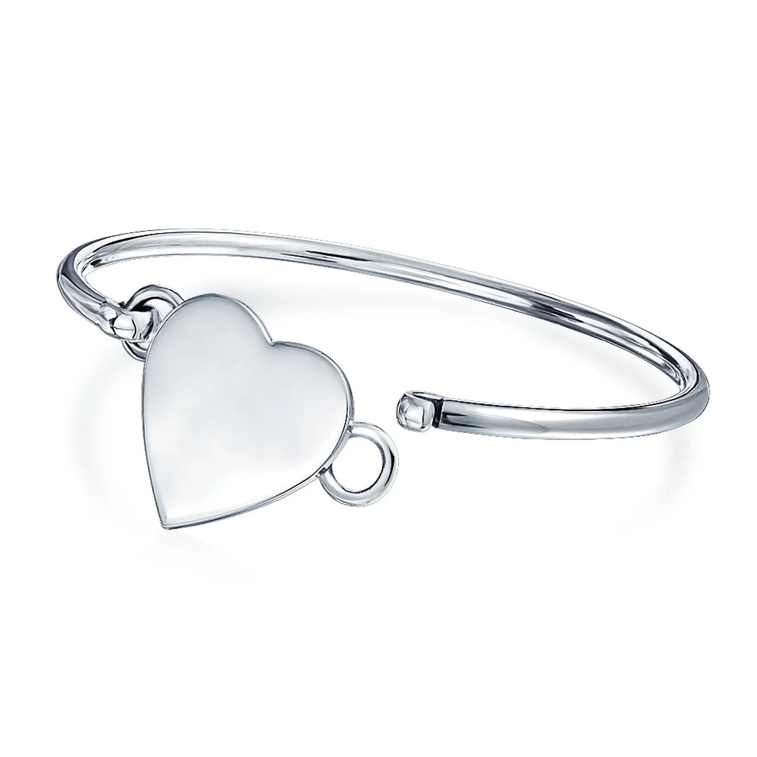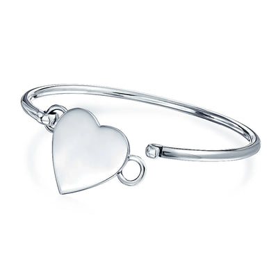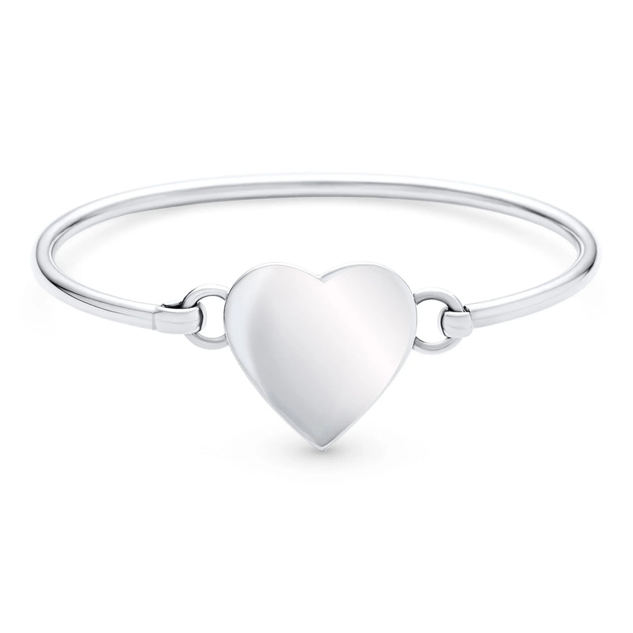 • Elevate your style with a touch of feminine romance by wearing this chic, stackable .925 silver bangle heart bracelet. Perfect for expressing your personal style, this lovely piece is an ideal choice for Valentines Day. The bracelet features a sweet heart motif at the center, complemented by a lustrous, high polished finish. The easy hook closure ensures a secure and comfortable fit.