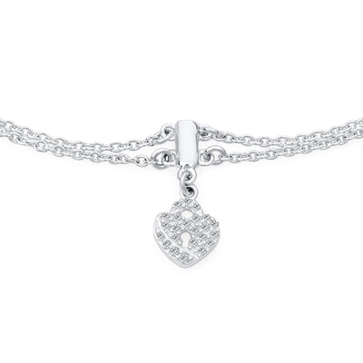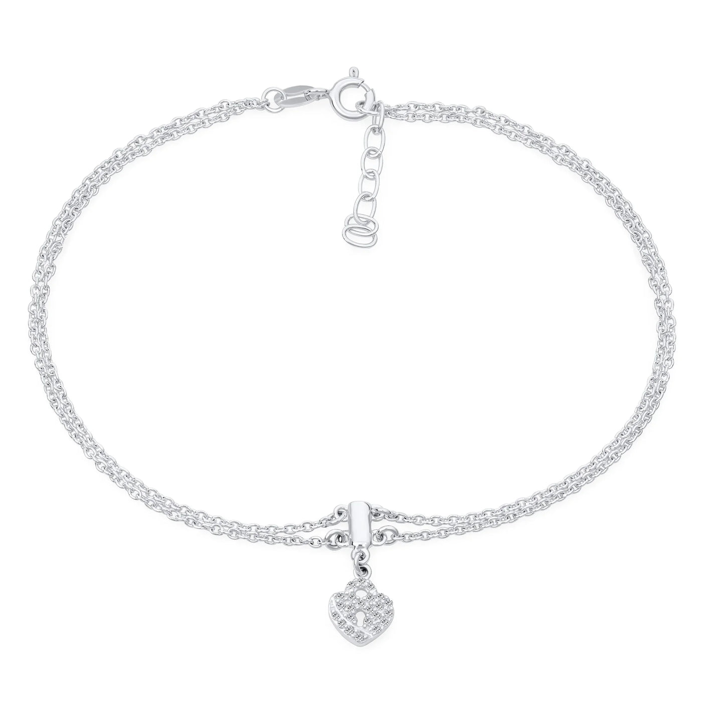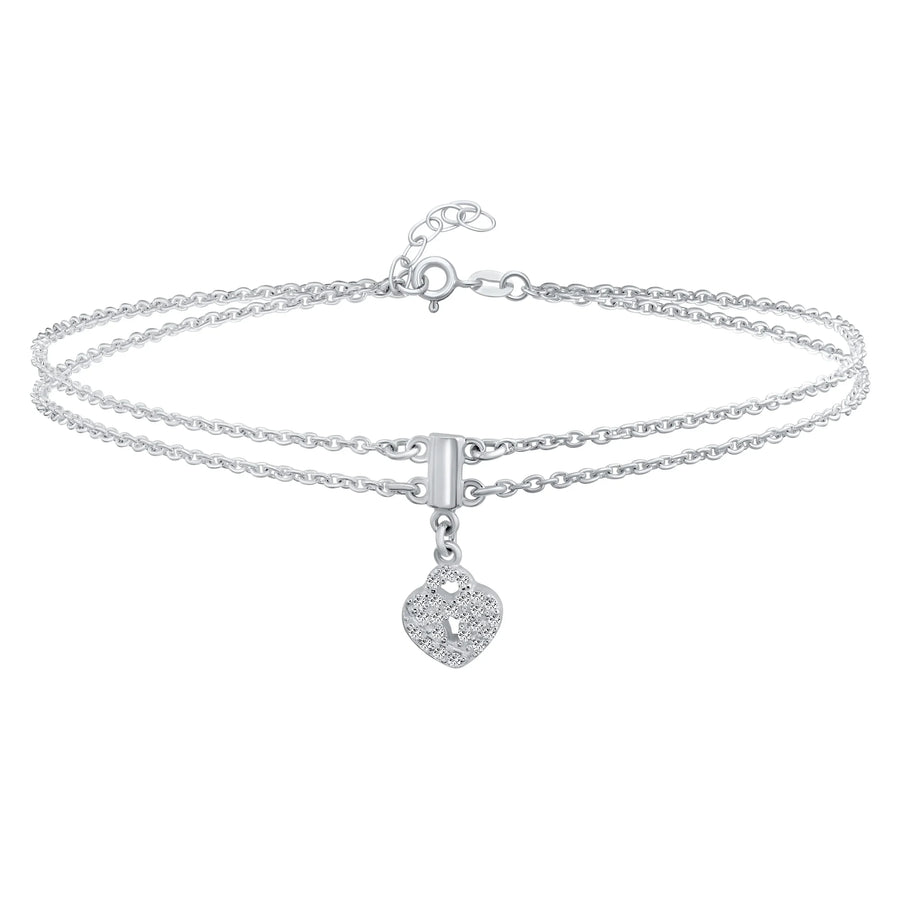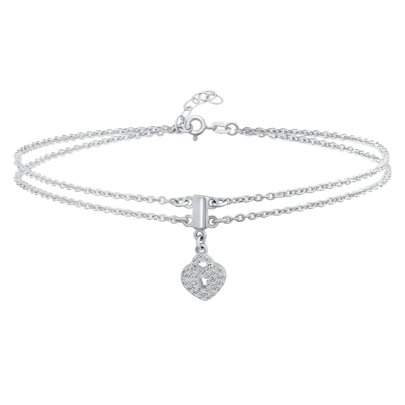 • Express love this holiday with affordable sterling silver jewelry. Double chain ankle bracelets are trending. Our classic rolo chain bracelet features a second strand and a flirty heart lock charm. The heart lock is adorned with colorless CZ stones. This anklet sparkles and adds elegance to any outfit. Enjoy affordable heart jewelry or gift it to someone special.