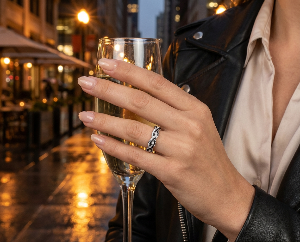 - Enhance your night out ensemble with this captivating two-tone ring, featuring a sparkling black and white design. Accented by a striking simulated onyx CZ and clear CZ, with a spiral twisted rope band.