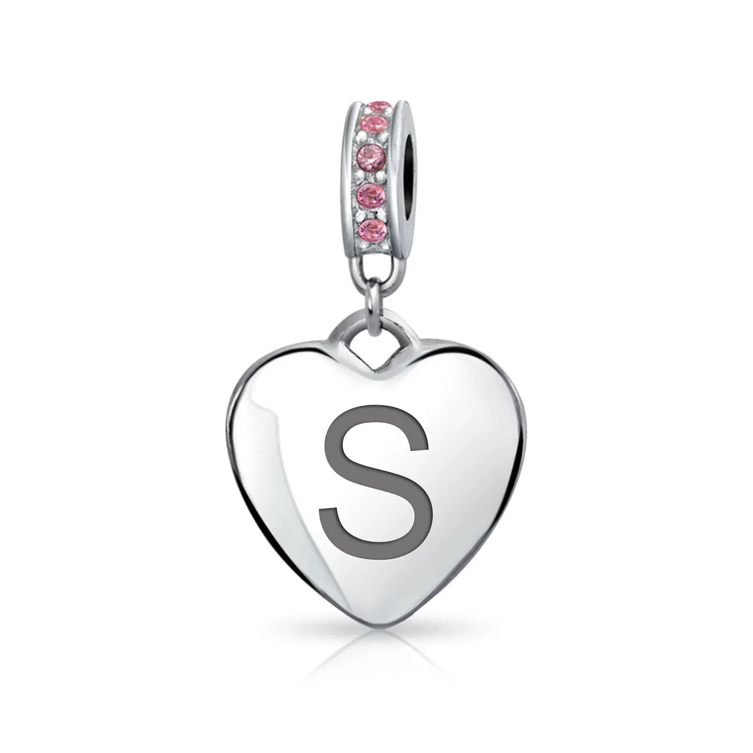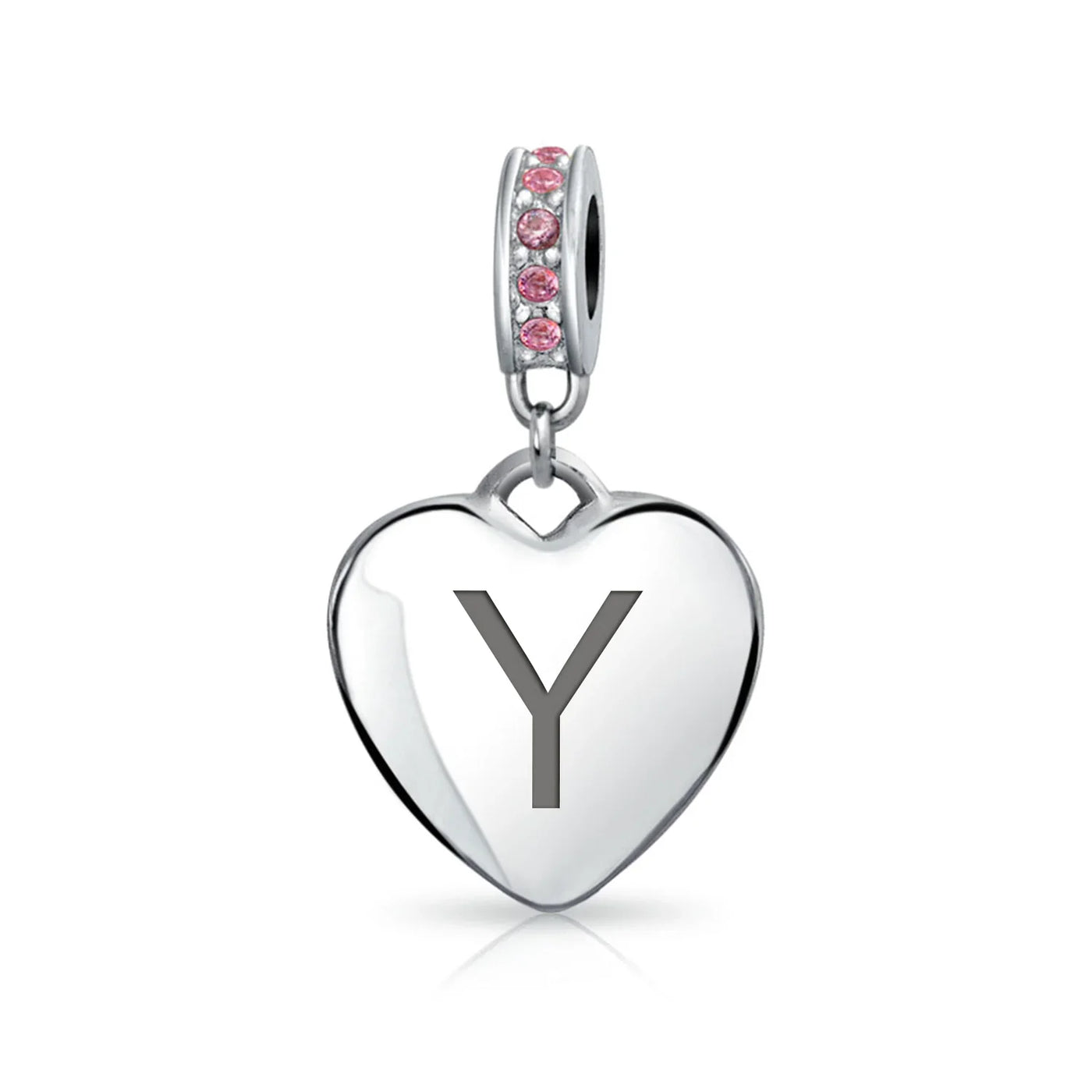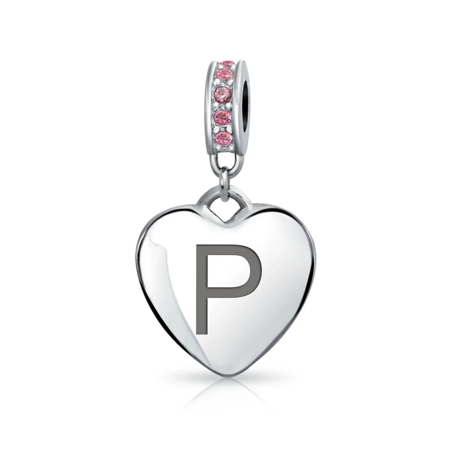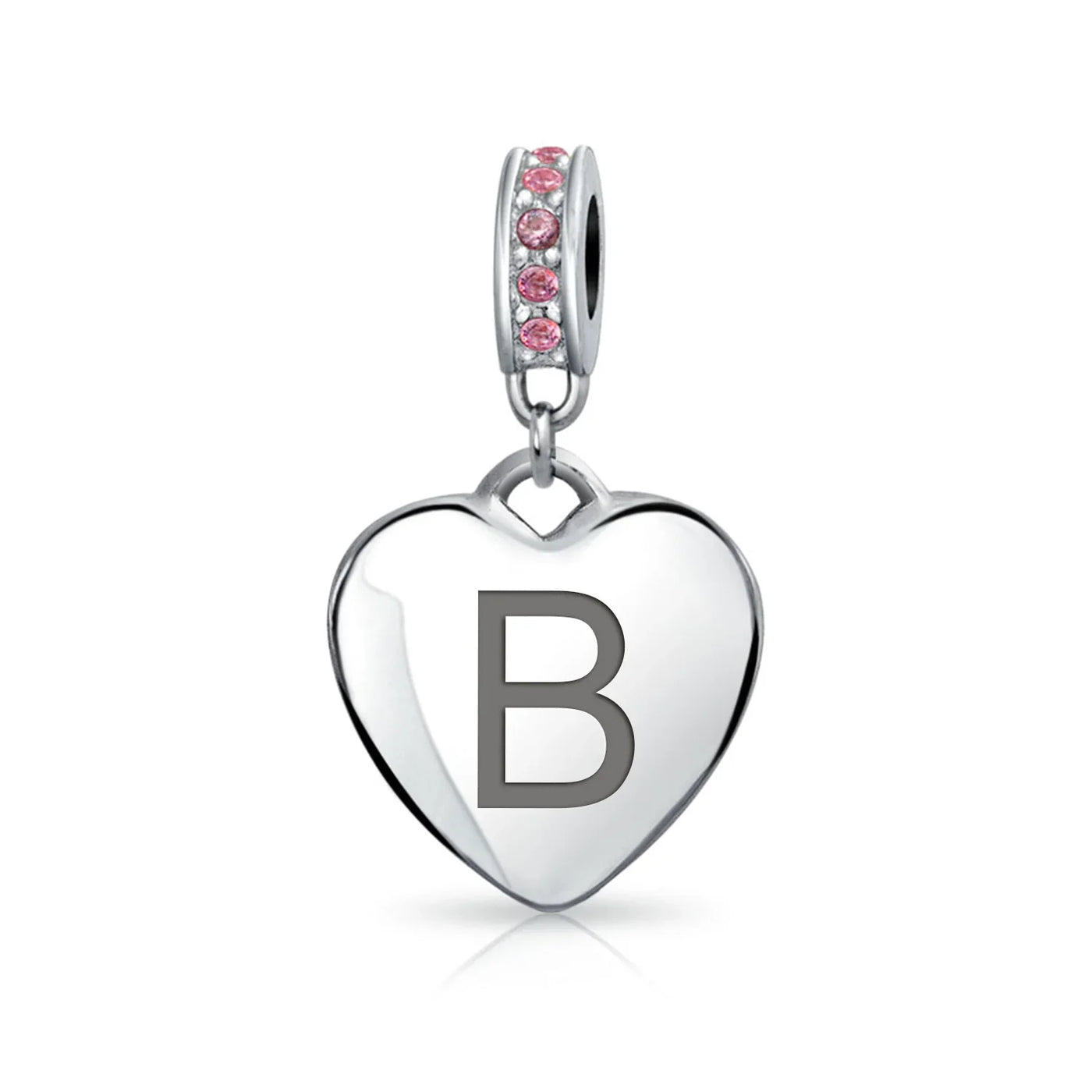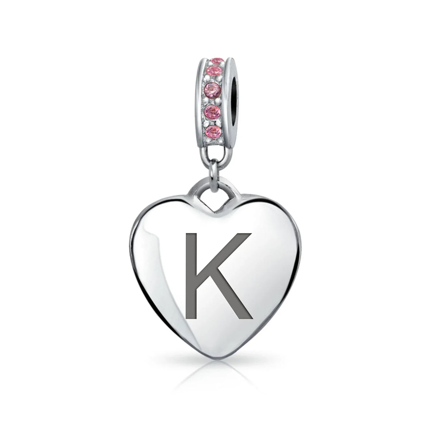 - Why not engrave names inspirational message, letters, numbers, date or coordinates. A beautifully sentimental gift, add a feminine touch to any bead story with this elegantly designed bead dangle charm. Featuring a lustrous heart motif with shimmering, simulated pink topaz, crystal accent on bail.