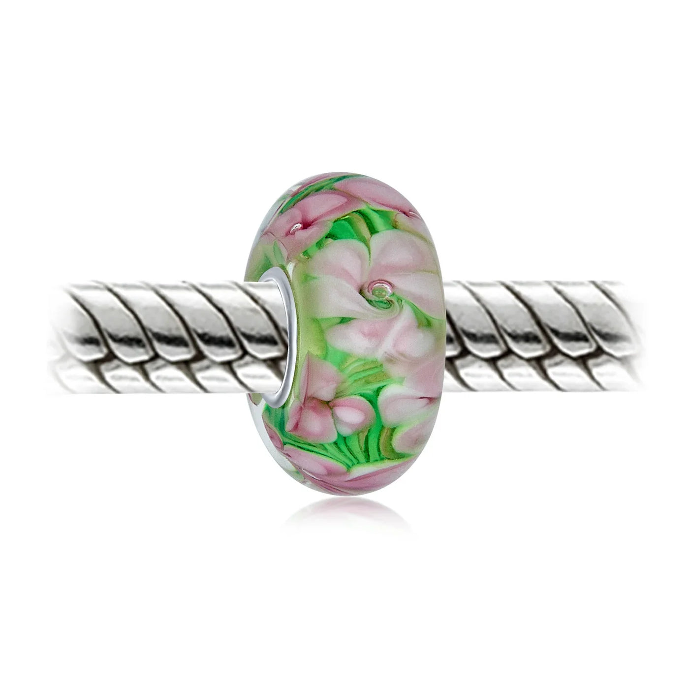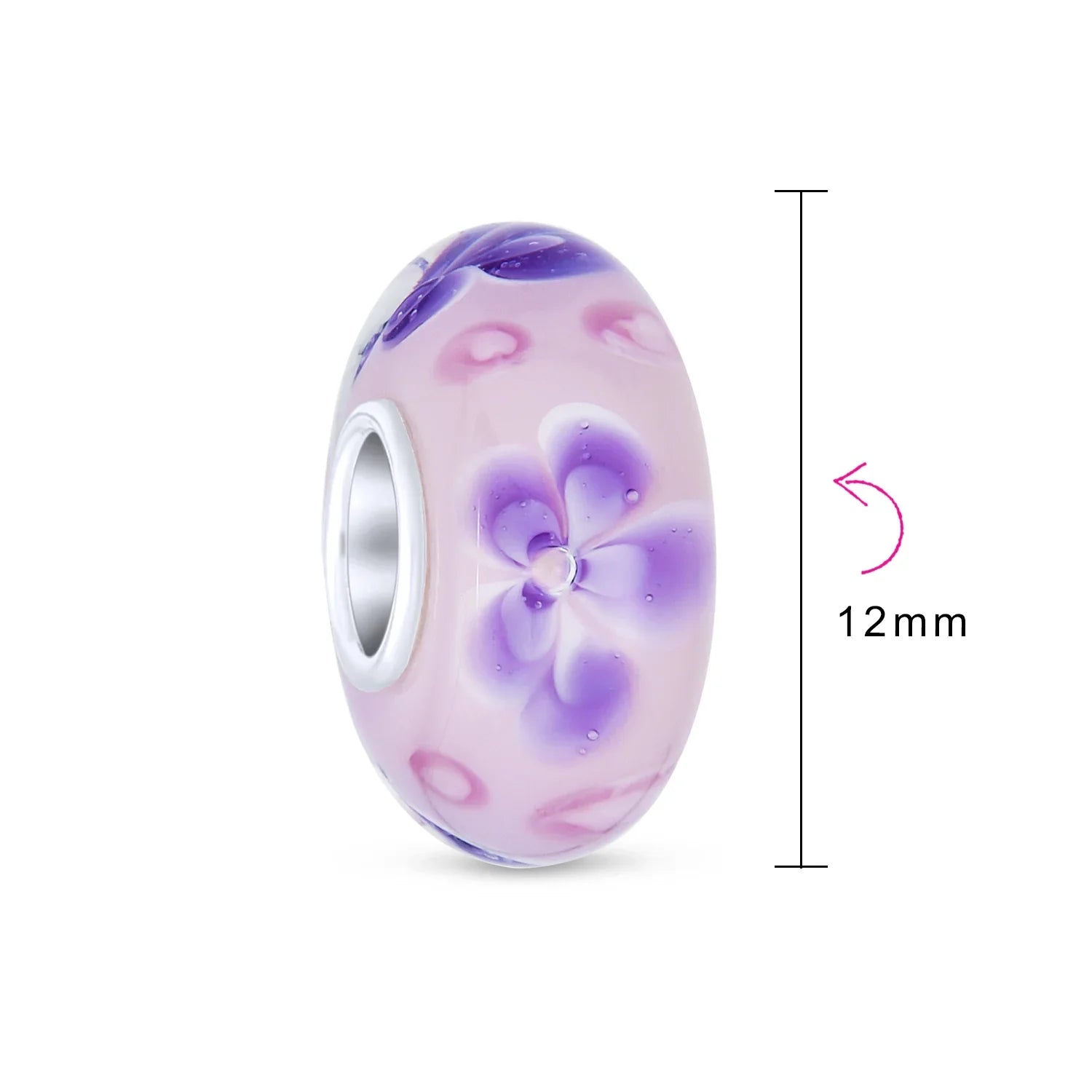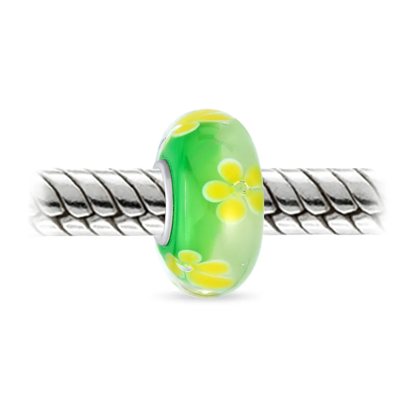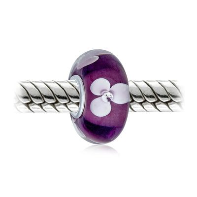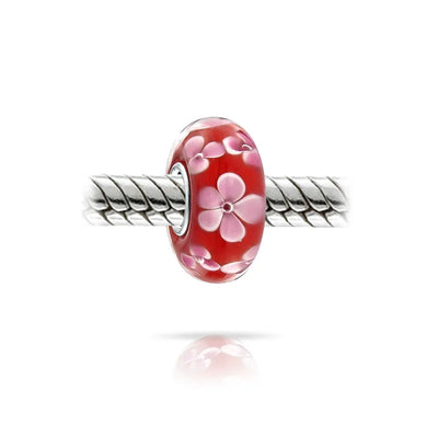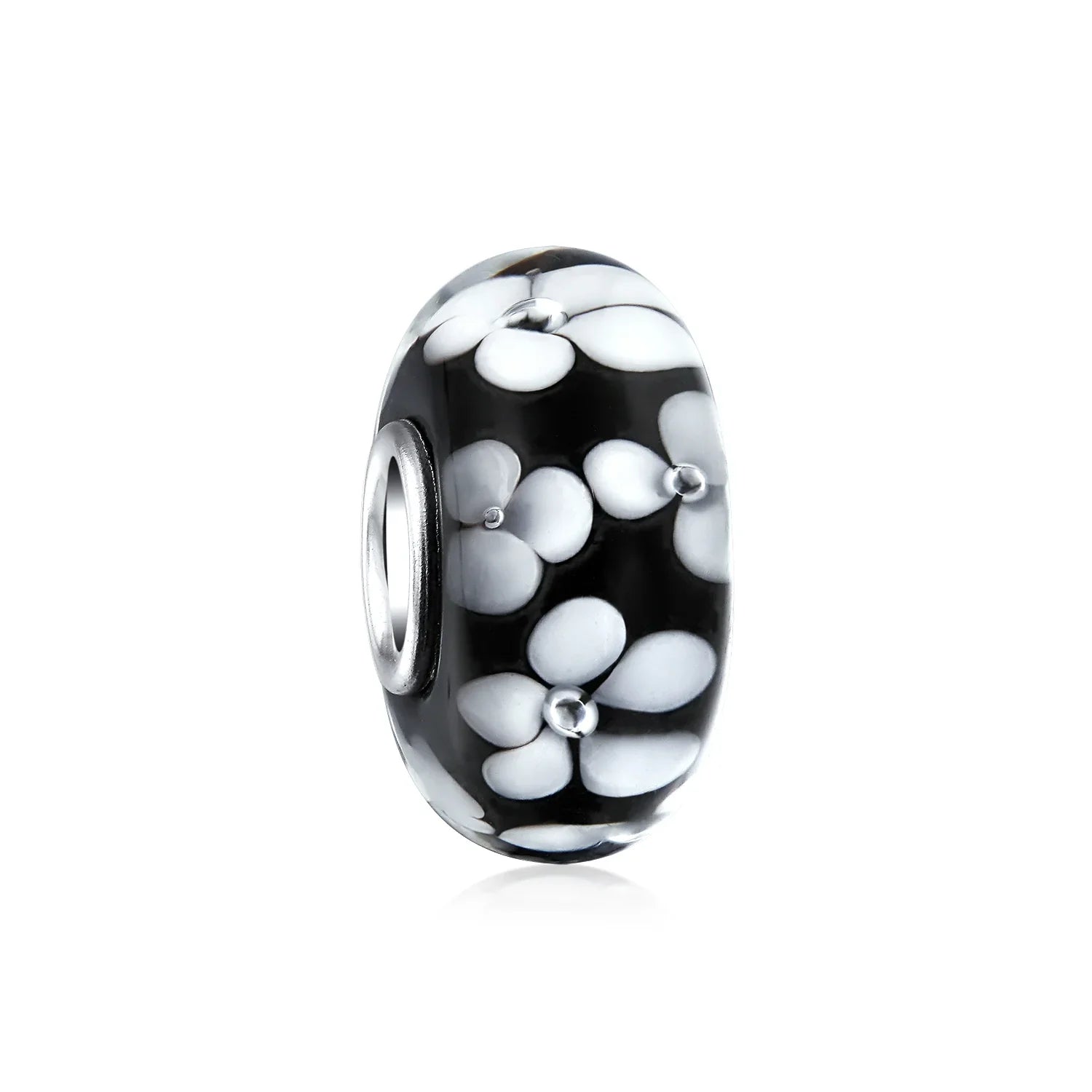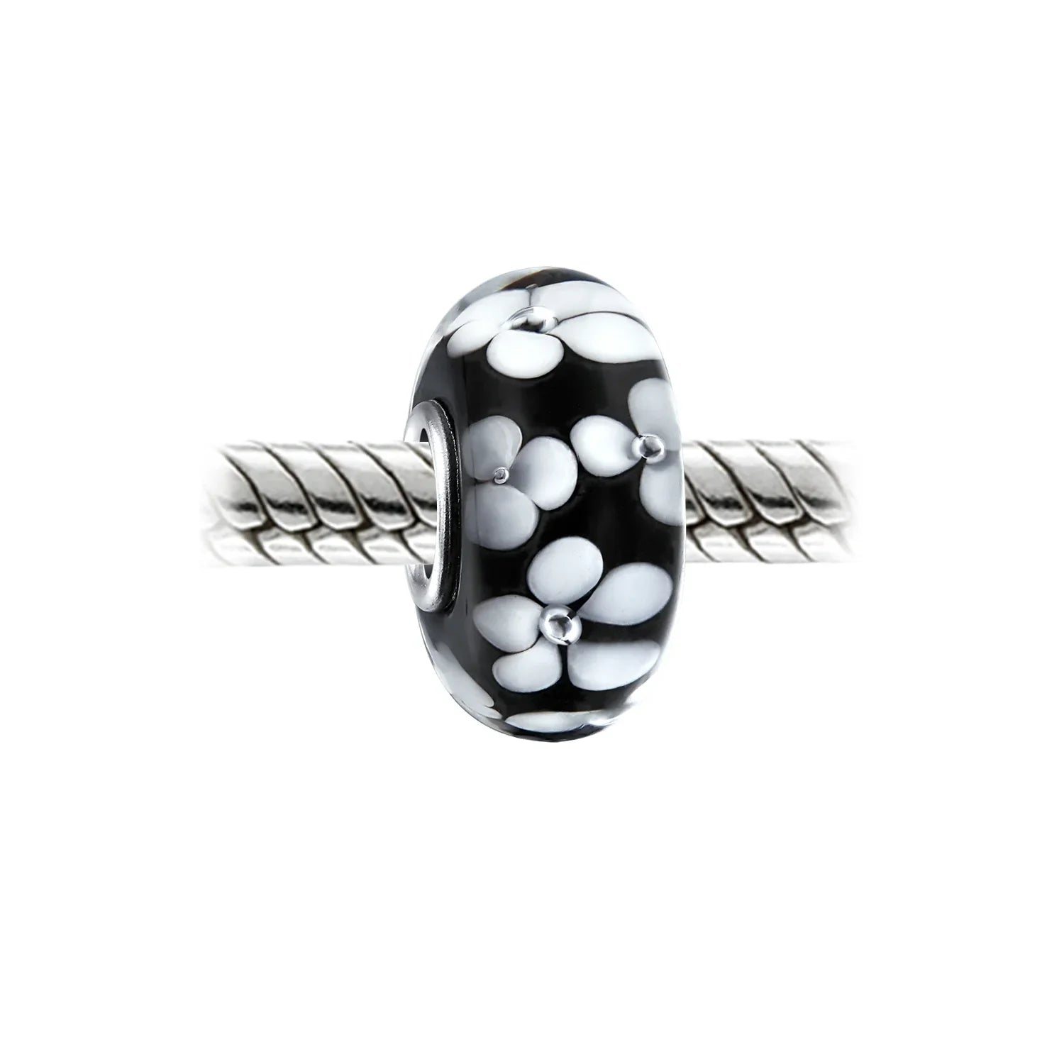 - Beautiful flowers adorn this Murano Glass Bead charm. Compatible with European style charm bracelets, 3mm snake chains, and cords. This stylish flower bead will be the centerpiece of your bracelet, enhancing your favorite charms and beads. Perfect for adding a touch of spring to your look.
