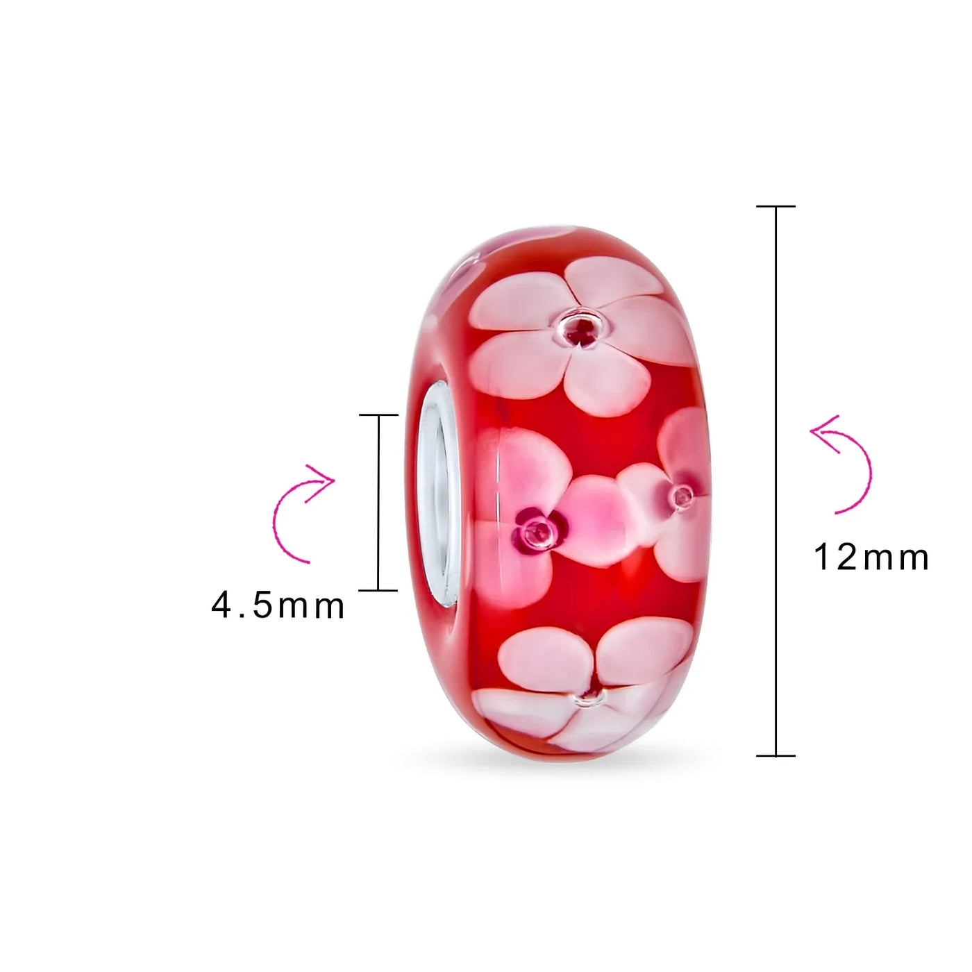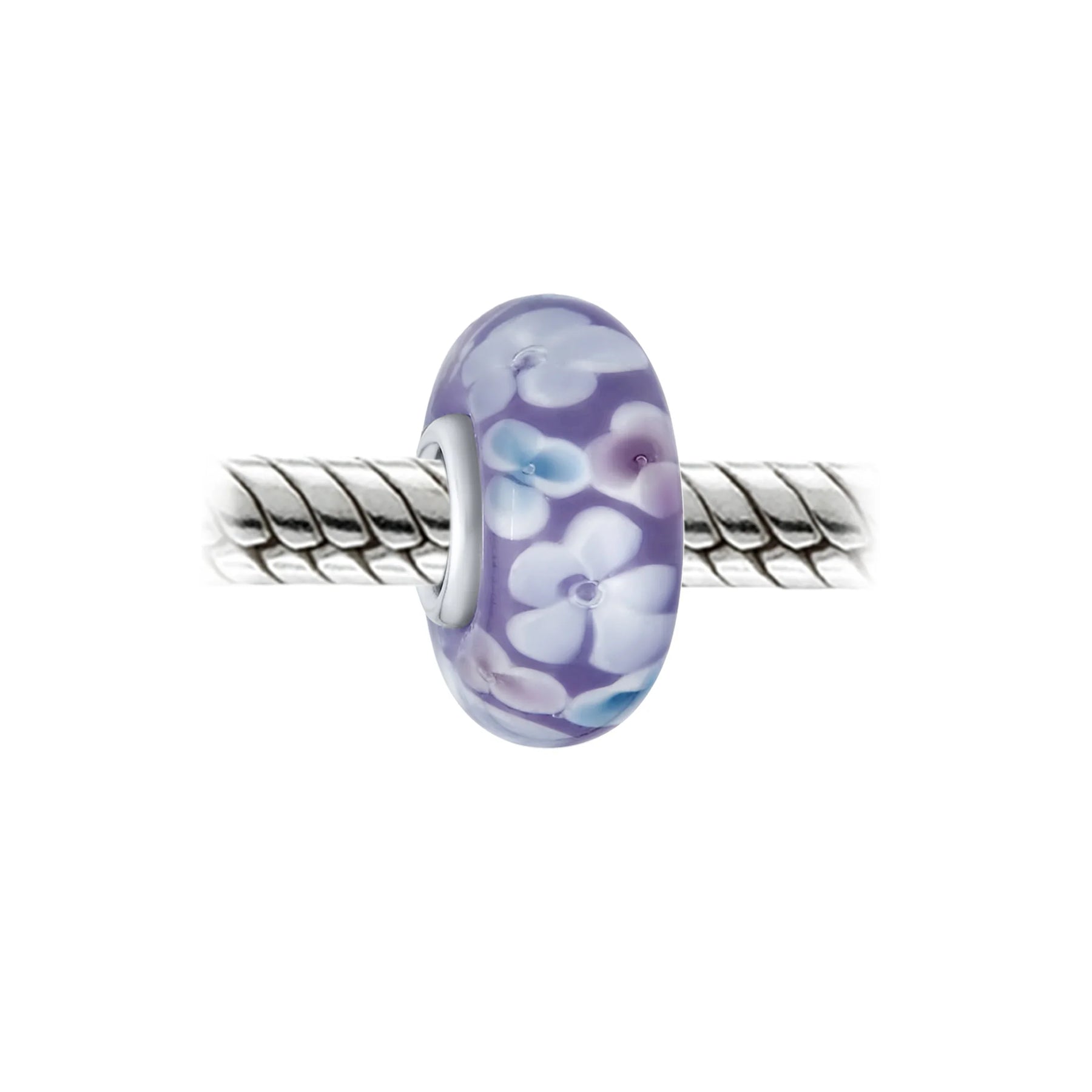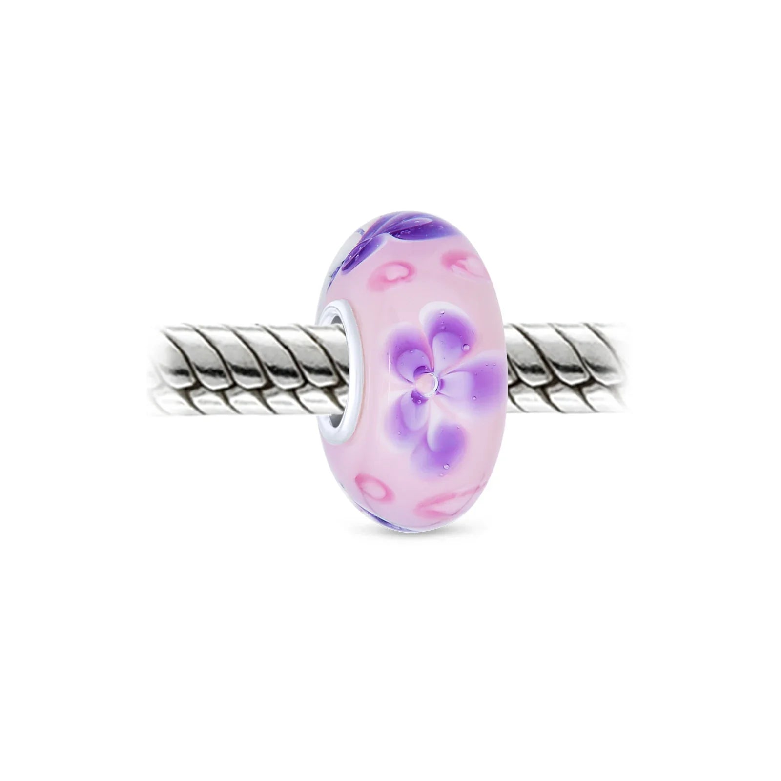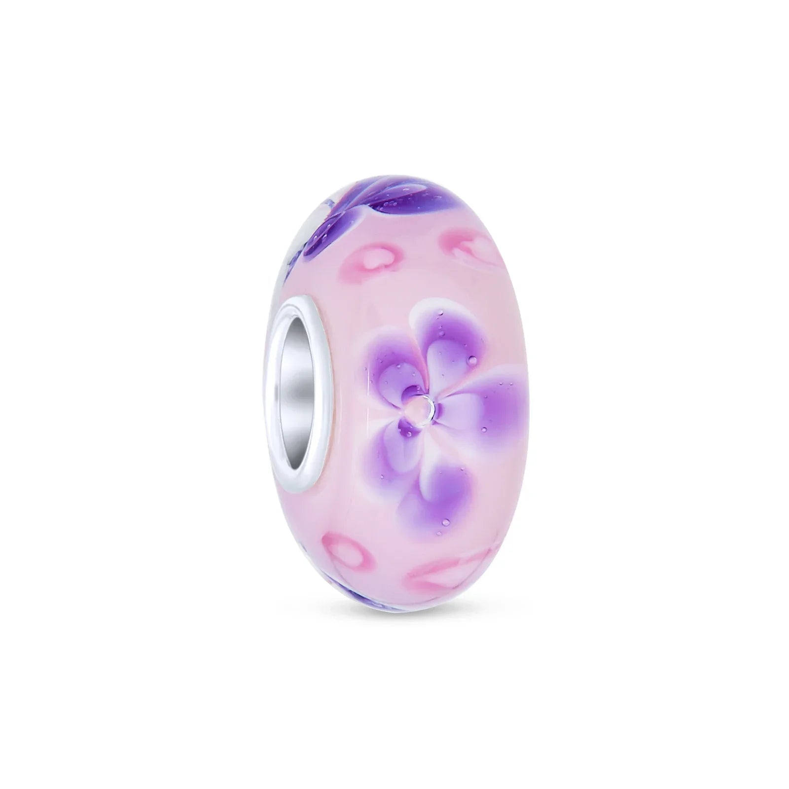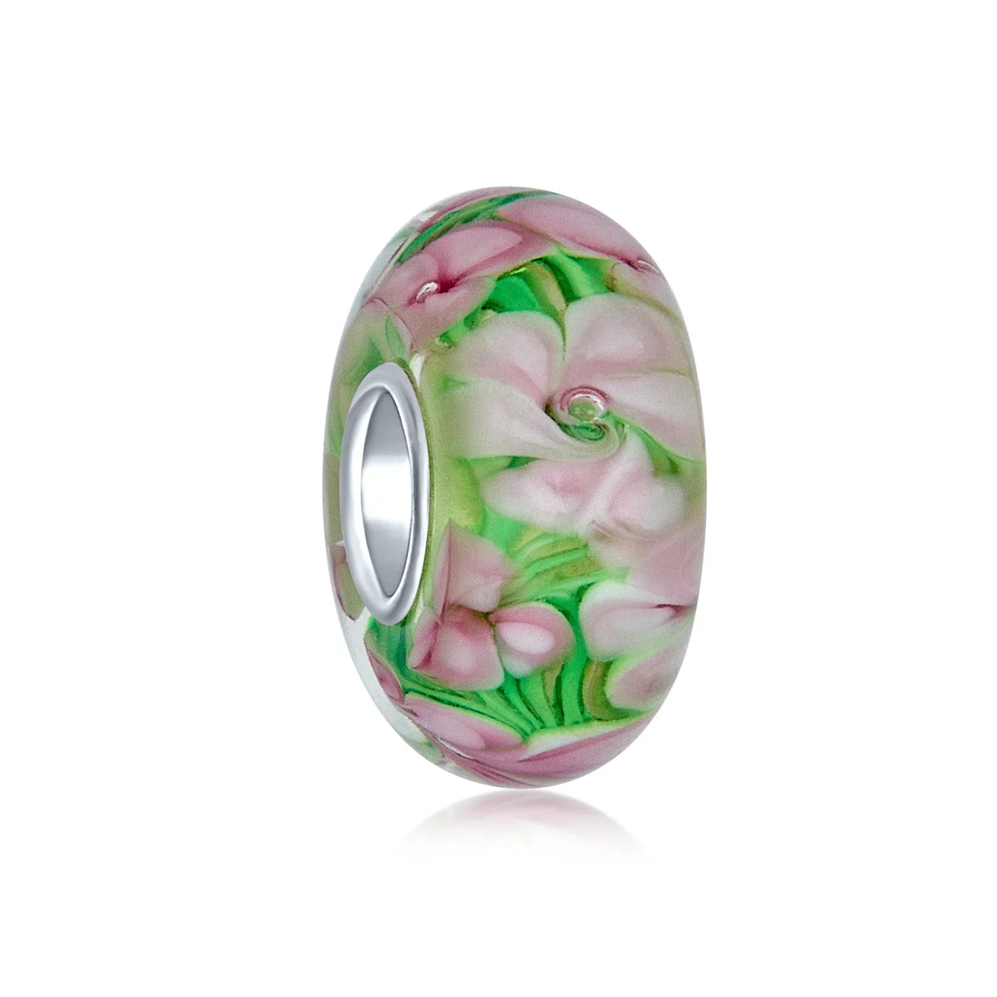 - Beautiful flowers adorn this Murano Glass Bead charm. Compatible with European style charm bracelets, 3mm snake chains, and cords. This stylish flower bead will be the centerpiece of your bracelet, enhancing your favorite charms and beads. Perfect for adding a touch of spring to your look.