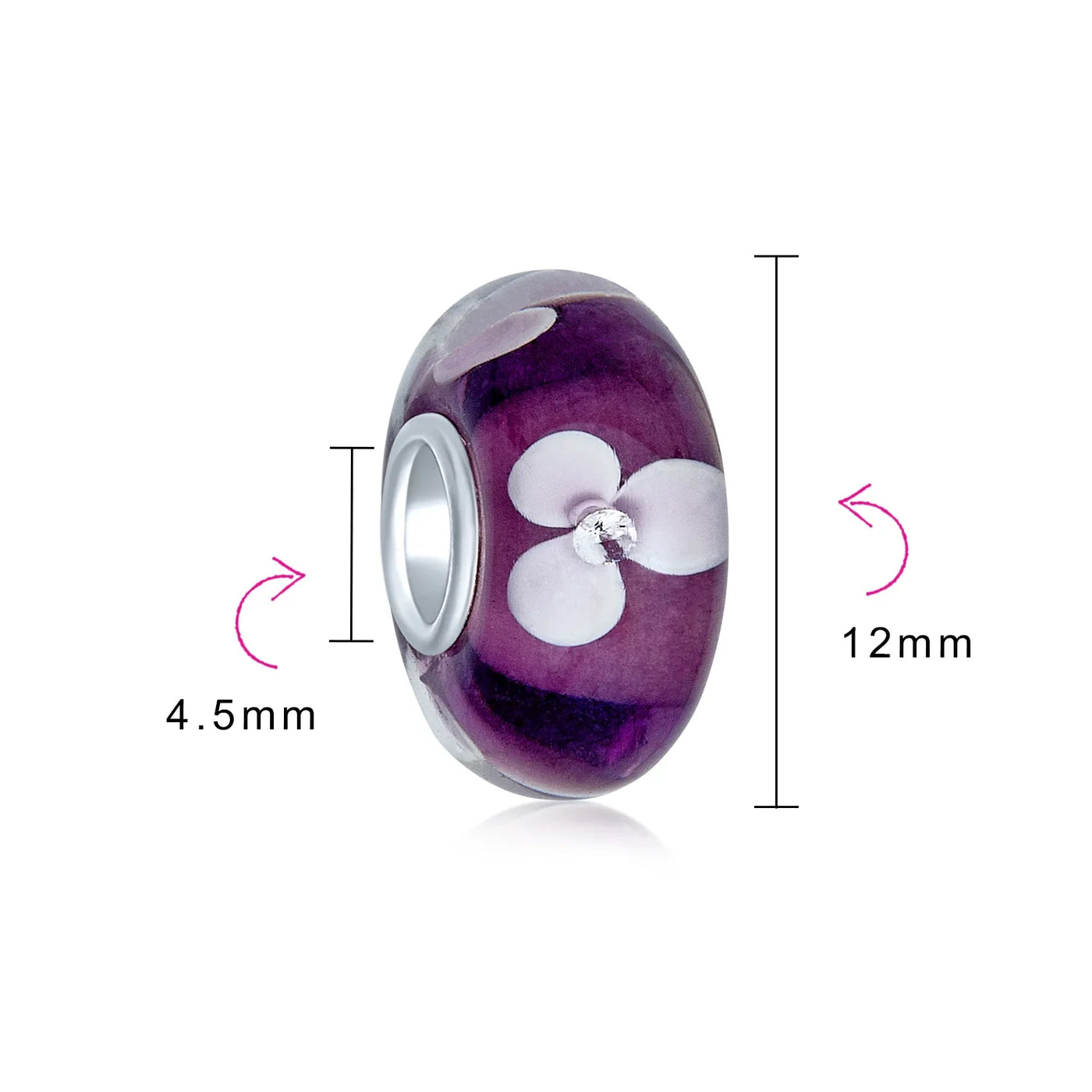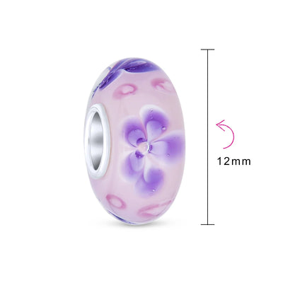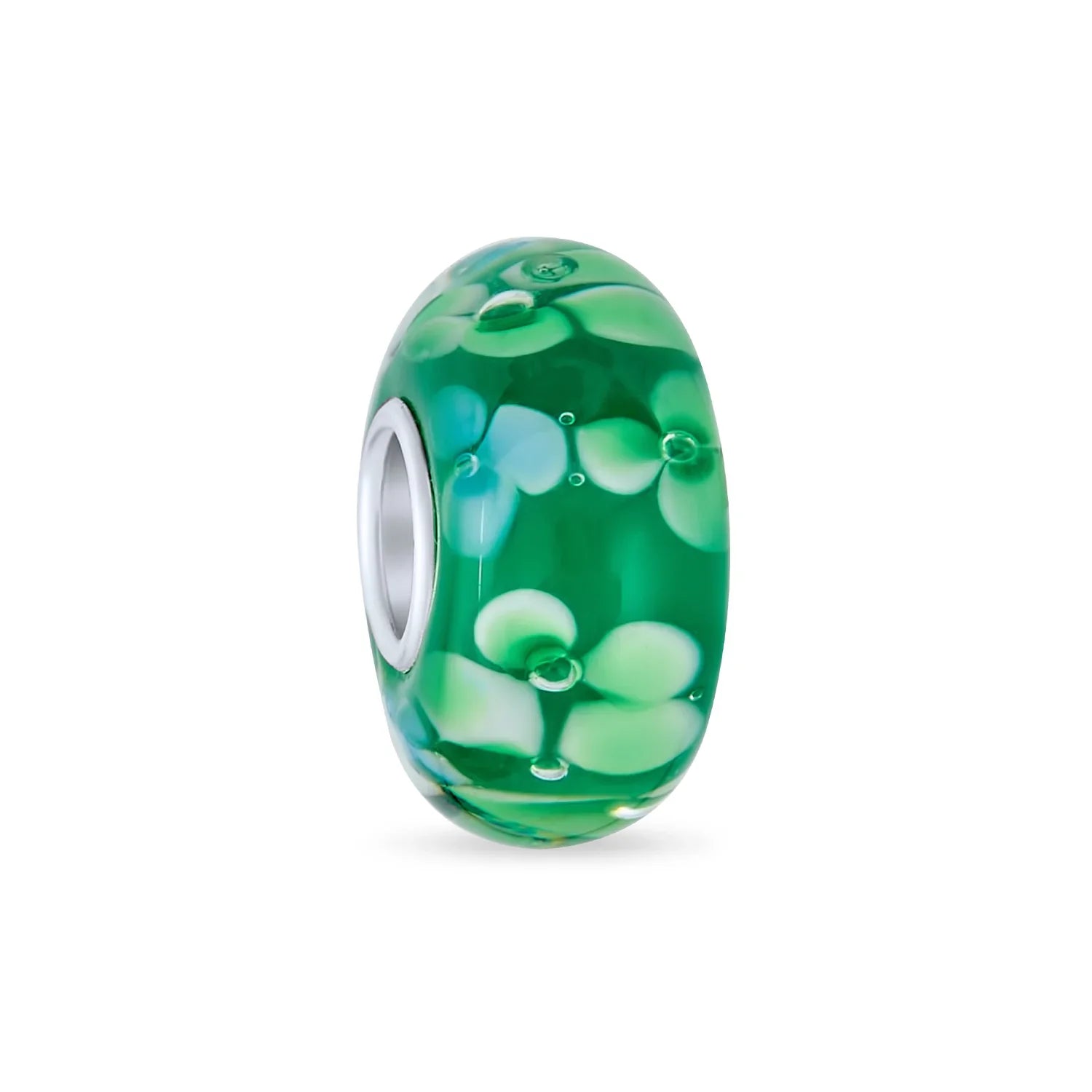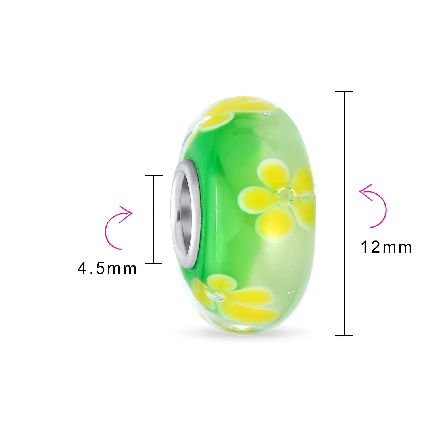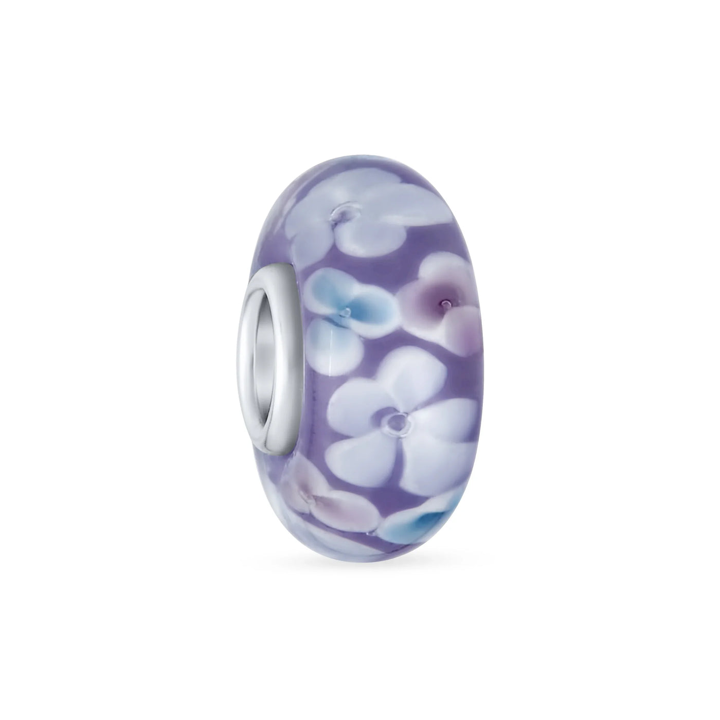 - Beautiful flowers adorn this Murano Glass Bead charm. Compatible with European style charm bracelets, 3mm snake chains, and cords. This stylish flower bead will be the centerpiece of your bracelet, enhancing your favorite charms and beads. Perfect for adding a touch of spring to your look.