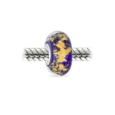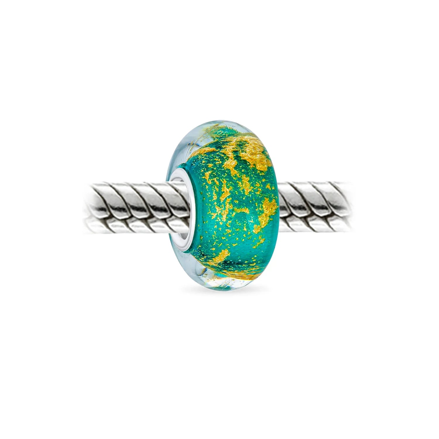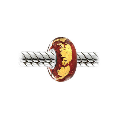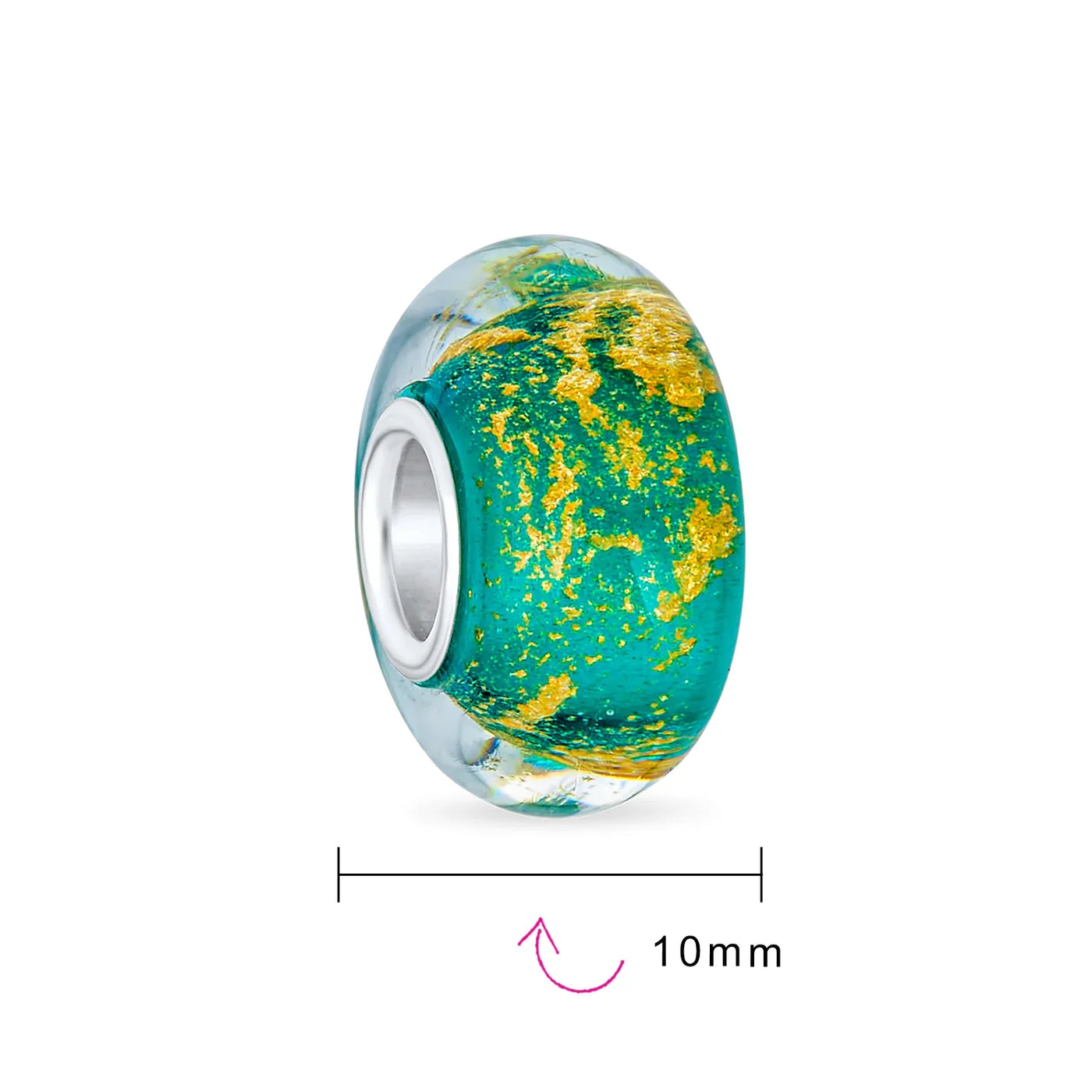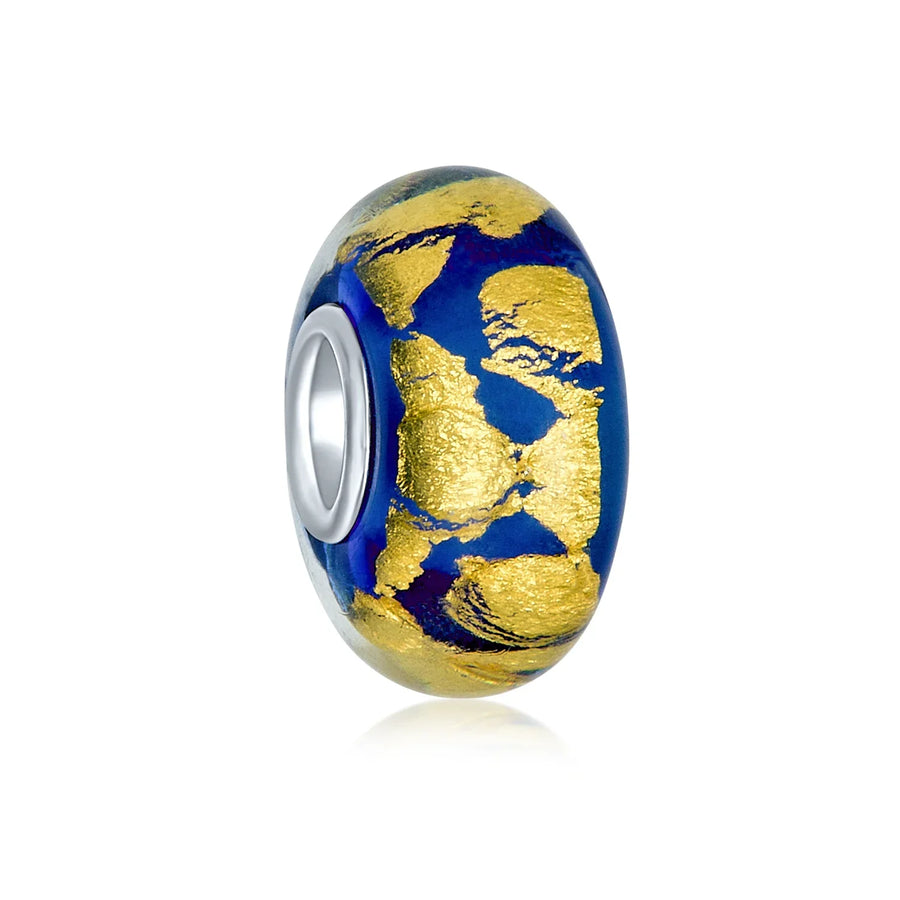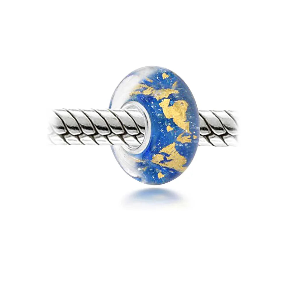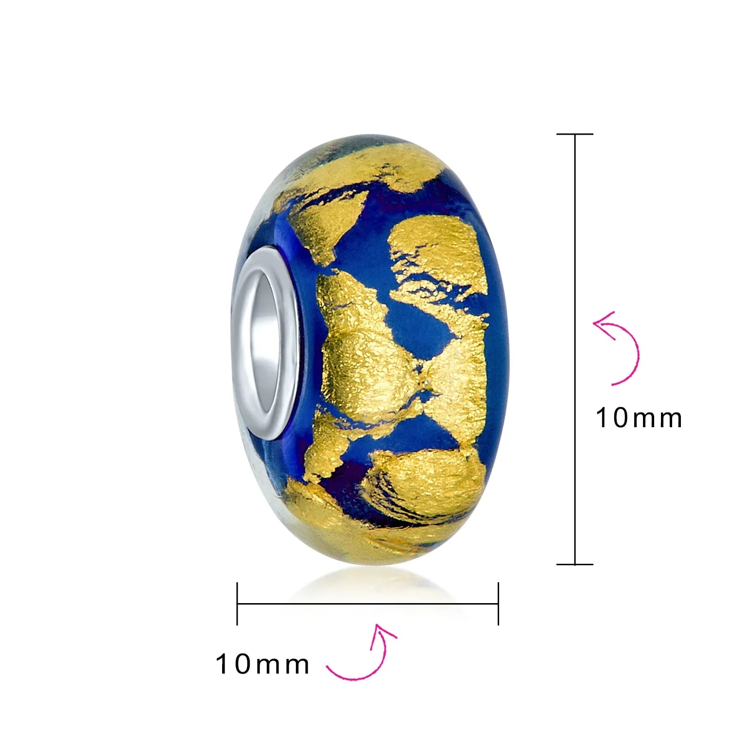 • Gold flaking gives these Murano glass charm beads a luxurious touch. Add sparkle to your charm bracelet elegantly. Featuring a smooth .925 sterling silver core, they fit any 3mm snake chain, cord, or European bead bracelet. Available in purple, green, red, or blue, these beads with gold foil accents will be your new favorite.