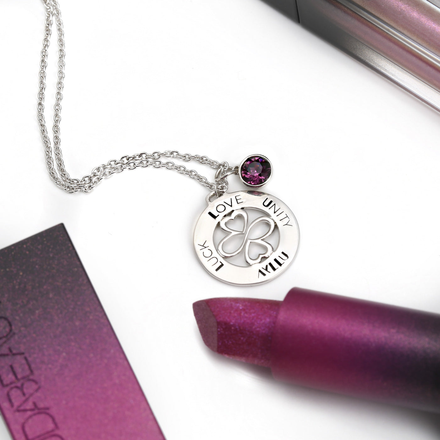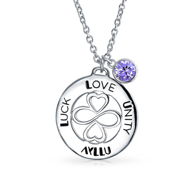 • Elegant crystal charm necklace for 12 birthstone months. Features AYLLU symbol and inspirational words. Sterling silver, handcrafted gift box, and pamphlet included.