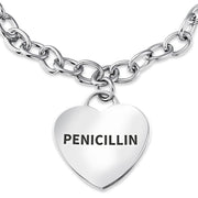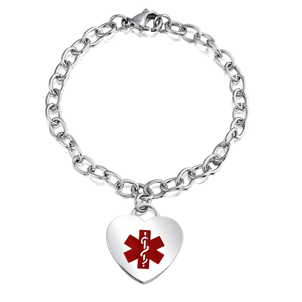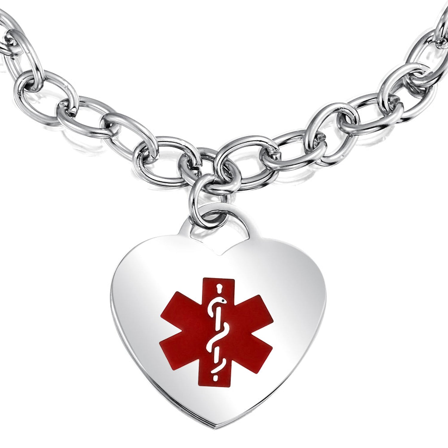 • Show your love with our new Medical jewelry, perfect for those with severe allergies or medical conditions. This stainless steel heart bracelet is not only stylish but can save lives in emergencies. The recognizable medical symbol ensures clear communication when she can't. Pair it with other stainless steel or silver jewelry for a trendy look. Lightweight at 9.3 grams, it fits up to a 7.5-inch wrist and secures with a lobster claw clasp.