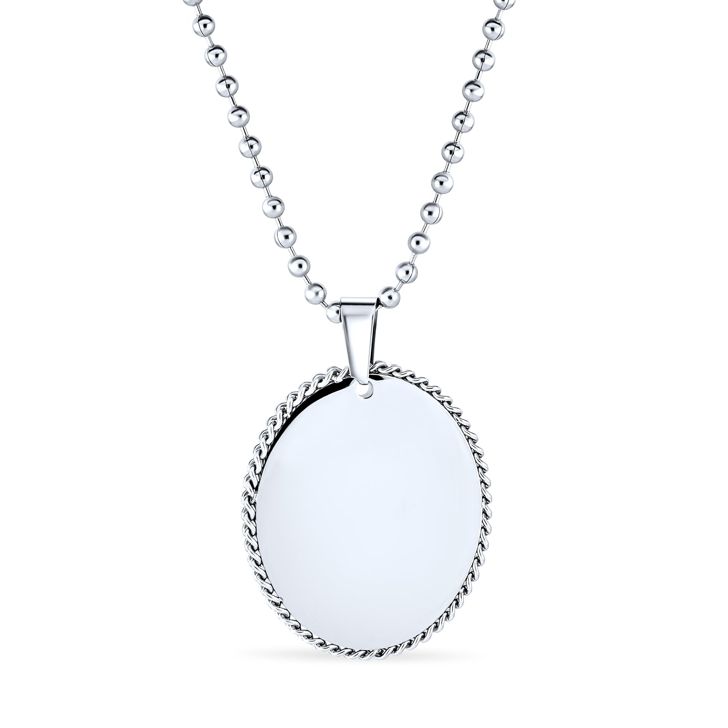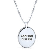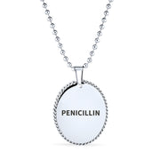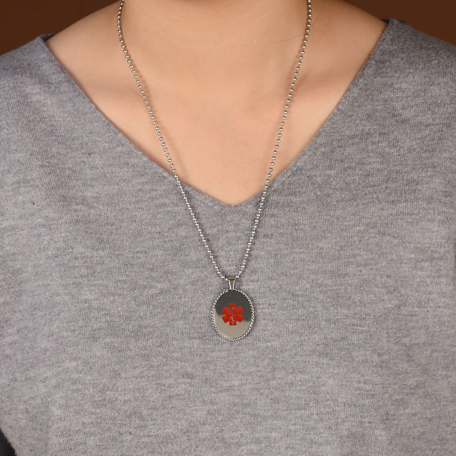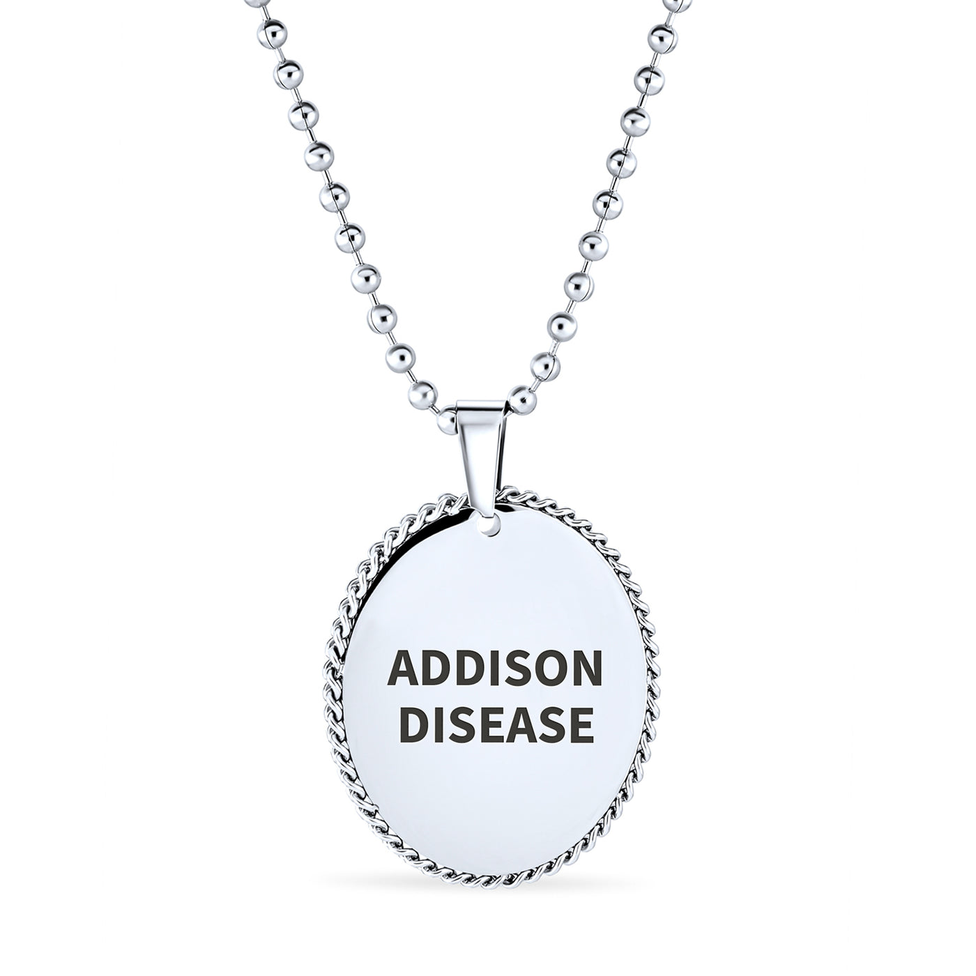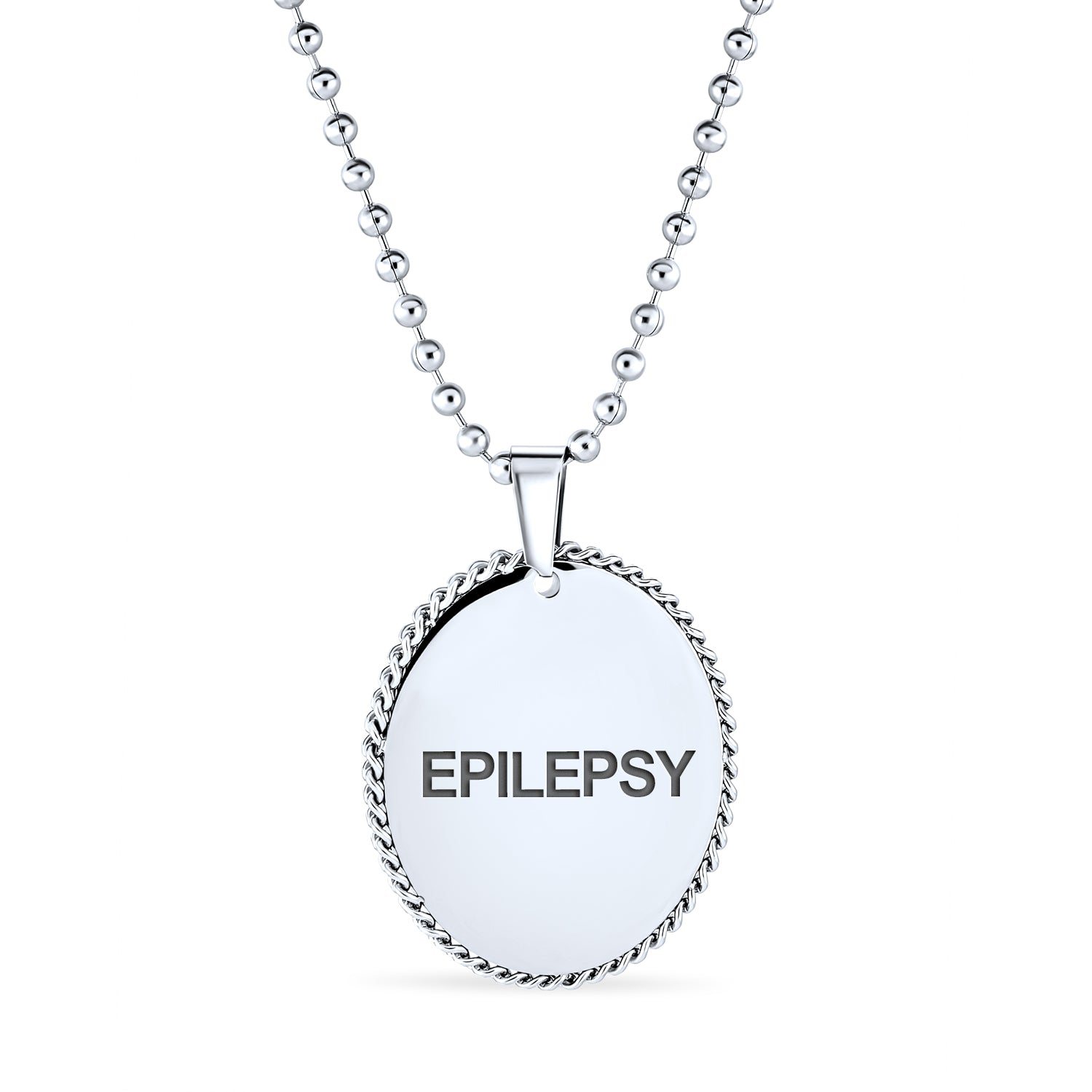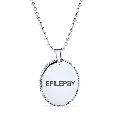 - In a medical emergency, medical ID jewelry is crucial. You might be unable to speak or recall vital information. Our Stainless Steel necklace alerts paramedics, EMTs, or doctors to your medical condition. A medical ID necklace can save lives or prevent misdiagnosis. Our shiny, oval Stainless Steel men's pendant features a plain link chain. The front view shows a scalloped edge. This ID tag jewelry could be your most important Stainless Steel purchase. Order yours today.