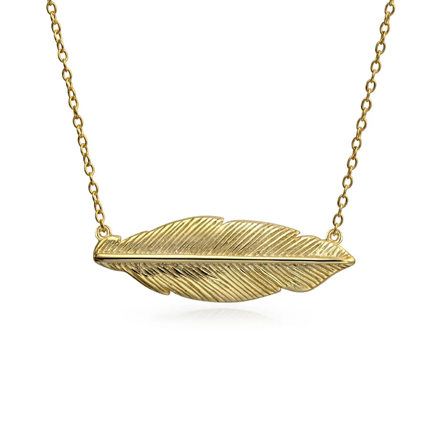 - Even a leaf would fall for this gorgeous gold plated necklace, this sideways leaf adds some natural beauty to your outfit. This delicately designed sideways feather plume pendant necklace is perfect for solo wear or for layering with other pendants.