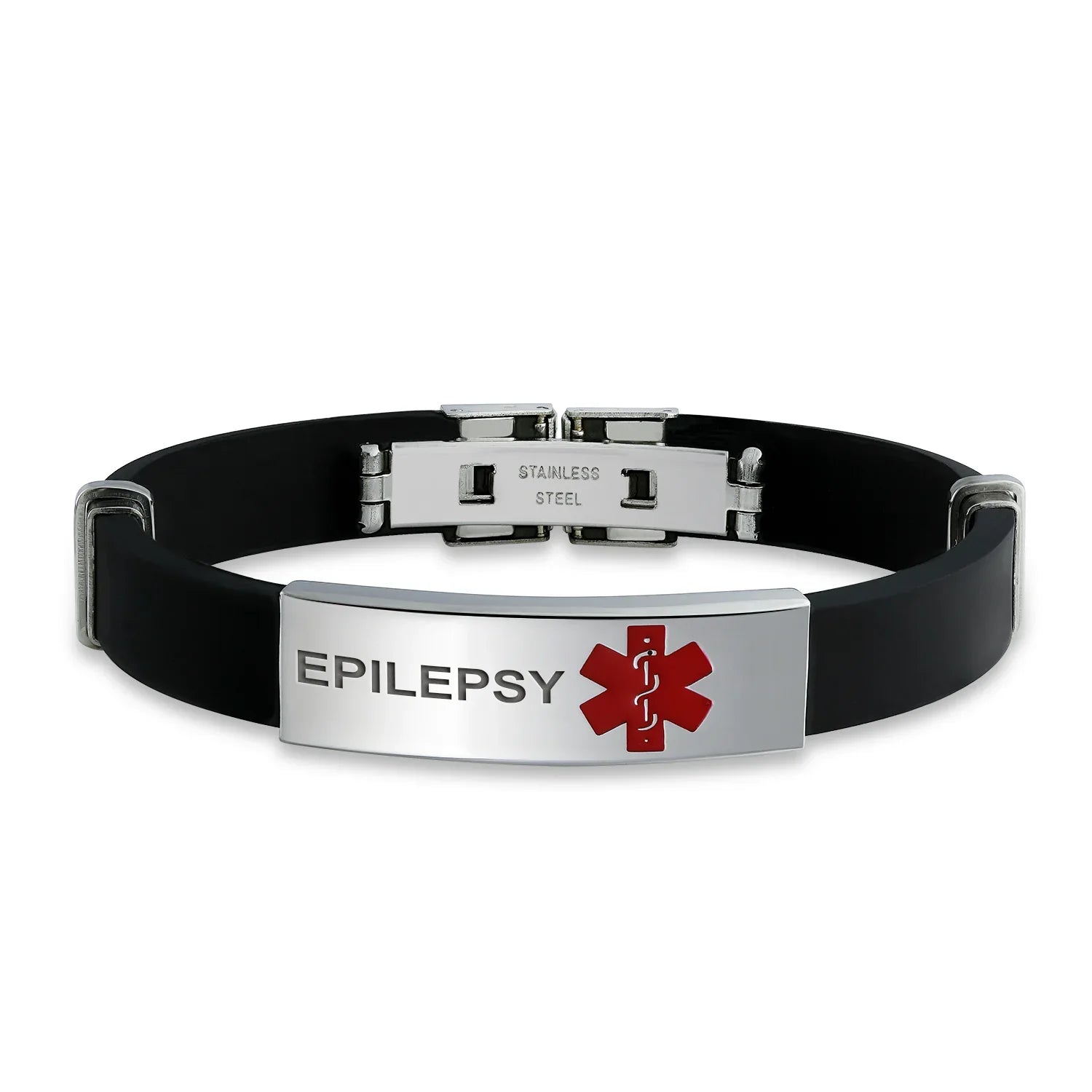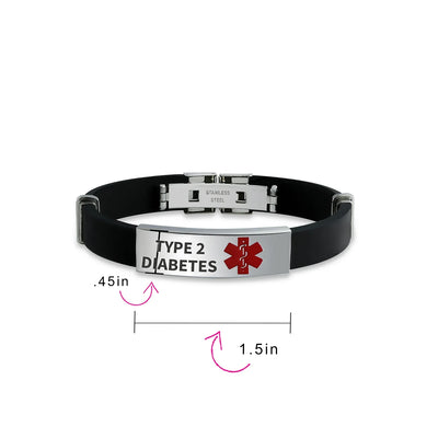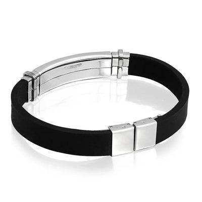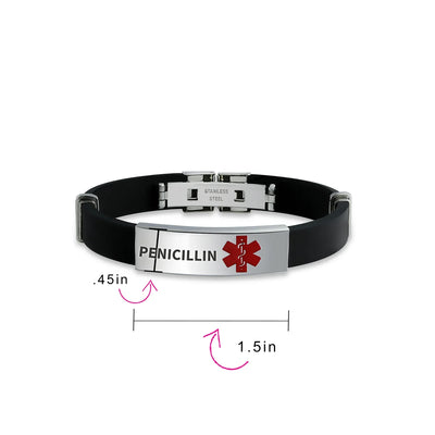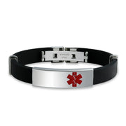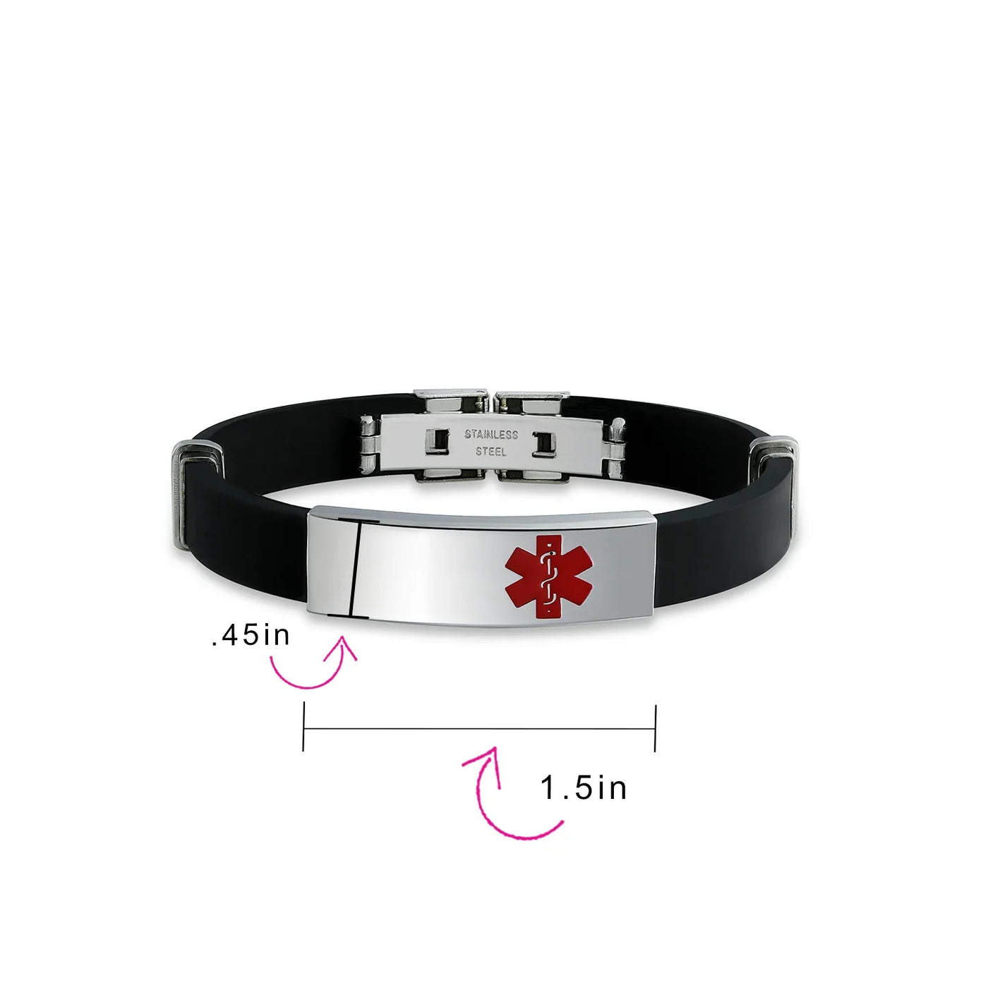 • Our rugged stainless steel and rubber bracelet for men is both practical and stylish. This sleek medical ID tag bracelet is perfect for severe allergies or serious medical conditions. From the boardroom to the beach, stay fashionable and smart with this essential Medical jewelry. Made with stainless steel accents and a comfortable rubber strap, it fits up to an 8.5-inch wrist. The engravable ID bar measures 1.5 inches long and .45 inches wide.