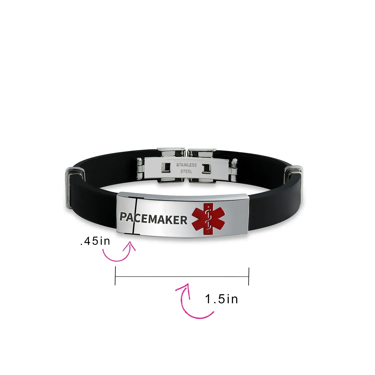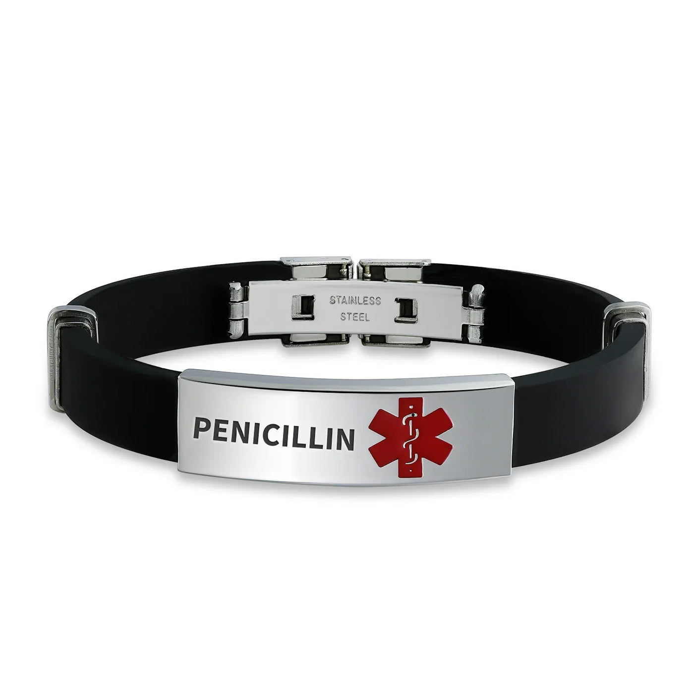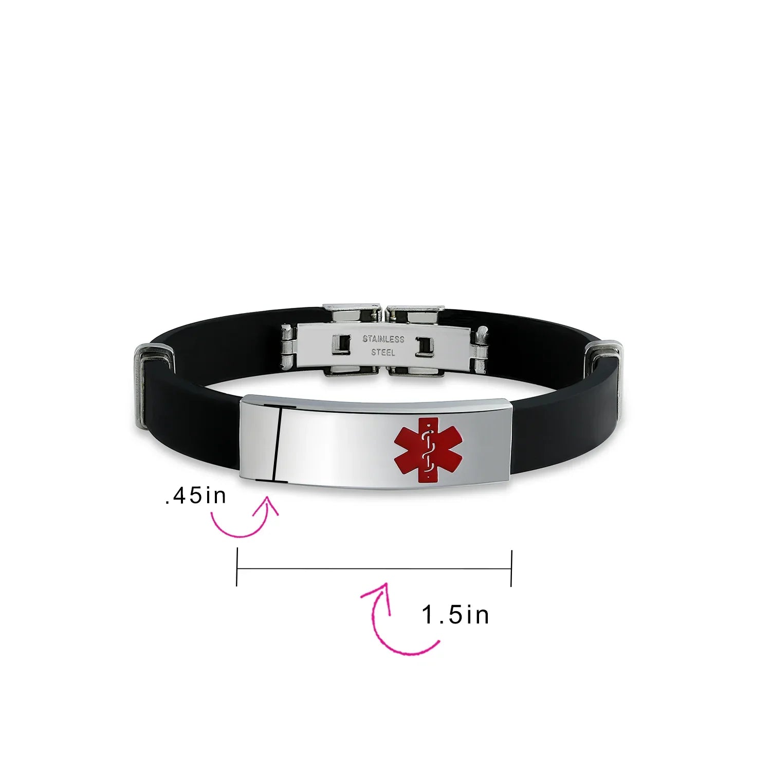 • Fully waterproof silicone rubber with polished stainless steel butterfly clasp and accents Customize it or Pre-graved identify mens bracelet in case of a medical emergency red caduceus the traditional symbol of medical id tag at quick glance.