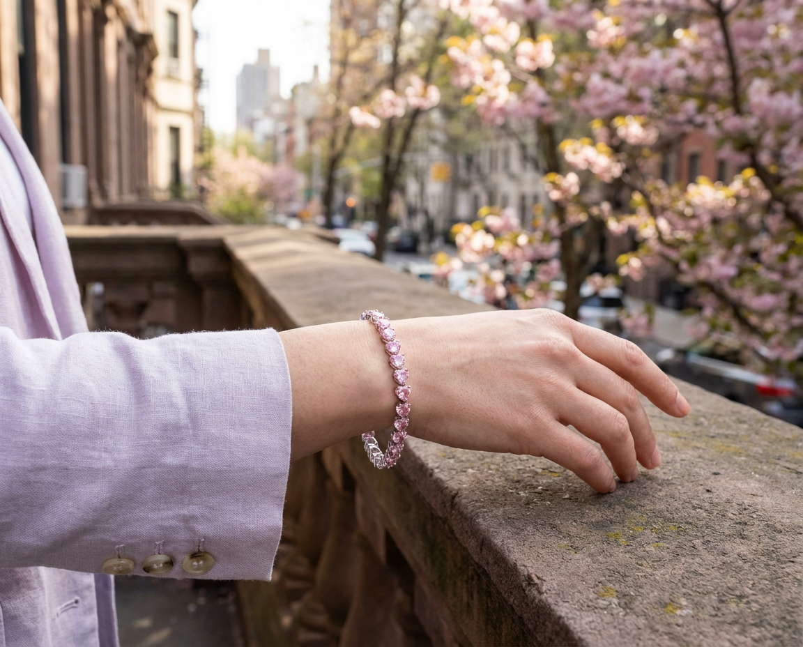 Romantic Classic Hearts Shape Pink CZ Tennis Bracelet Silver Plated Rhodium 7 Inch