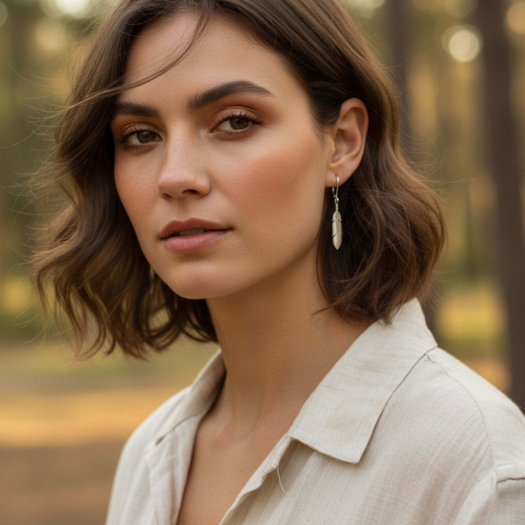 - Embrace your inner hippie with these detailed feather design sterling silver earrings. Be one with nature and stay stylish. Our feather earrings have a subtle shine and hang two inches long for an understated look. Perfect for pairing with long flowy skirts and hemp necklaces. Ideal for music festivals or laid-back jam sessions. Not a hippie? These sterling silver dangle earrings make perfect birthday gifts. Spread love with this feather jewelry, man.