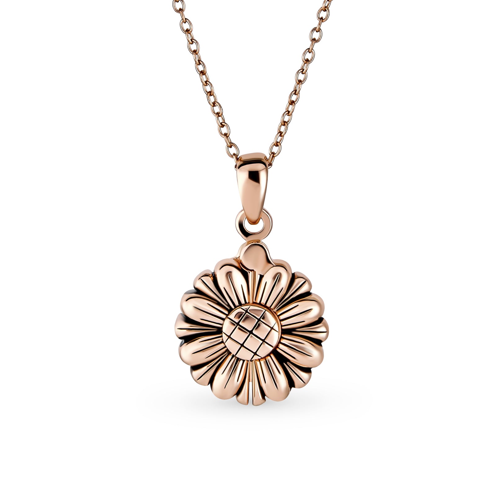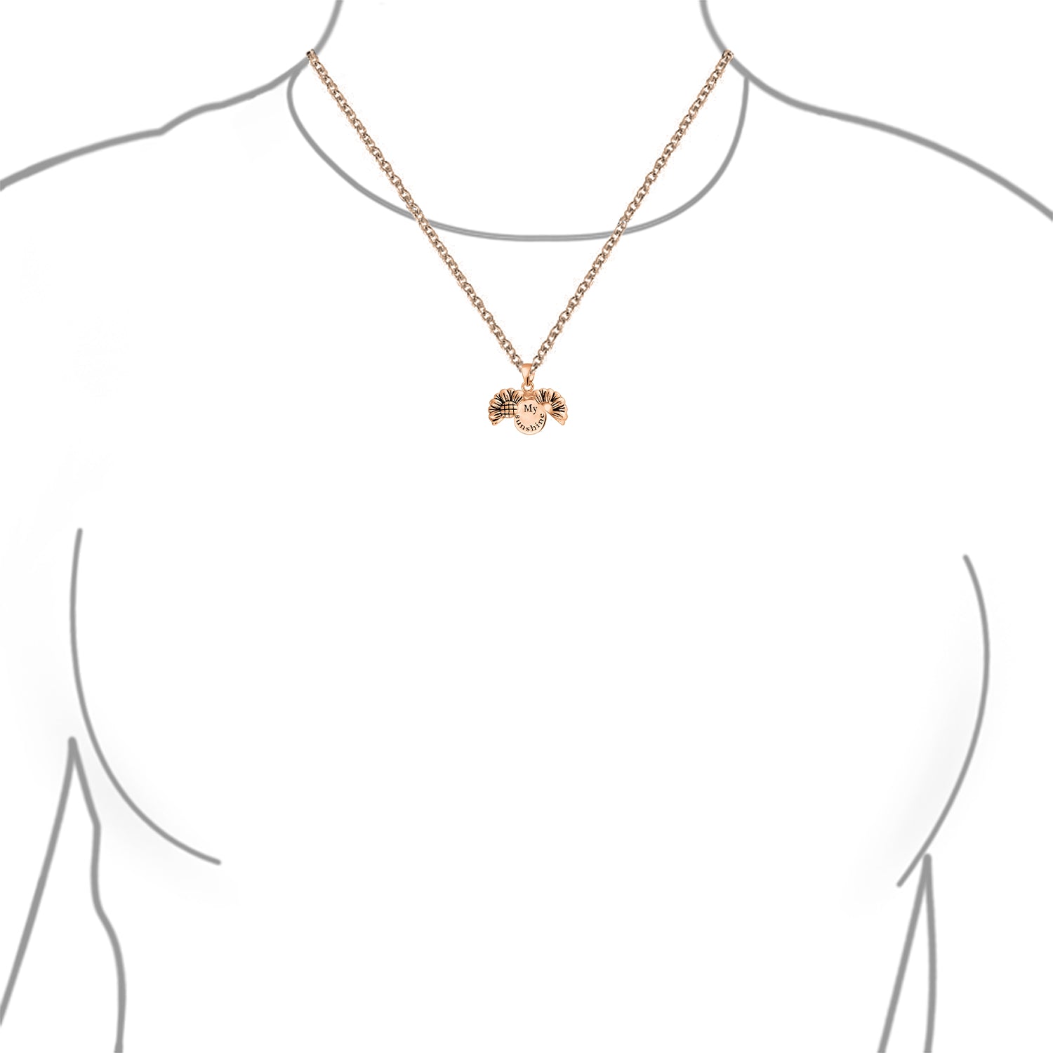 - Flower pendants make stunning gifts for women who adore floral jewelry. Crafted from Rose Gold Plated .925 Sterling Silver, this delicate piece showcases a sunflower design. The sunflower opens to reveal an oval pendant inscribed with "My Sunshine." Oxidized silver accents highlight the sunflower's center and petals, creating bold black lines. This .925 Sterling Silver necklace is perfect for any woman you consider your sunshine. Wear it as a closed flower pendant or an open sunshine pendant. Ideal for both formal and informal events, this charming piece is a must-have. Add this flower charm to your collection or gift it to the sunshines in your life.