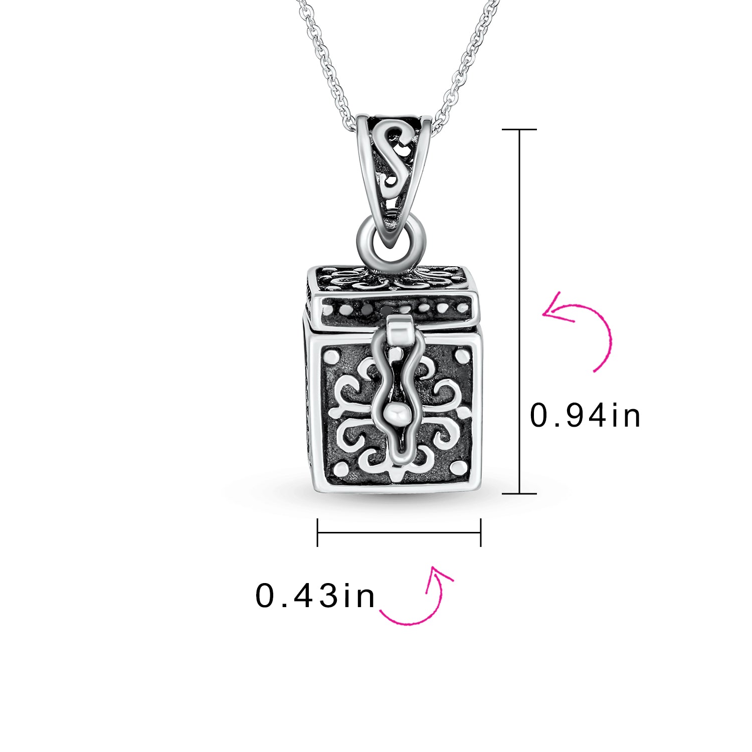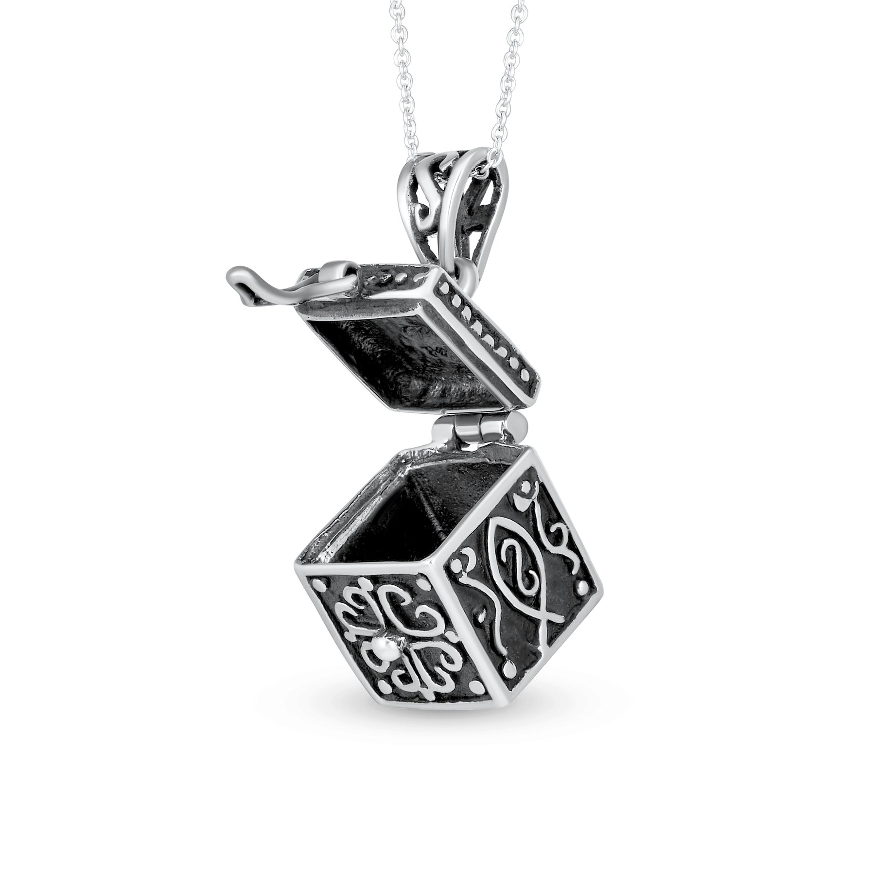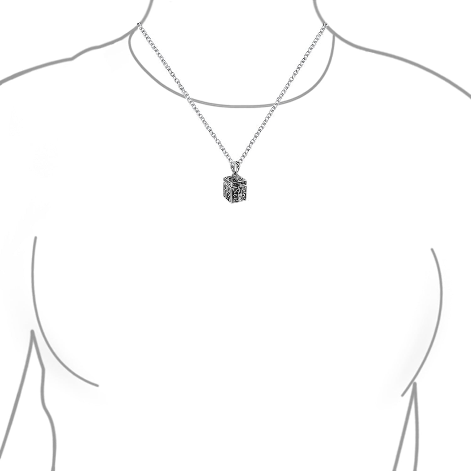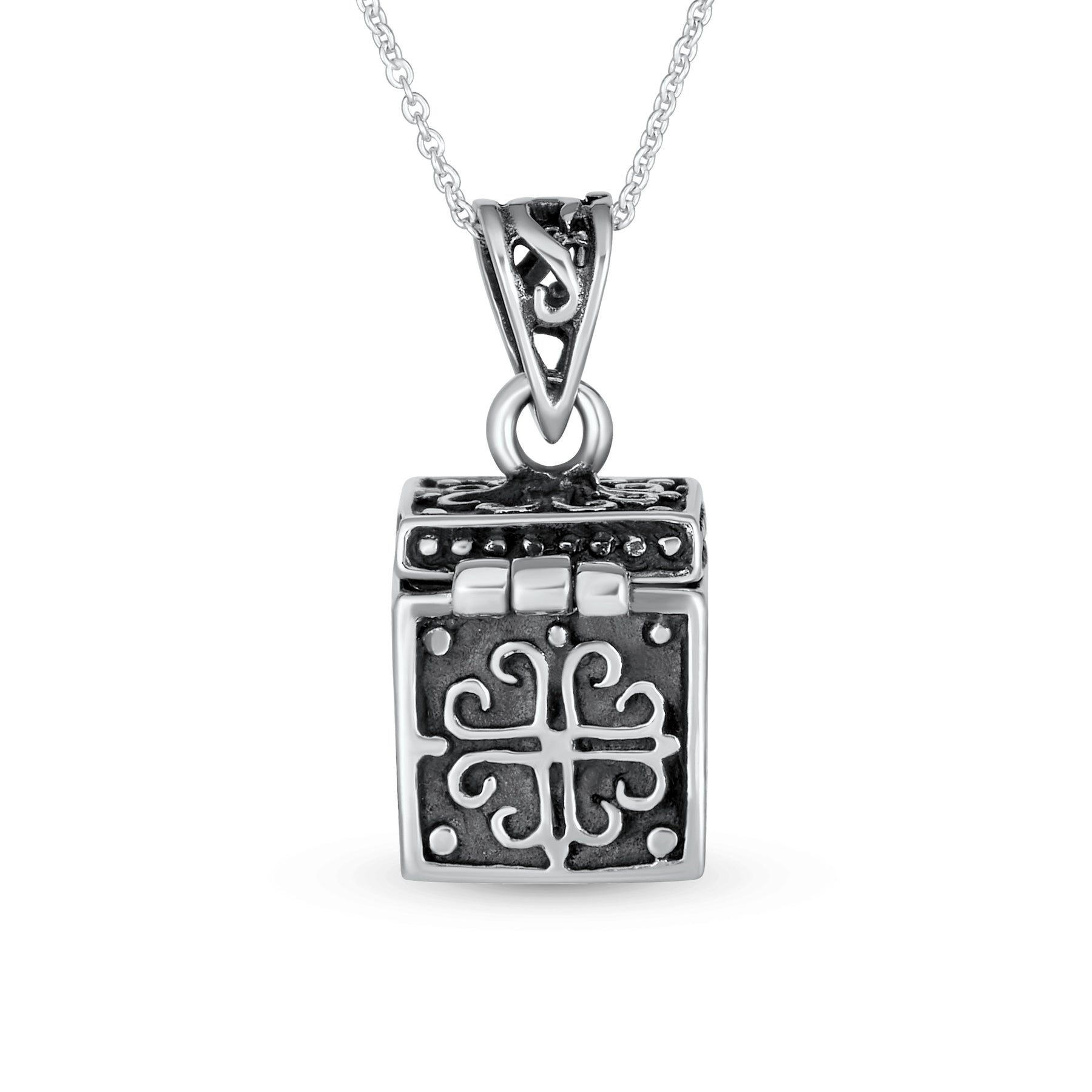 - Introducing our .925 Silver Antique Style Poison Prayer Box Cross Locket Pendant, a captivating and mysterious piece of jewelry. This exquisite treasure box measures less than one inch square, perfect for your cherished mementos. Prayer boxes have been cherished for centuries, and our pendant is no exception. Its highly inspirational and personal nature makes it a beautiful and exotic locket. The intricate design features an ornate cross and fish, adding Celtic charm to this enchanting piece. Not only is this pendant a stunning accessory, but it also holds sentimental value. Many close friends and family members wear matching prayer box necklaces, symbolizing their bond and shared beliefs. Surprise your loved ones with this meaningful gift. Purchase a supply of jewelry box necklaces today and show them how special they are. Whether for a birthday, anniversary, or just because, this pendant makes a lasting impression.