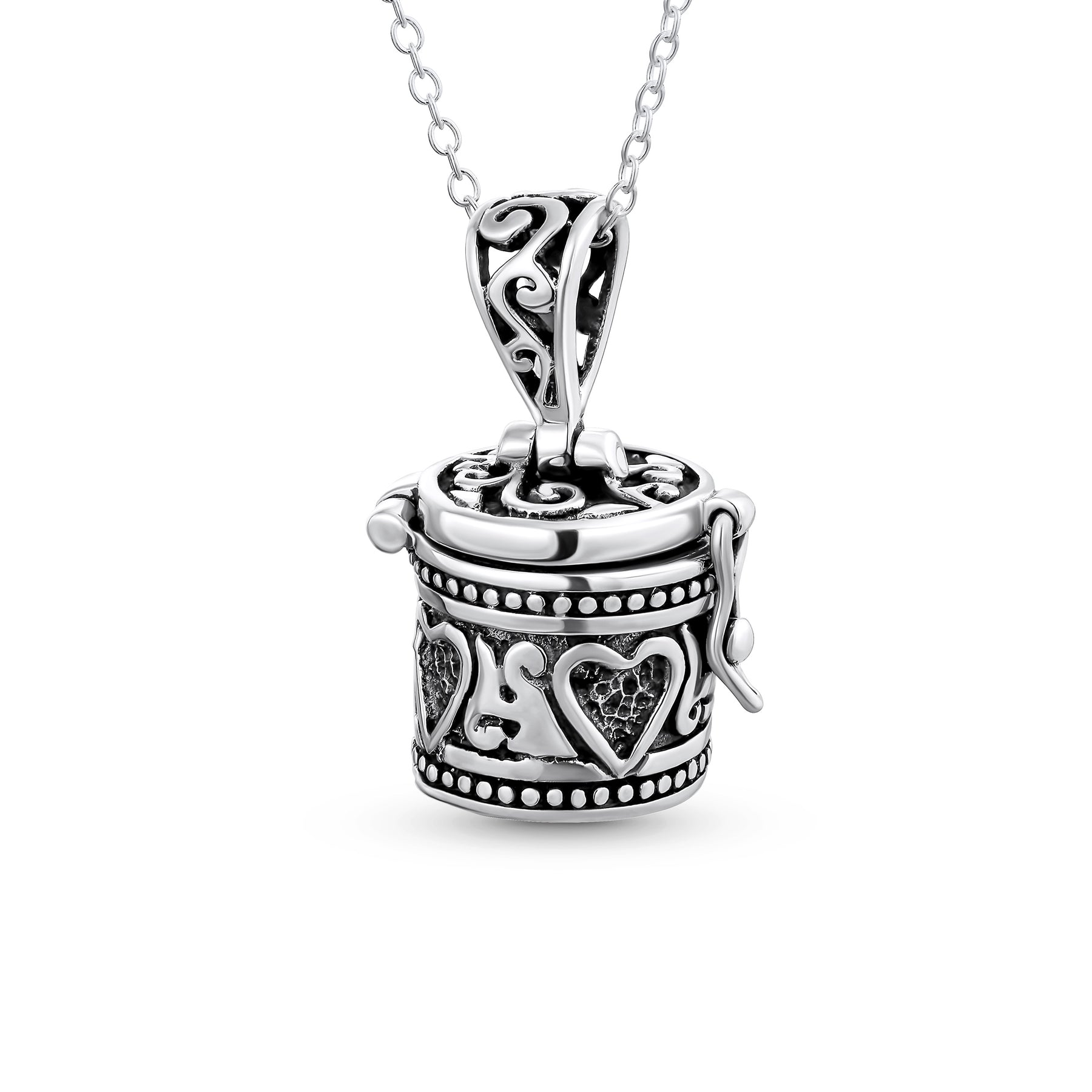 - Discover our exquisite .925 Silver Round Antique Style Poison Prayer Box Locket Pendant. This stunning silver locket will captivate your senses. Crafted from high-quality .925 Sterling Silver, it features an engraved heart clover design. This Celtic-inspired jewelry piece adds an elegant, intricate touch. Unlock the lid to enclose a meaningful memento. Prayer boxes symbolize inspiration and personal connection across cultures. Includes an 18 Inch Rolo Chain for easy wear. Perfect as a heartfelt gift or personal keepsake. Surprise your loved ones with this timeless treasure. Order today and embrace the magic of this unique accessory.