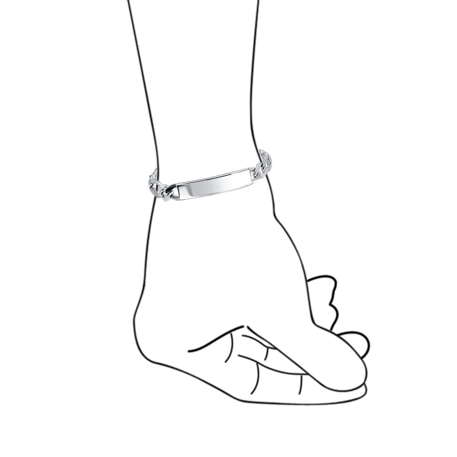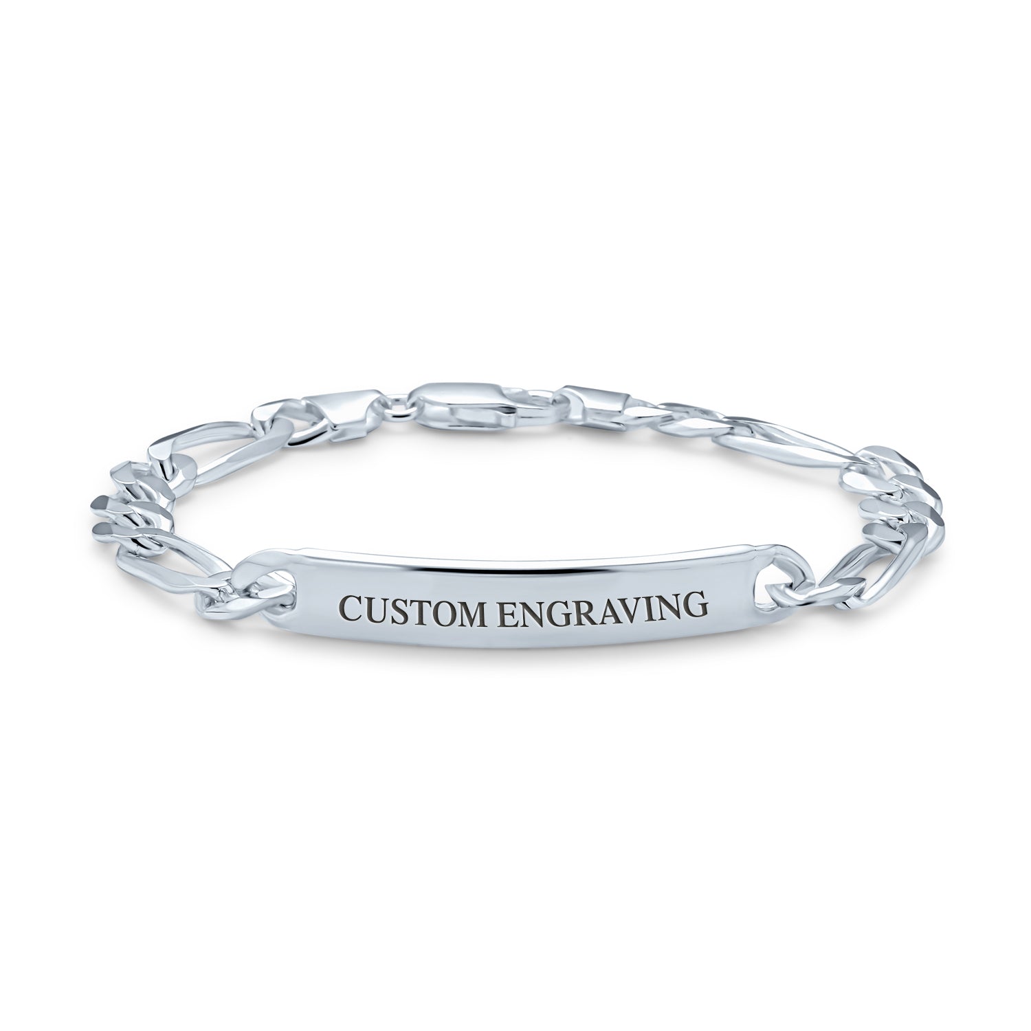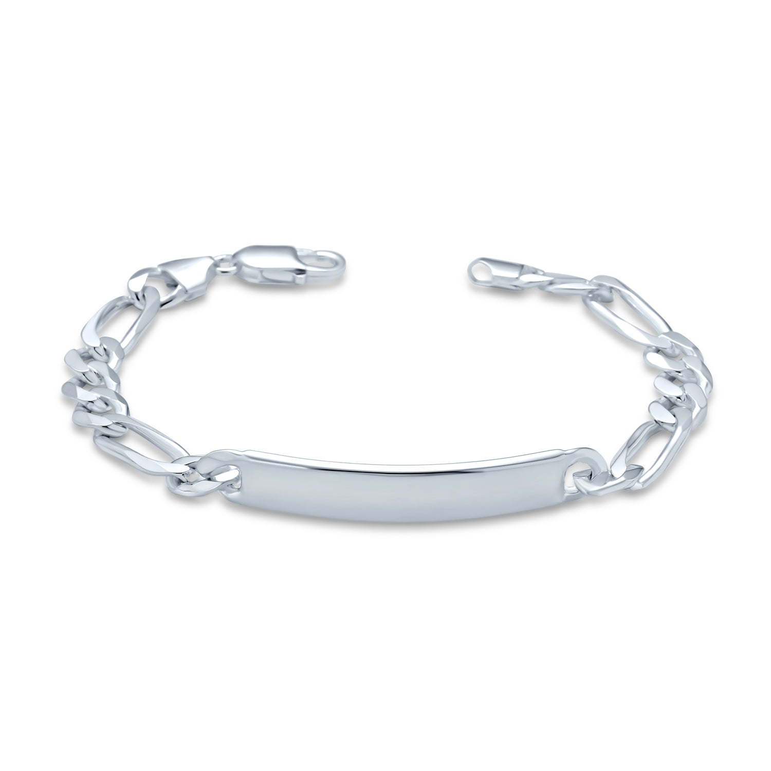 • Elevate your style with our sterling silver Figaro link chain bracelet. This unisex jewelry piece is trendy and essential. The Figaro chain's unique pattern adds sophistication. Personalize the sleek ID bar with initials or a special date. The secure lobster claw clasp ensures durability. Upgrade your jewelry collection with this modern ID bracelet. Don't miss this versatile and fashionable accessory.