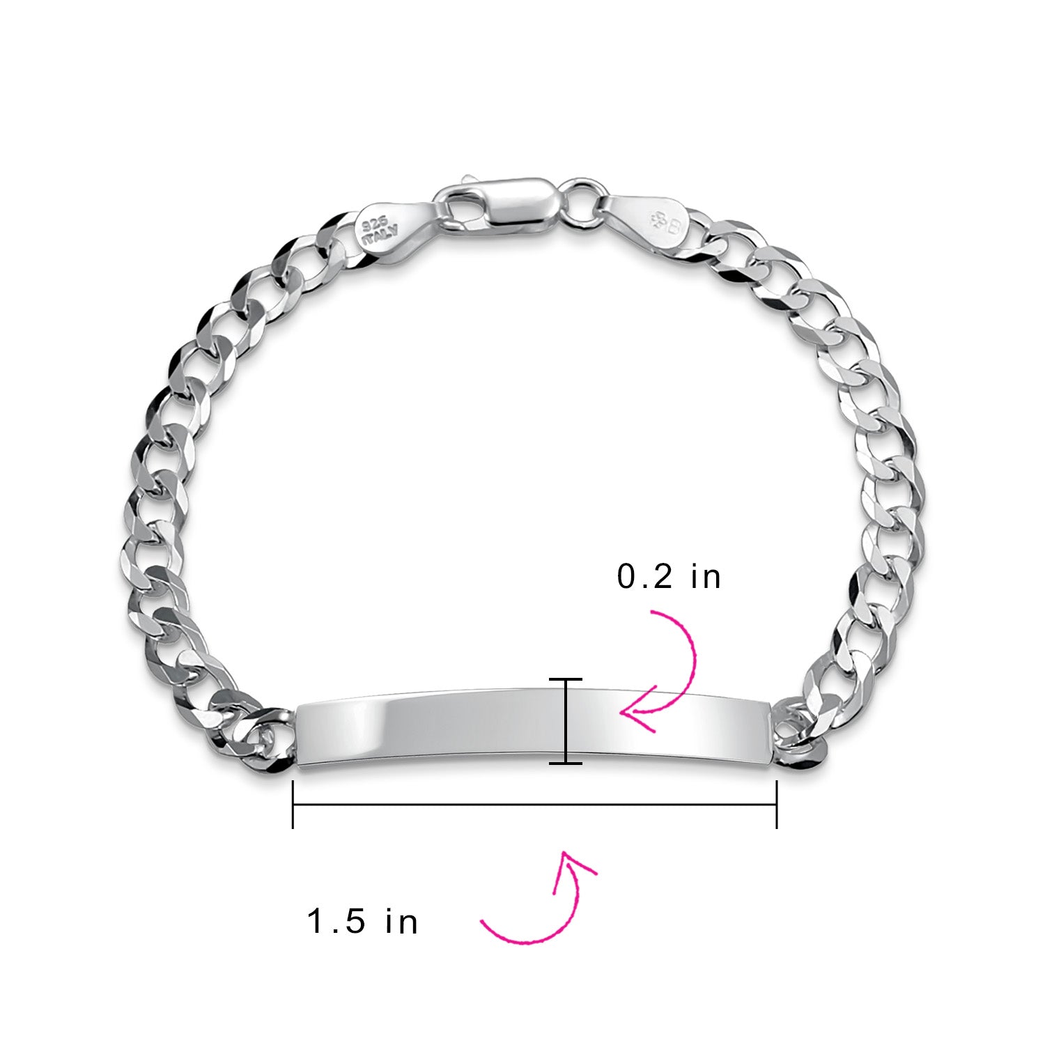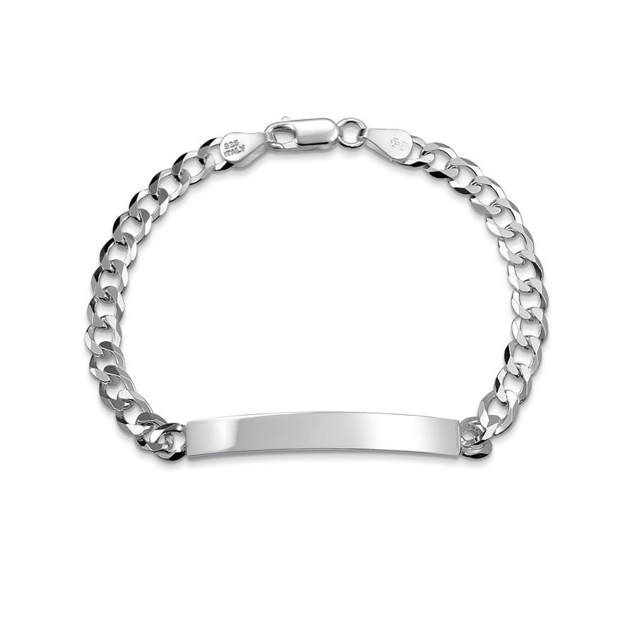 - Enhance your style with this elegantly sophisticated unisex identification bracelet. Crafted with a gleaming 180 gauge Cuban chain, this bracelet features a rectangular name ID tag at the center, adding a touch of personalization. Made from lustrous 925 sterling silver, it is a timeless piece that will beautifully complement any ensemble.