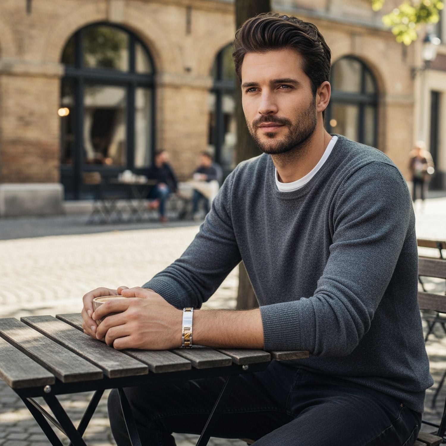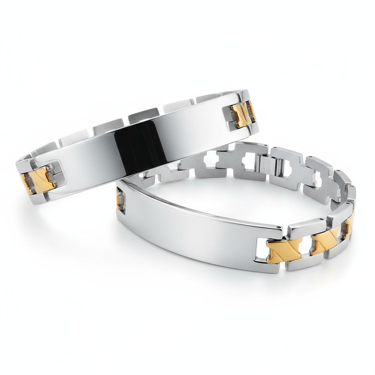 - If your guy loves stylish accessories, our two-toned stainless steel ID bracelet is the perfect gift. Surprise your dad, husband, or son with this stunning stainless steel jewelry piece. Featuring gold-plated crossover links, this masculine bracelet looks great at work or play. The men's stainless steel bracelet secures with a fold-over clasp for a perfect fit. Personalize it with his name, a date, or a nickname for a unique touch.