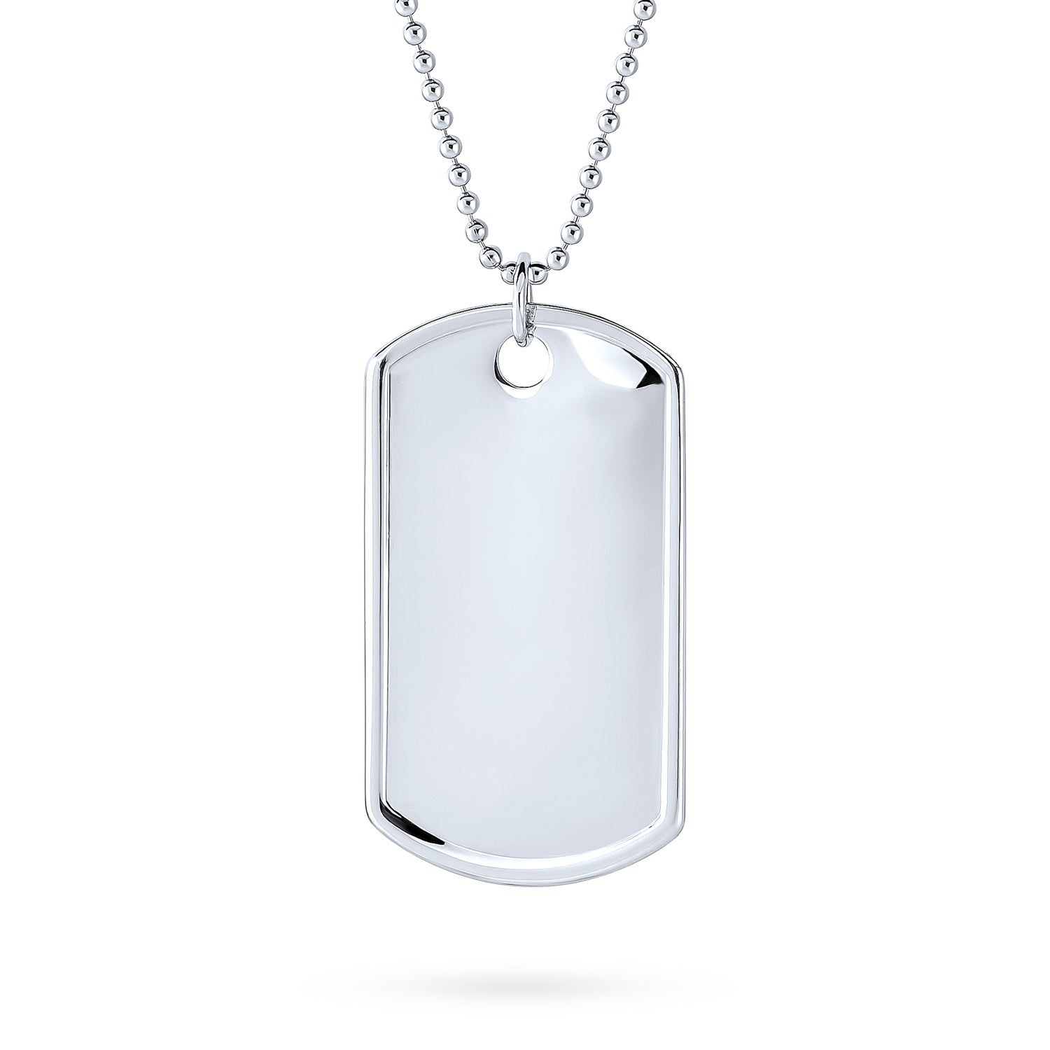 - This classic full size very big polished shinny silver mens ID dog tag is perfect for customizing. Hanging from a ball-chain, this simple dog has raised edges for a more complete, sophisticated look for your wardrobe.