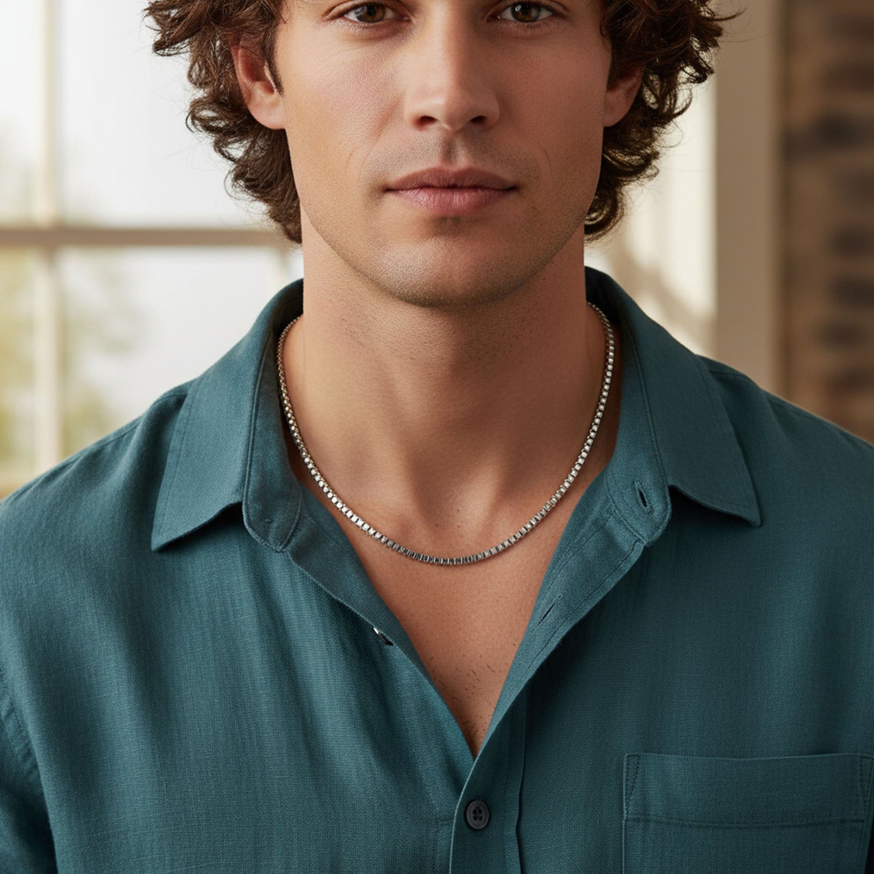 - Introducing our glamorous necklace, crafted with premium .925 Sterling Silver. This exquisite piece features a stunning Venetian link design. The high-shine box link is meticulously polished, creating a mesmerizing mirrored surface. Add a touch of elegance to any outfit. A must-have addition to your jewelry collection. This alluring Venetian style necklace pairs perfectly with any dress or gown. Complete the look with our matching bracelet. Invest in our Cubic Zirconia .925 Sterling Silver Venetian box link Necklace today. Enjoy its timeless beauty for years to come.