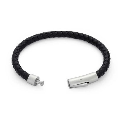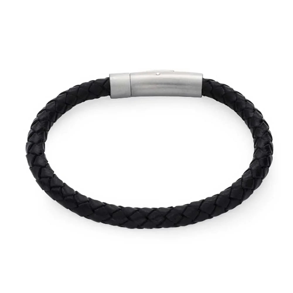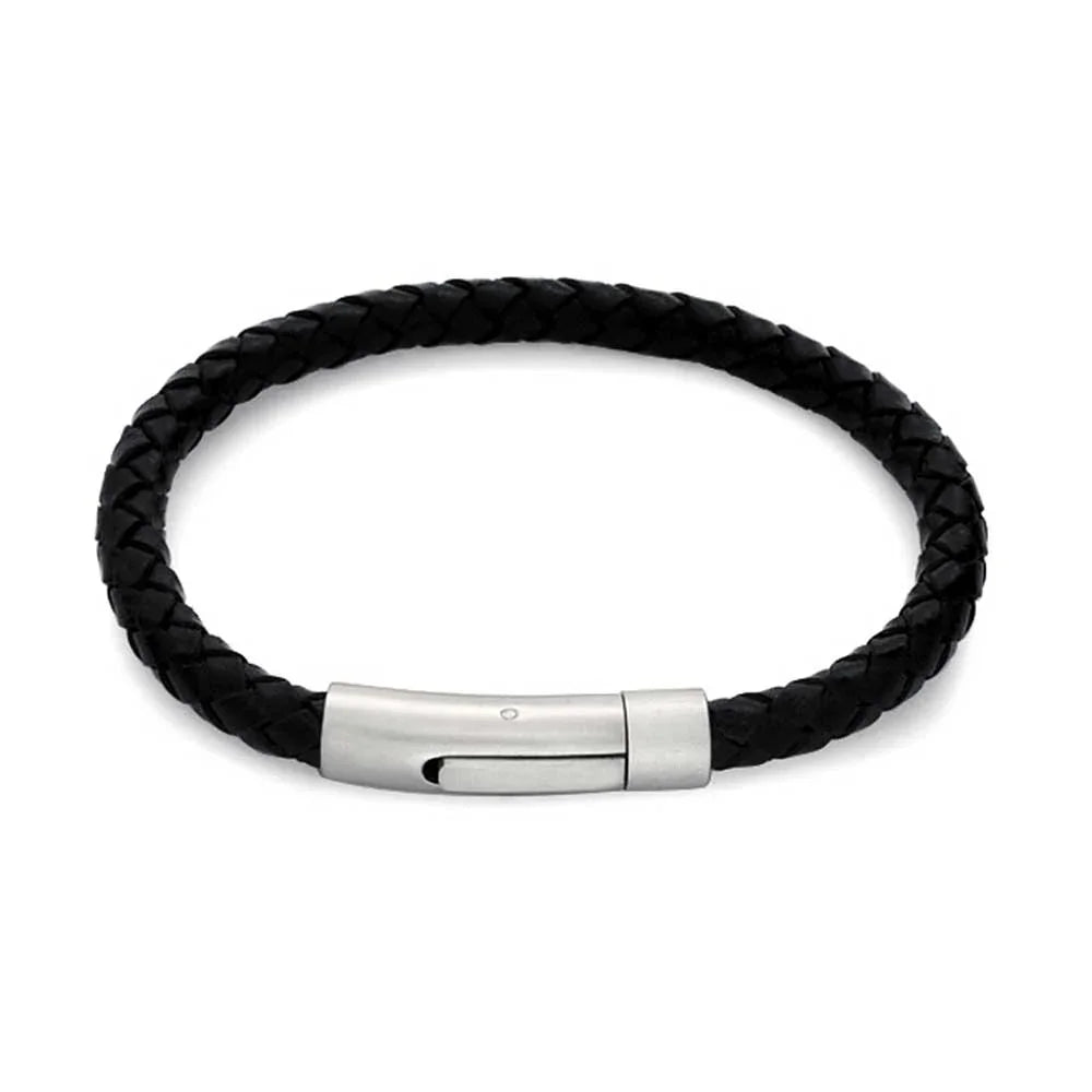 - Unisex braided black leather bracelet for men and women. Made with superb, pliable black leather. Secured with a smooth stainless steel push button clasp. Dangerously attractive and stylish. Perfect unisex jewelry for any occasion. Elevate your wardrobe with this cool accessory. Get your sexy braided black leather bracelet today.