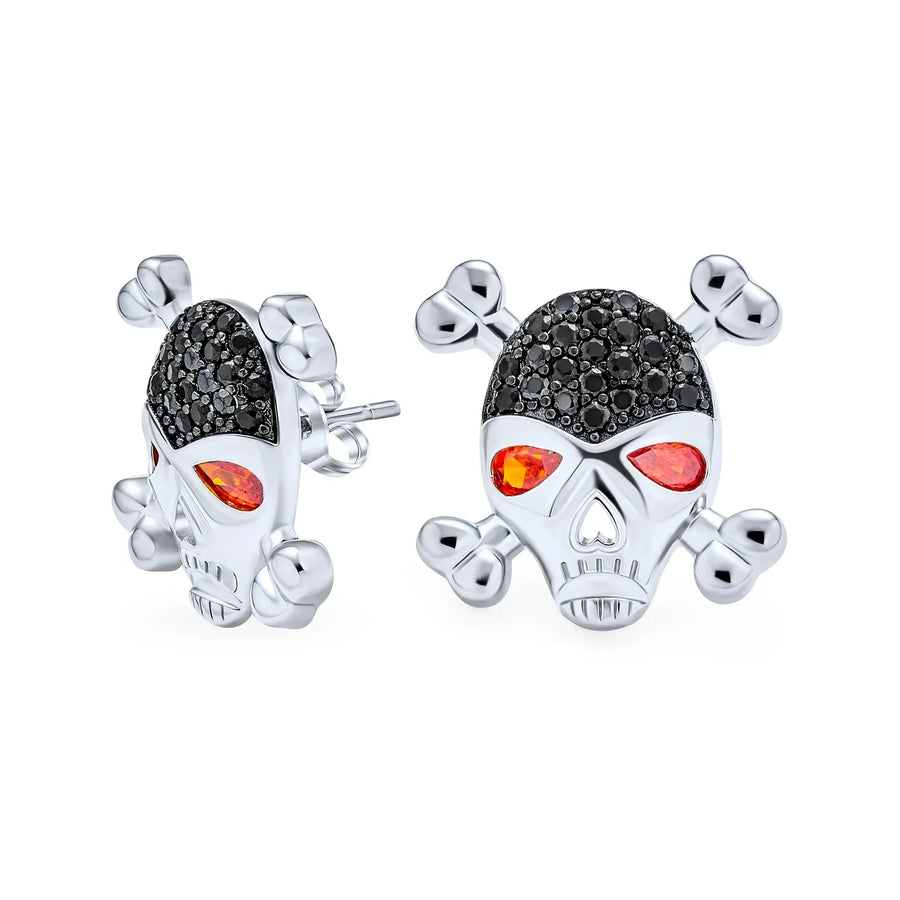 Unisex Dia De Los Muertos CZ Stud Earrings Skull Crossbones Red Eye Silver Brass